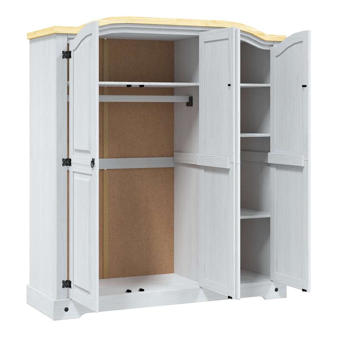 Cette garde-robe en bois de haute qualité est un meuble dans le style mexicain « Corona ». Le pin ciré avec des détails en métal noir dégage un charme mexicain rustique qui fera de la garde-robe un excellent supplément à votre chambre à coucher ou vestiaire. La garde-robe possède un magnifique design de dessus en forme de dôme et 3 portes. L’armoire solide et robuste est fabriquée à partir de bois de pin massif. Le grand compartiment à gauche est doté d'une étagère supérieure et d'une barre de penderie et offre beaucoup d'espace pour ranger vos vêtements. Le compartiment à droite comprend quatre étagères idéales pour ranger sous-vêtements, chaussettes, etc. L'assemblage est facile.