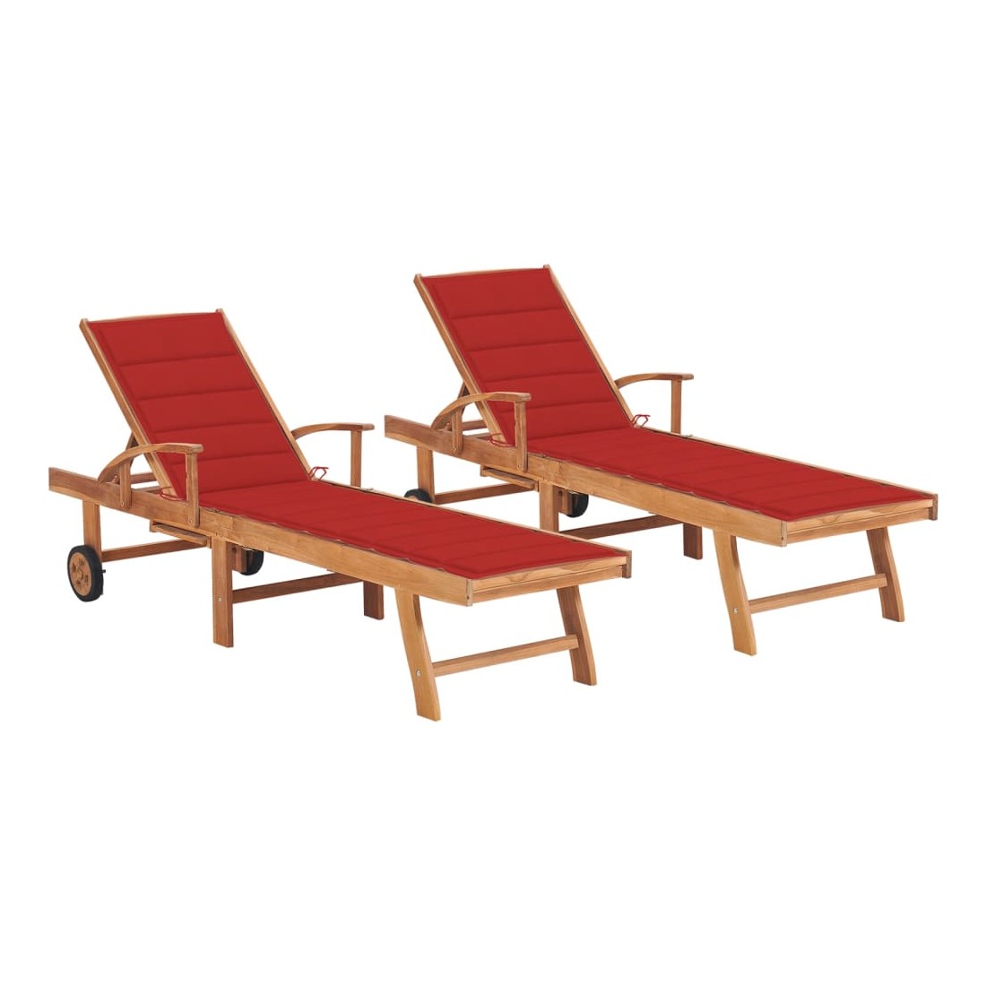 Chaises longues lot de 2 avec coussin rouge Bois de teck solide