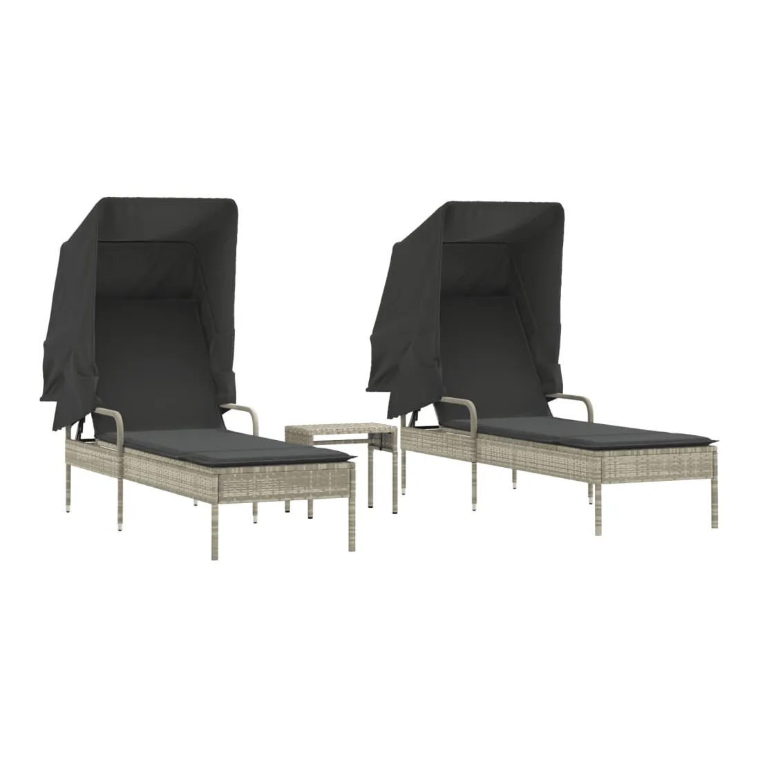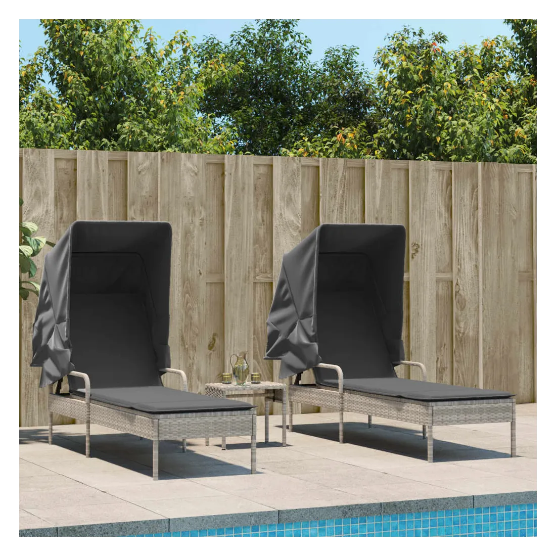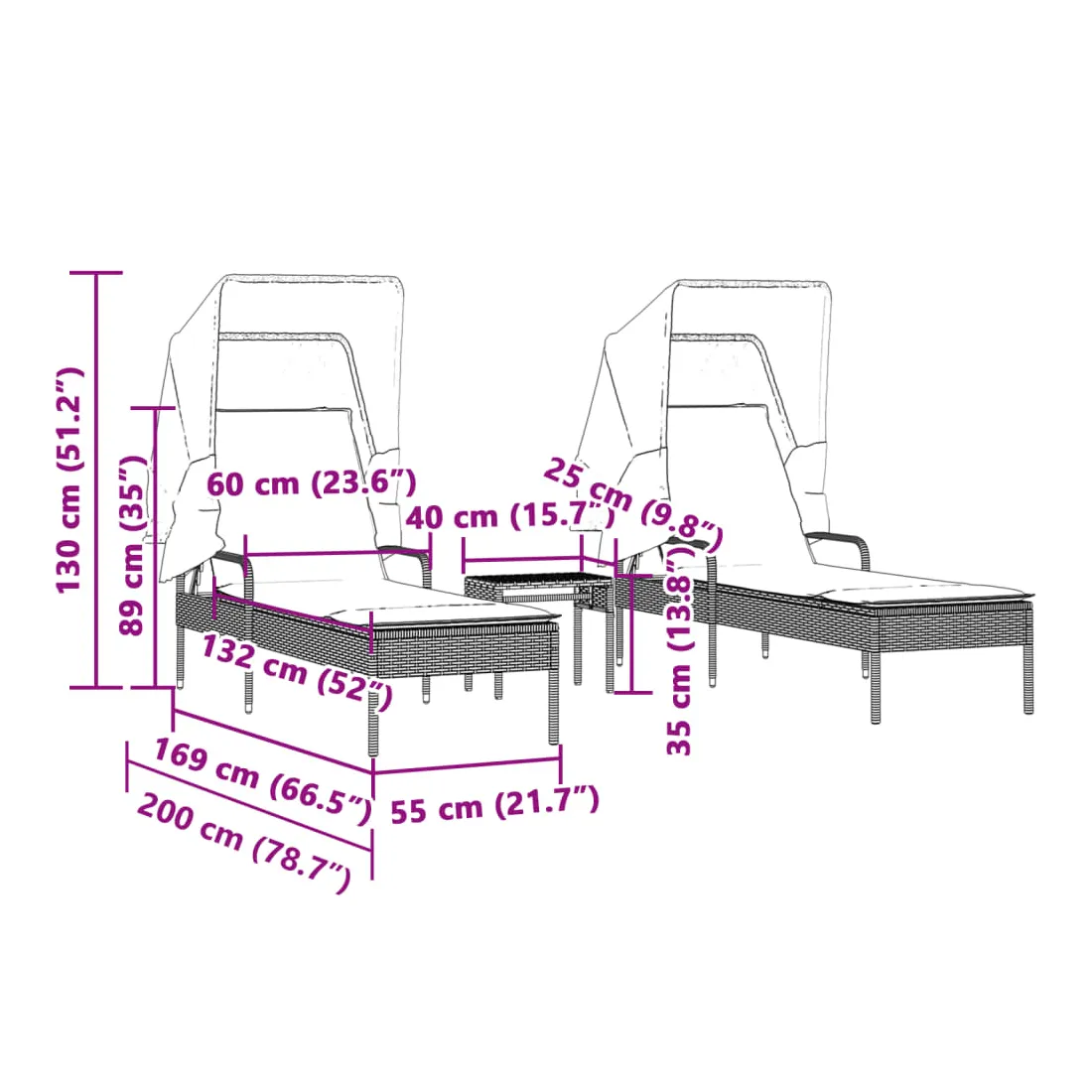 Détendez-vous et profitez du plein air avec ces chaises longues confortables ! Matériau durable : la résine tressée, également connue sous le nom de poly rotin, est un matériau synthétique solide et nécessitant peu d'entretien qui ressemble au rotin naturel. Il est léger, facile à nettoyer et couramment utilisé pour les meubles d'extérieur en raison de sa durabilité et de ses propriétés de résistance aux intempéries.Dossier réglables : ce meuble d'extérieur est doté d'un dossier à 4 positions réglables, ce qui vous permet de trouver facilement la position la plus confortable et la plus appropriée pour la détente.Auvent rétractable : grâce à l'auvent rétractable, vous pouvez créer un environnement extérieur frais et agréable tout au long de la journée.Table à thé pratique : ce mobilier d'extérieur est doté d'une table à thé, qui permet de ranger vos objets essentiels à portée de main.Expérience d'assise confortable : ce mobilier d'extérieur, doté d'un coussin épais rembourré, offre une expérience d'assise confortable. Bon à savoir :Pour que vos meubles d'extérieur restent beaux, nous vous recommandons de les protéger avec une housse imperméable.