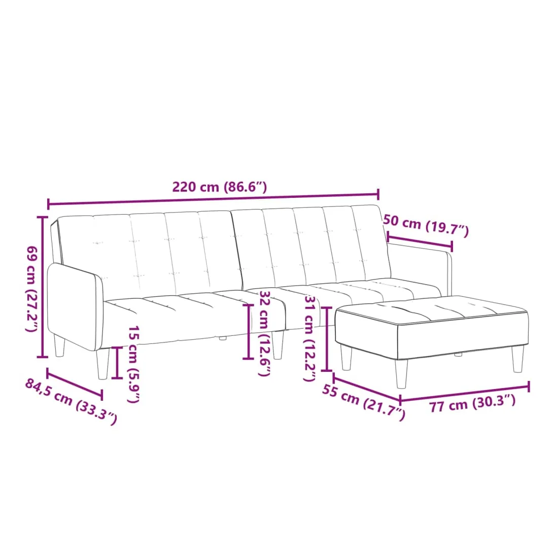 - Dimensions totales : 220 x 84,5 x 69 cm (L x l x H)