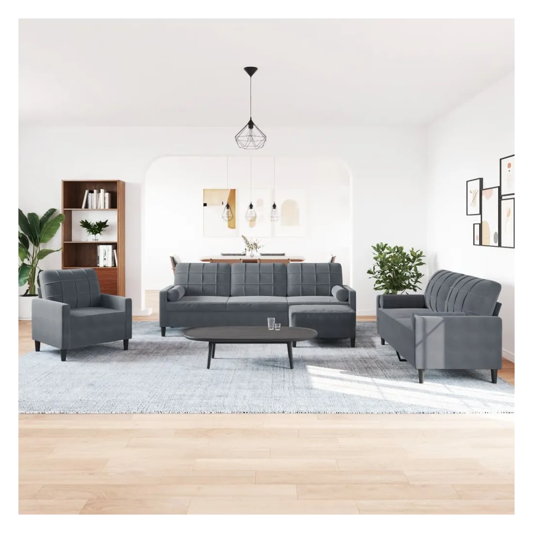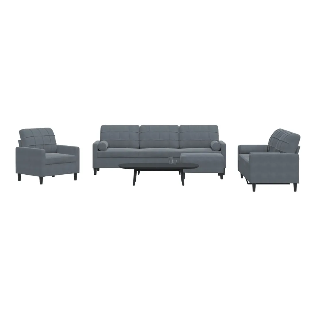 Cet ensemble de canapés est un excellent endroit pour discuter, lire, regarder la télévision ou simplement vous détendre. Il est destiné à être un point central de votre maison. Matériau doux et confortable : le tissu en velours présente une surface douce et lisse qui offre une sensation agréable contre la peau, vous apportant chaleur et confort ultime. Cadre robuste et stable : le cadre en métal du canapé de salon assure robustesse et stabilité. Expérience d'assise confortable : le canapé est très confortable avec les sièges, les accoudoirs et les oreillers de dossier bien rembourrés. Les traversins inclus ne font pas qu'embellir votre décor, ils peuvent aussi ajouter un confort supplémentaire lorsque vous êtes assis ou allongé. Pouf polyvalent : ce repose-pied convient pour reposer vos pieds lorsque vous êtes allongé dans un canapé, ou pour vous offrir un siège supplémentaire dans votre pièce. De plus, le design simple et la taille compacte le rendent idéal pour presque tous vos espaces de vie.Design accrocheur : doté d'un design simple mais moderne, ce canapé est destiné à attirer l'attention dans votre chambre.