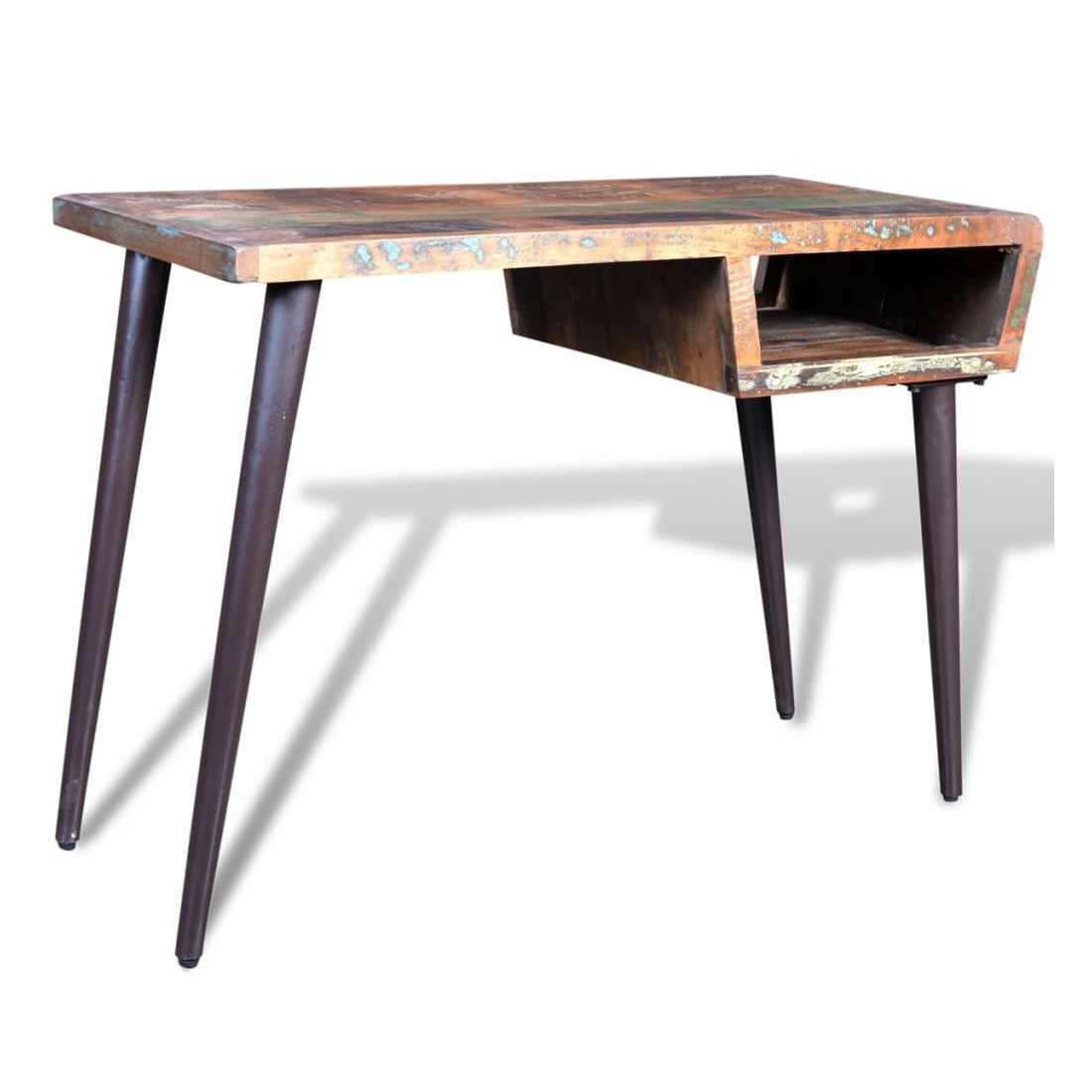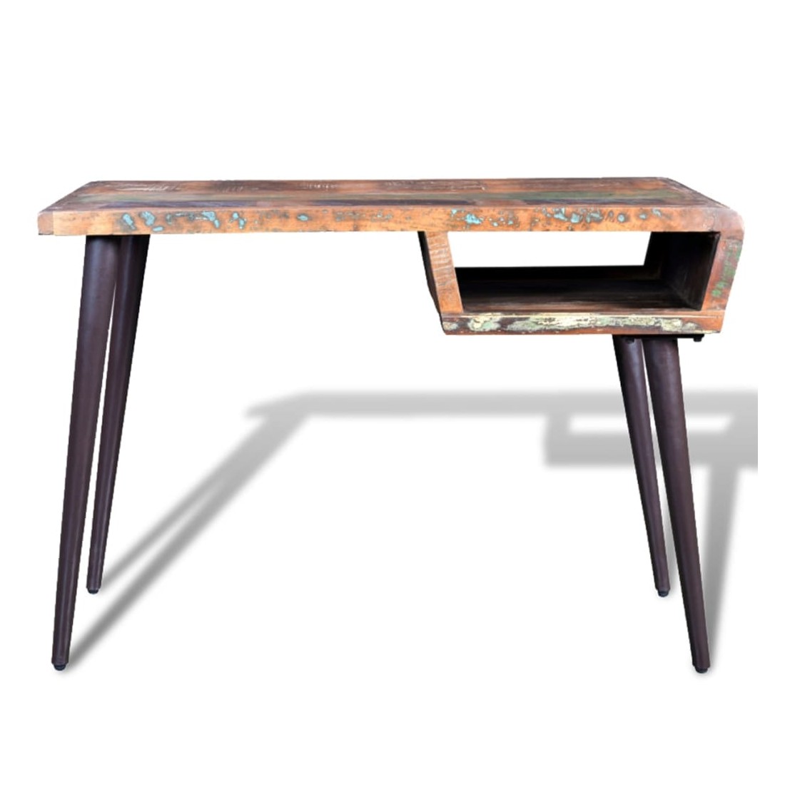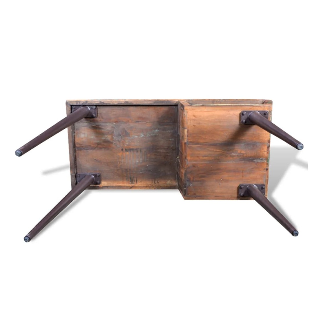 Ce bureau, avec un dessus de table en bois de récupération et 4 pieds en fer résistant, est un accessoire intemporel pour votre maison. Son dessus de table en bois massif offre une surface stable et sécurisée pour placer vos verres, vases, fruits ou ornements. Le bureau dispose d'un compartiment sous la table, ce qui vous offre un espace de rangement supplémentaire. Ce bureau, avec un dessus de table en bois de récupération et 4 pieds en fer résistant, est un accessoire intemporel pour votre maison. Son dessus de table en bois massif offre une surface stable et sécurisée pour placer vos verres, vases, fruits ou ornements. Le bureau dispose d'un compartiment sous la table, ce qui vous offre un espace de rangement supplémentaire. Le dessus de table est fait de bois de récupération, ce qui signifie que chaque meuble est unique et légèrement différent l'un de l'autre. Le mobilier fabriqué à partir de bois de récupération a des caractéristiques de différents bois comme le bois de teck, l'acacia, le bois de manguier, le bois de saal etc. Le bois de récupération est solide, stable, durable et beau. Les trous de clous ou les grains à face claire apportent leur histoire avec eux et invitent une autre génération à les imprégner des leurs. Garder ce meuble à la maison montrera votre concept de conservation des ressources, de protection de l'environnement et de développement durable. En outre, l'artisanat à la main ajoute un style spectaculaire vintage au bureau et dégage de l'exotisme. Chaque processus de recombinaison, de polissage, de peinture et de cirage est minutieusement préparé. Le bureau antique sera sûrement un ajout parfait à votre maison ! Remarque importante : les couleurs varient d'un meuble à l'autre, rendant chacun de nos bureaux unique. La livraison est aléatoire, ce qui garantit l'exclusivité et l'individualité de votre produit.