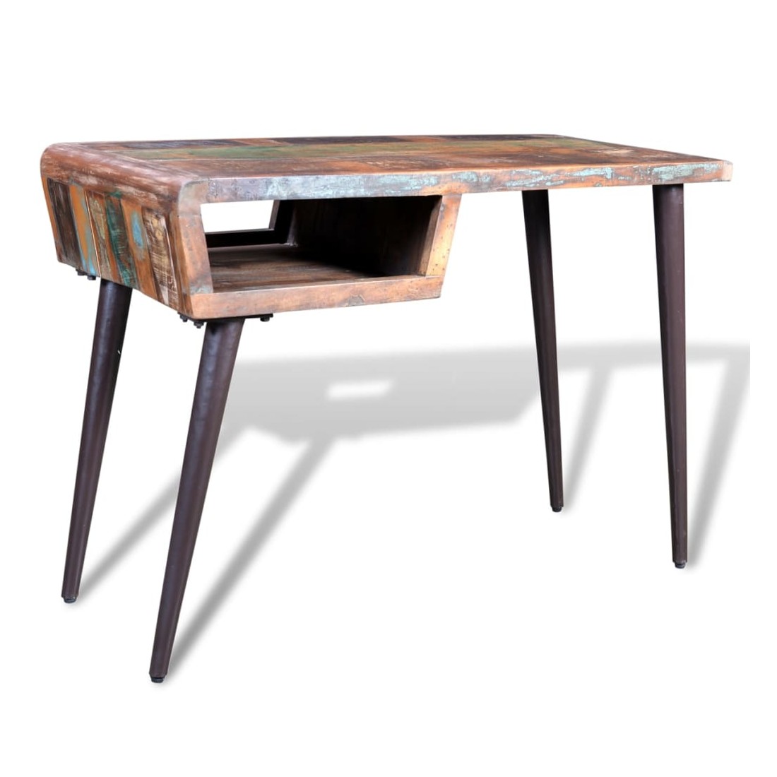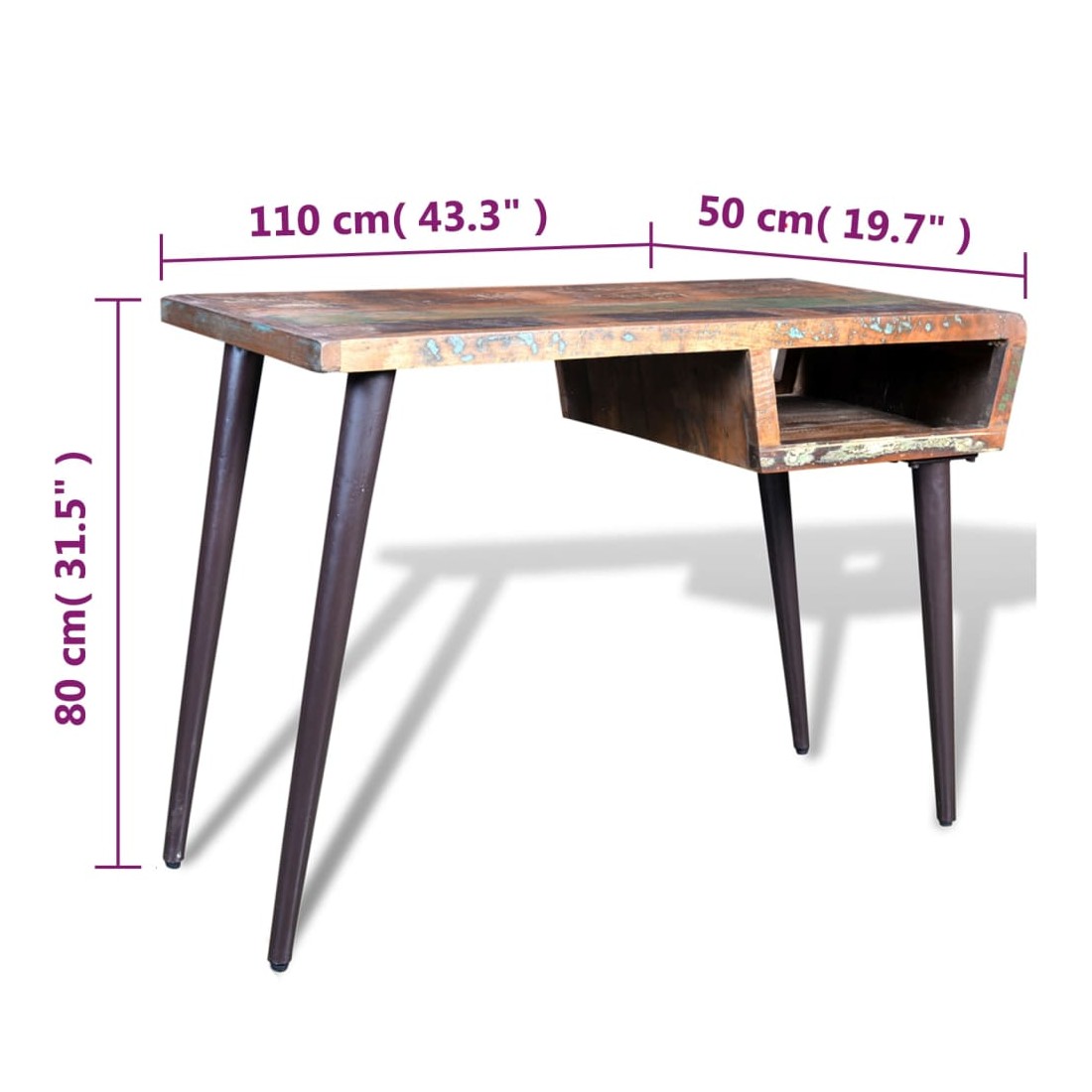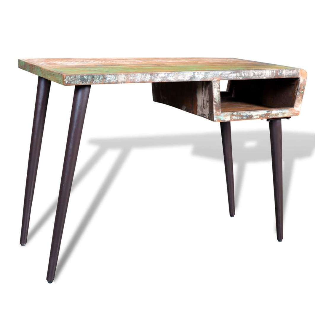 Ce bureau, avec un dessus de table en bois de récupération et 4 pieds en fer résistant, est un accessoire intemporel pour votre maison. Son dessus de table en bois massif offre une surface stable et sécurisée pour placer vos verres, vases, fruits ou ornements. Le bureau dispose d'un compartiment sous la table, ce qui vous offre un espace de rangement supplémentaire. Ce bureau, avec un dessus de table en bois de récupération et 4 pieds en fer résistant, est un accessoire intemporel pour votre maison. Son dessus de table en bois massif offre une surface stable et sécurisée pour placer vos verres, vases, fruits ou ornements. Le bureau dispose d'un compartiment sous la table, ce qui vous offre un espace de rangement supplémentaire. Le dessus de table est fait de bois de récupération, ce qui signifie que chaque meuble est unique et légèrement différent l'un de l'autre. Le mobilier fabriqué à partir de bois de récupération a des caractéristiques de différents bois comme le bois de teck, l'acacia, le bois de manguier, le bois de saal etc. Le bois de récupération est solide, stable, durable et beau. Les trous de clous ou les grains à face claire apportent leur histoire avec eux et invitent une autre génération à les imprégner des leurs. Garder ce meuble à la maison montrera votre concept de conservation des ressources, de protection de l'environnement et de développement durable. En outre, l'artisanat à la main ajoute un style spectaculaire vintage au bureau et dégage de l'exotisme. Chaque processus de recombinaison, de polissage, de peinture et de cirage est minutieusement préparé. Le bureau antique sera sûrement un ajout parfait à votre maison ! Remarque importante : les couleurs varient d'un meuble à l'autre, rendant chacun de nos bureaux unique. La livraison est aléatoire, ce qui garantit l'exclusivité et l'individualité de votre produit.