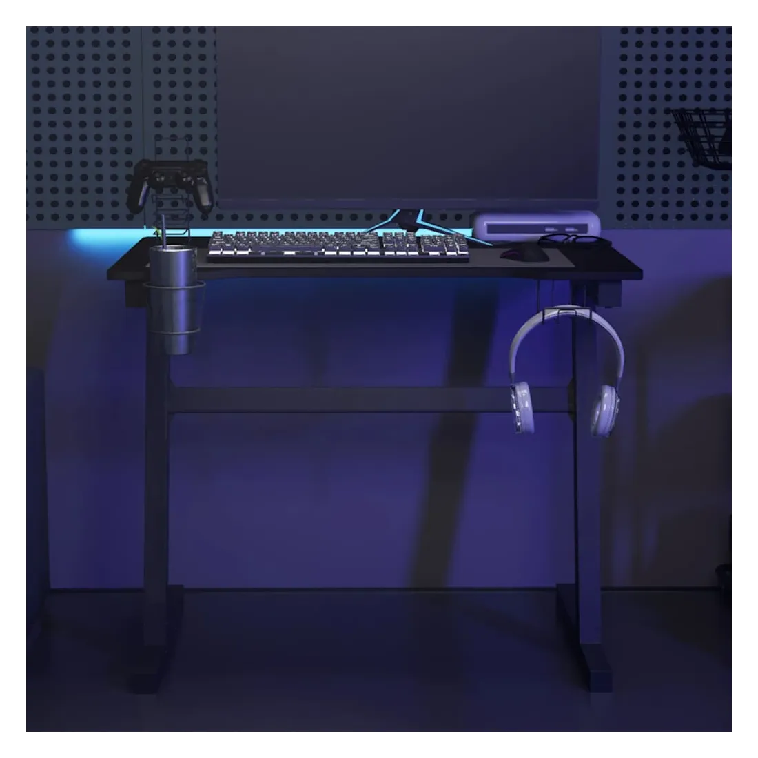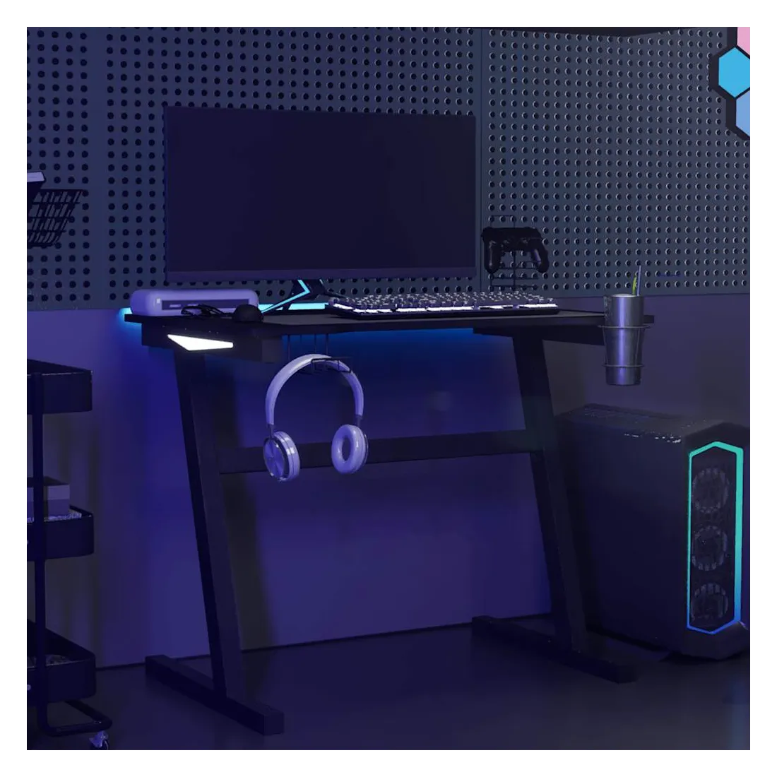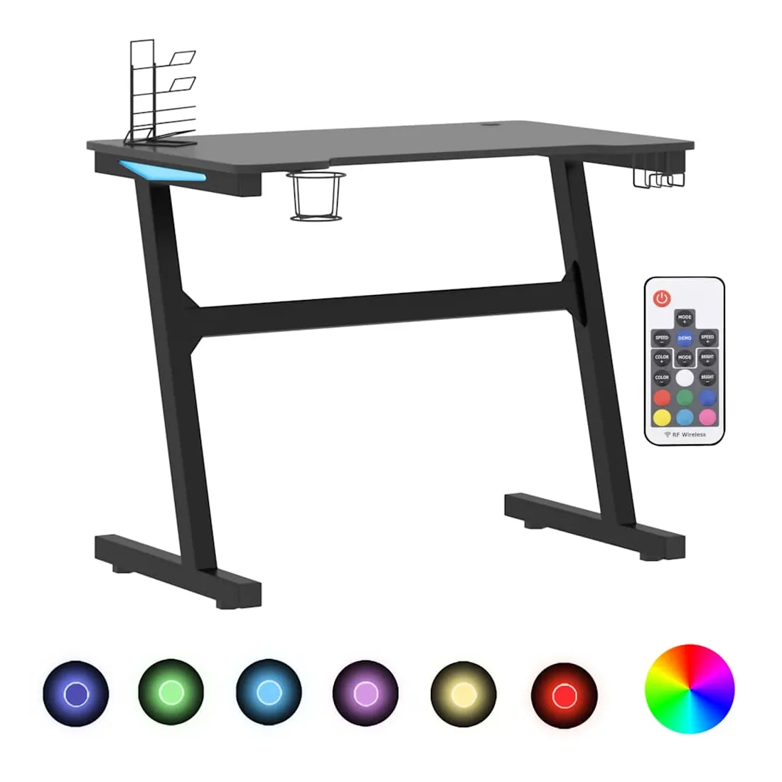 Ce bureau de jeu à LED vous permettra d'entrer dans le mode de jeu lorsque vous plongez dans la lumière RVB. La conception ergonomique simplifiée offre une posture de jeu parfaite, vous aidant à jouer plus longtemps et plus fort ! Ce bureau d’ordinateur comprend un support d’écouteurs et un support de contrôleur, qui peuvent tenir vos écouteurs au bout de vos doigts. Il a également un porte-gobelet pour garder vos boissons. Il fournit un espace massif pour vos moniteurs de jeu, PC, claviers de jeu et autres équipements de jeu. De plus, la conception des pieds en forme de Z en fer le rend stable et peut résister aux exigences de tout joueur sérieux. Bon à savoir : le produit est doté d'un connecteur USB qui nécessite une source d'alimentation certifiée de USB 5V (non incluse).