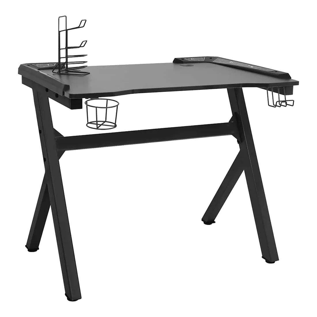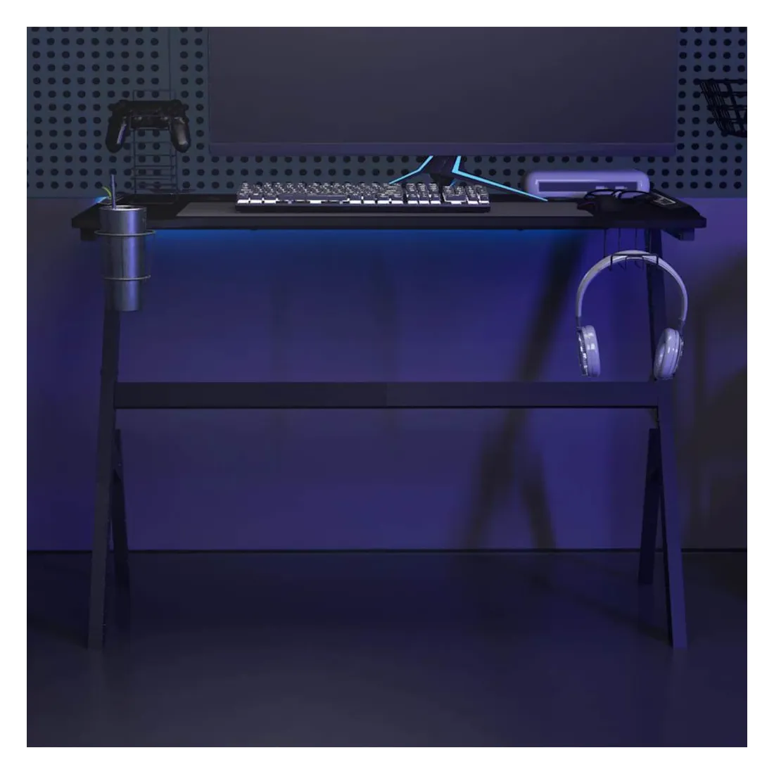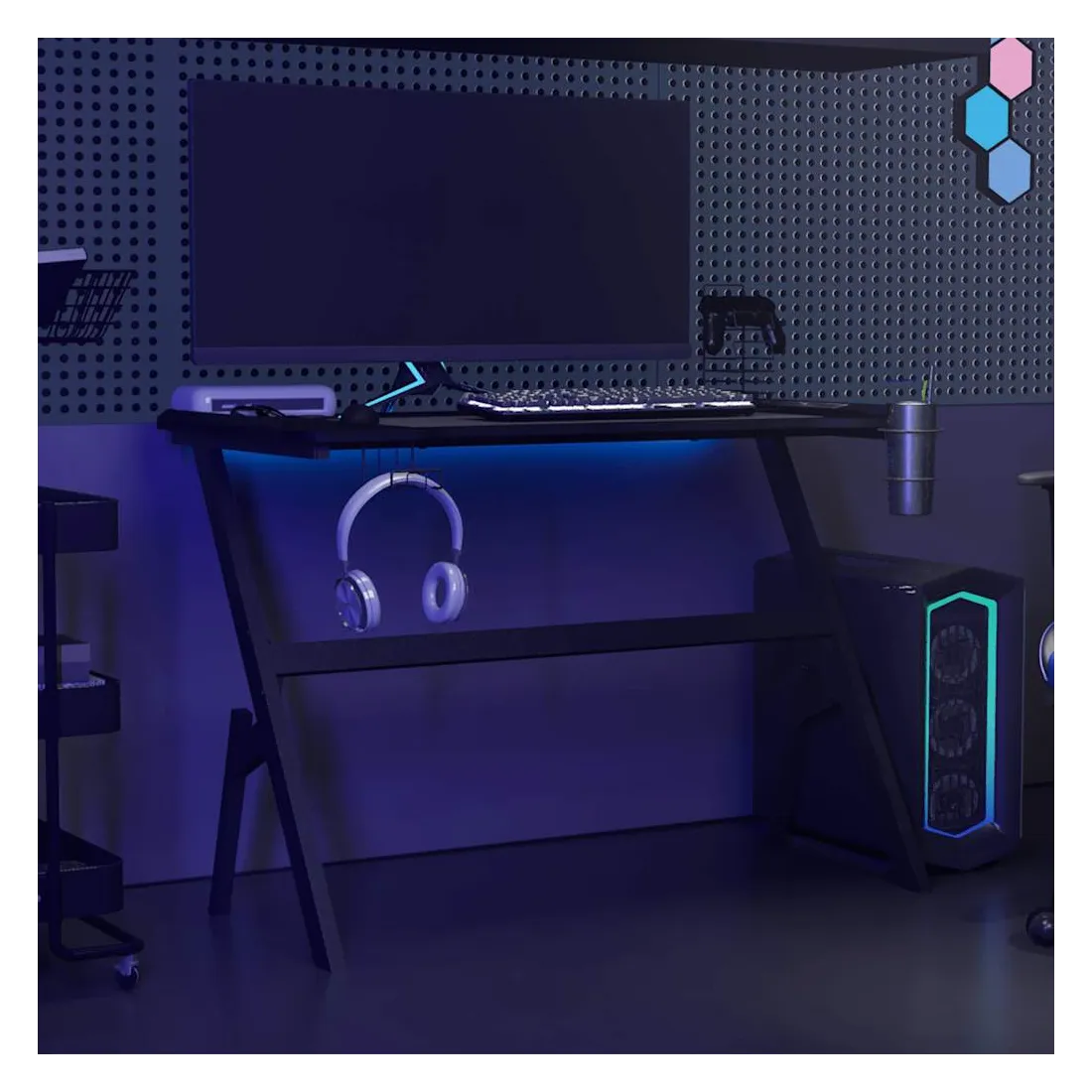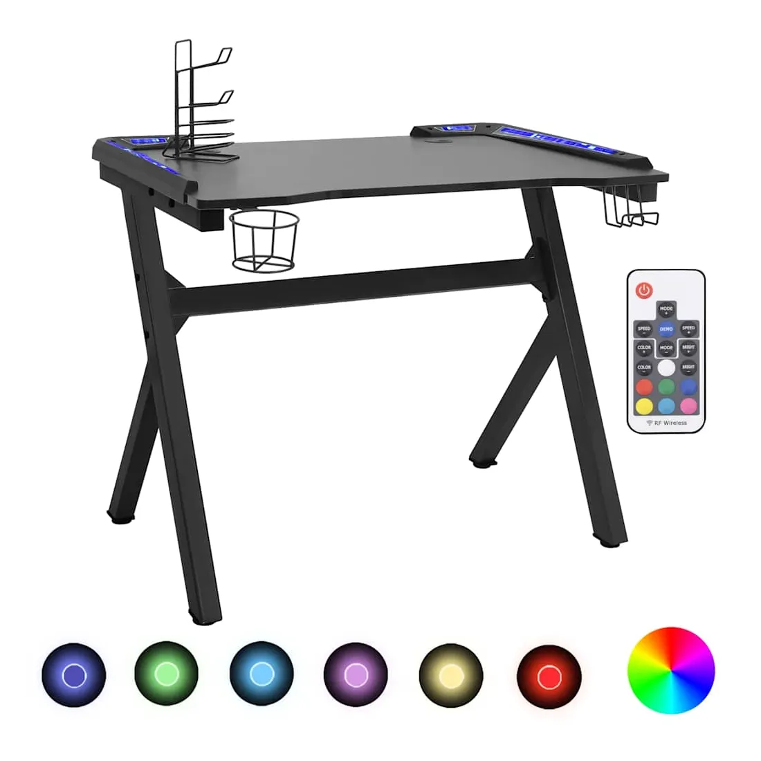 Ce bureau de jeu à LED vous permettra d'entrer dans le mode de jeu lorsque vous plongez dans la lumière RVB. La conception ergonomique simplifiée offre une posture de jeu parfaite, vous aidant à jouer plus longtemps et plus fort ! Ce bureau d’ordinateur comprend un support d’écouteurs et un support de contrôleur, qui peuvent tenir vos écouteurs au bout de vos doigts. Il a également un porte-gobelet pour garder vos boissons. Il fournit un espace massif pour vos moniteurs de jeu, PC, claviers de jeu et autres équipements de jeu. De plus, la conception des pieds en forme de Y en fer le rend stable et peut résister aux exigences de tout joueur sérieux. Bon à savoir : le produit est doté d'un connecteur USB qui nécessite une source d'alimentation certifiée de USB 5V (non incluse).