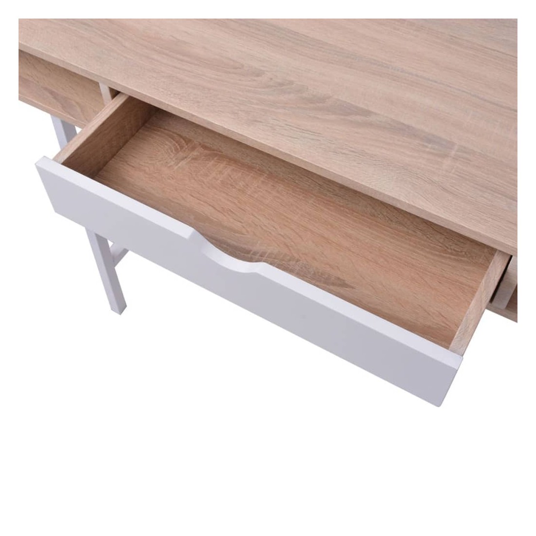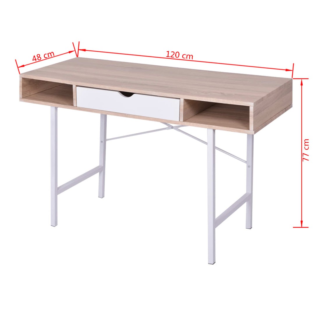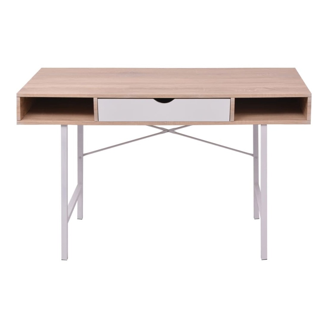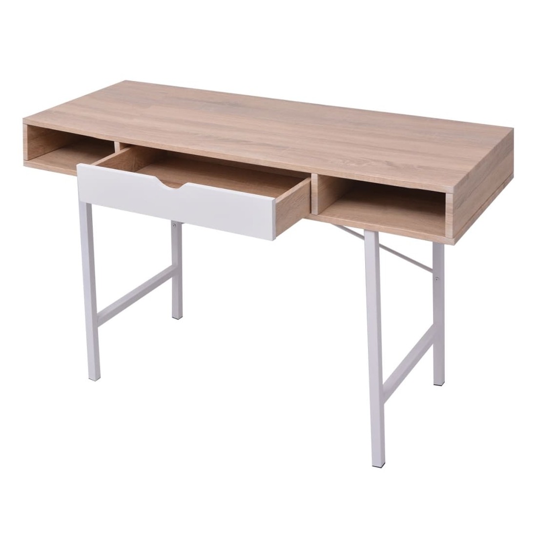 Ce meuble remarquablement fonctionnel animera n'importe quel environnement de maison ou de bureau. Doté d'un dessus en MDF de haute qualité et de pieds en métal massif, ce bureau est très durable, stable et robuste. Le dessus de table spacieux offre suffisamment d'espace pour ranger votre ordinateur, ordinateur portable, lampe de table, etc. Les deux compartiments, un de chaque côté, ainsi que le tiroir central, sont parfaits pour ranger et garder à portée de main toutes sortes d'objets plus petits comme des clés, des blocs-notes, des stylos et d'autres bibelots.