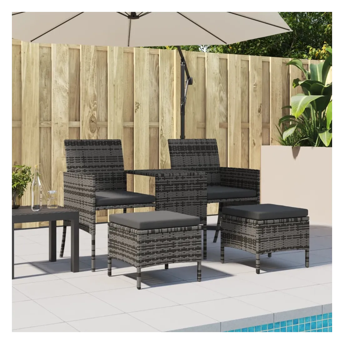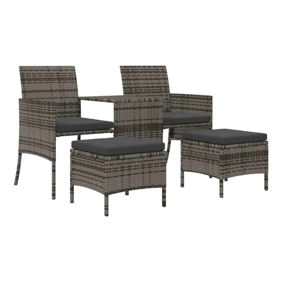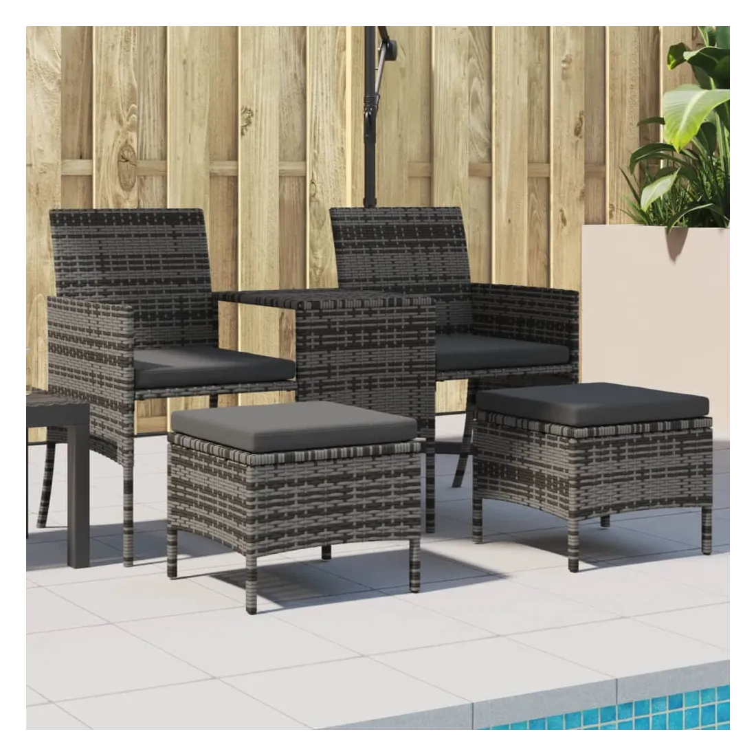 Détendez-vous et profitez de l'extérieur dans ce confortable canapé de jardin ! Matériau durable : la résine tressée, également connue sous le nom de poly rotin, est un matériau synthétique solide et nécessitant peu d'entretien qui ressemble au rotin naturel. Elle est légère, facile à nettoyer et couramment utilisée pour les meubles d'extérieur en raison de sa durabilité et de ses propriétés de résistance aux intempéries.Table centrale pratique : ce mobilier d'extérieur est doté d'une table centrale intégrée, qui permet de ranger vos objets essentiels à portée de main.Pouf polyvalent : le pouf est polyvalent, servant de repose-pieds confortable lorsque vous vous prélassez sur le canapé ou de siège supplémentaire dans votre jardin. Les poufs peuvent être rangés sous les chaises, ce qui permet d'économiser encore plus d'espace.Housse amovible et lavable : ces coussins sont dotés de housses amovibles pour un lavage et un entretien faciles.Cadre robuste et stable : le cadre en acier enduit de poudre assure la solidité et la stabilité du meuble de jardin pour une utilisation quotidienne à l'extérieur. Bon à savoir :Pour que vos meubles d'extérieur restent beaux, nous vous recommandons de les protéger avec une housse imperméable.