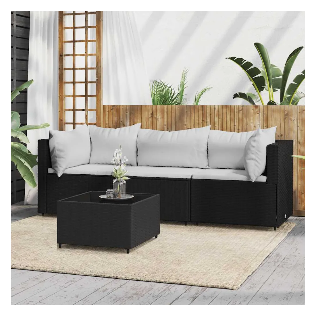 Cet ensemble de salon de jardin tendance, au design élégant et contemporain, est un excellent choix pour manger ou vous détendre dans votre jardin. Matériau résistant aux intempéries : la résine tressée, également connue sous le nom de rotin poly, résiste aux intempéries et est facile à nettoyer. Elle reste belle à l'extérieur pendant une longue période. Elle offre une excellente qualité, commodité et un aspect esthétique.Cadre robuste : les cadres en acier enduit de poudre rendent l'ensemble de salon d'extérieur robuste et stable pour une utilisation quotidienne à l'extérieur.Dessus de table pratique : le dessus lisse de la table de jardin est en verre trempé, facile à nettoyer avec un chiffon humide. De plus, le dessus robuste est parfait pour placer des repas, des boissons et d'autres objets décoratifs.Conception modulaire : l'ensemble de salon de jardin est flexible et facile à déplacer, vous pouvez donc le combiner avec d'autres segments modulaires dans la boutique en ligne pour créer vos propres configurations d'ensemble de salon de jardin !Expérience d'assise confortable : le dossier ajoute un confort d'assise supplémentaire au canapé de jardin. De plus, les coussins bien rembourrés offrent du confort pendant votre temps d'assise. Bon à savoir :Pour faciliter au maximum le montage, chaque produit est livré avec des instructions. Remarque :Le produit est conçu pour une utilisation à l'extérieur uniquement. Ne le rangez pas à l'intérieur.Pour que vos meubles d'extérieur restent beaux, nous vous recommandons de les protéger avec une housse imperméable.