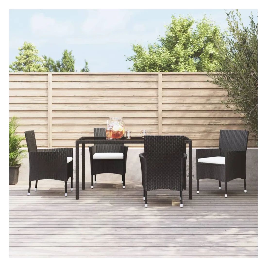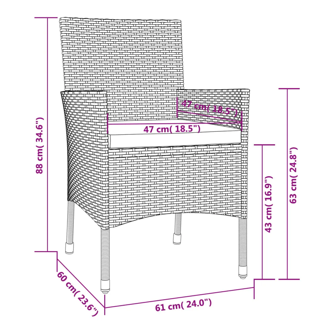 Dînez avec les membres de votre famille ou profitez simplement du temps dans votre espace extérieur avec cet ensemble de chaises de jardin. La chaise d’extérieur est fabriquée à partir d’un solide cadre en acier enduit de poudre, ce qui la rend robuste et stable pour des années de détente. Le fauteuil recouvert de résine tressée est facile à nettoyer avec un chiffon humide et convient à une utilisation quotidienne à l’extérieur. De plus, le coussin d'assise bien rembourré ajoute un confort supplémentaire à la chaise. Remarque : afin de prolonger la durée de vie de vos meubles d'extérieur, nous vous recommandons de les nettoyer régulièrement et de ne pas les laisser à l'extérieur sans protection inutilement.Nettoyage : Utiliser une solution savonneuse douce.Stockage : si possible, stockez dans un endroit frais et sec à l'intérieur. Si le produit est stocké à l'extérieur, protégez-le avec une housse imperméable. Essuyez et séchez l'excès d'eau ou de neige des surfaces planes après la pluie ou une chute de neige. Permettez une circulation d'air suffisante afin d'éviter les dommages liés à l'humidité.