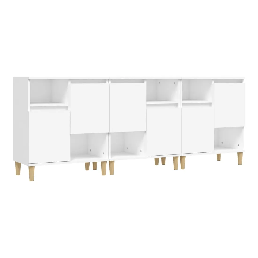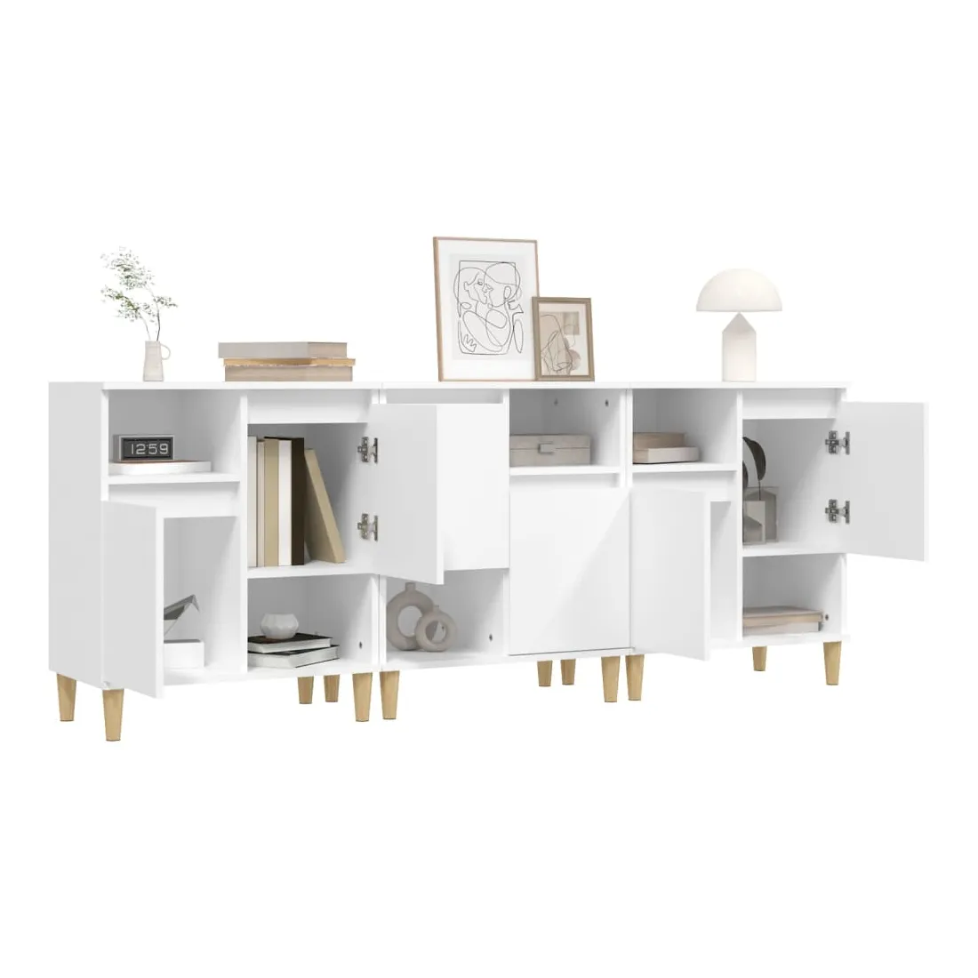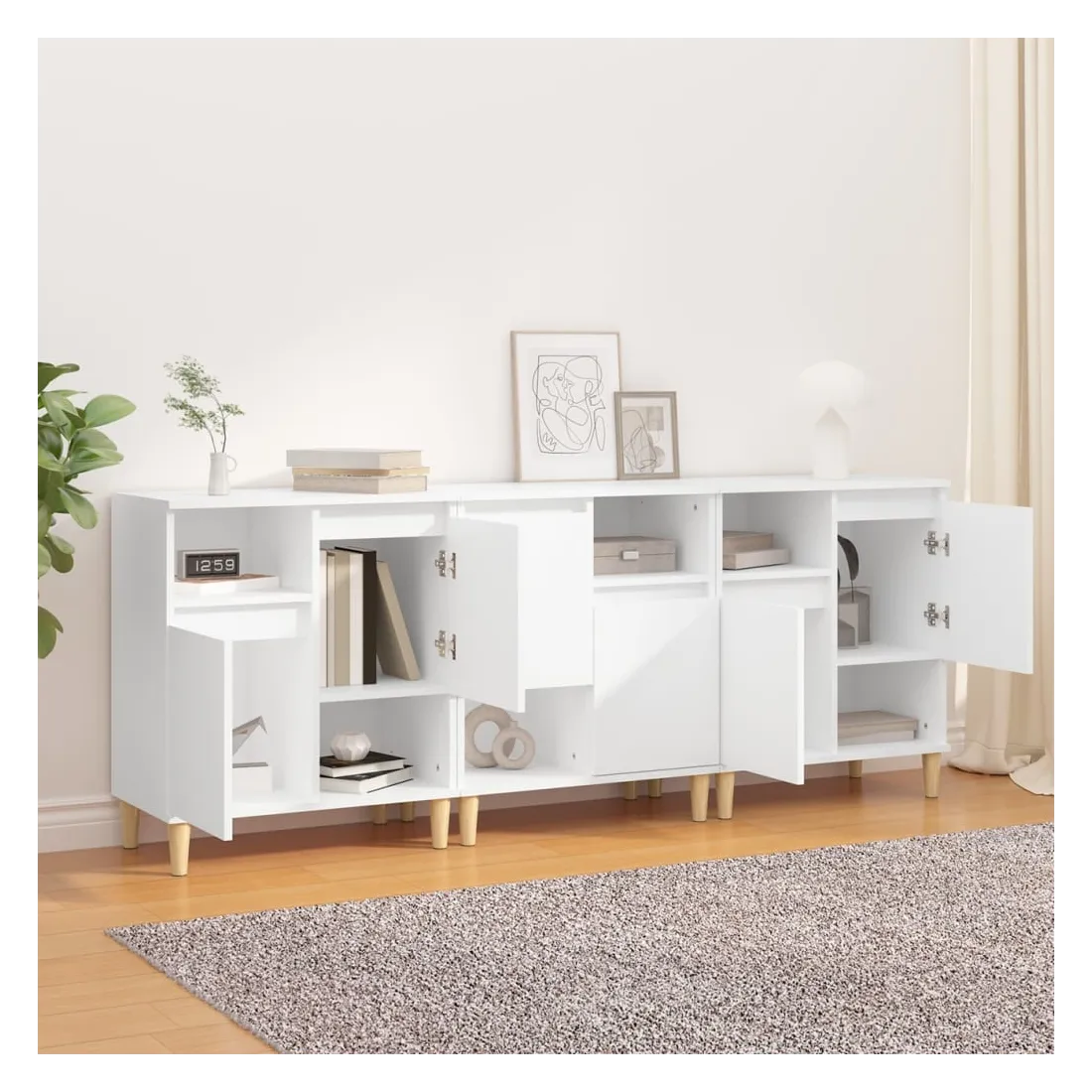 Ces buffets tendance, au design élégant et classique, sont destinés à améliorer votre intérieur. Matériau durable : le bois d'ingénierie est d'une qualité exceptionnelle avec une surface lisse et présente également une résistance, une stabilité et une résistance à l'humidité. Fabriquée en bois d'ingénierie, l'armoire est facile à nettoyer avec un chiffon humide.Grand espace de rangement : ce buffet dispose de 4 compartiments et de 2 portes, offrant un grand espace de rangement pour garder vos magazines, livres, DVD, appareils multimédias et autres objets essentiels bien organisés et à portée de main.Pieds en bois : les pieds en bois d'eucalyptus massif confèrent à l'armoire de rangement un aspect naturel et agréable tout en assurant sa stabilité.Fonction d'exposition : le haut de l'armoire est idéal pour placer des plantes en pot, des photos encadrées et d'autres objets décoratifs. Bon à savoir :Les portes peuvent être installées de deux manières. Attention :Pour éviter qu'il ne soit renversé, ce produit doit être utilisé avec le dispositif de fixation au mur fourni.
