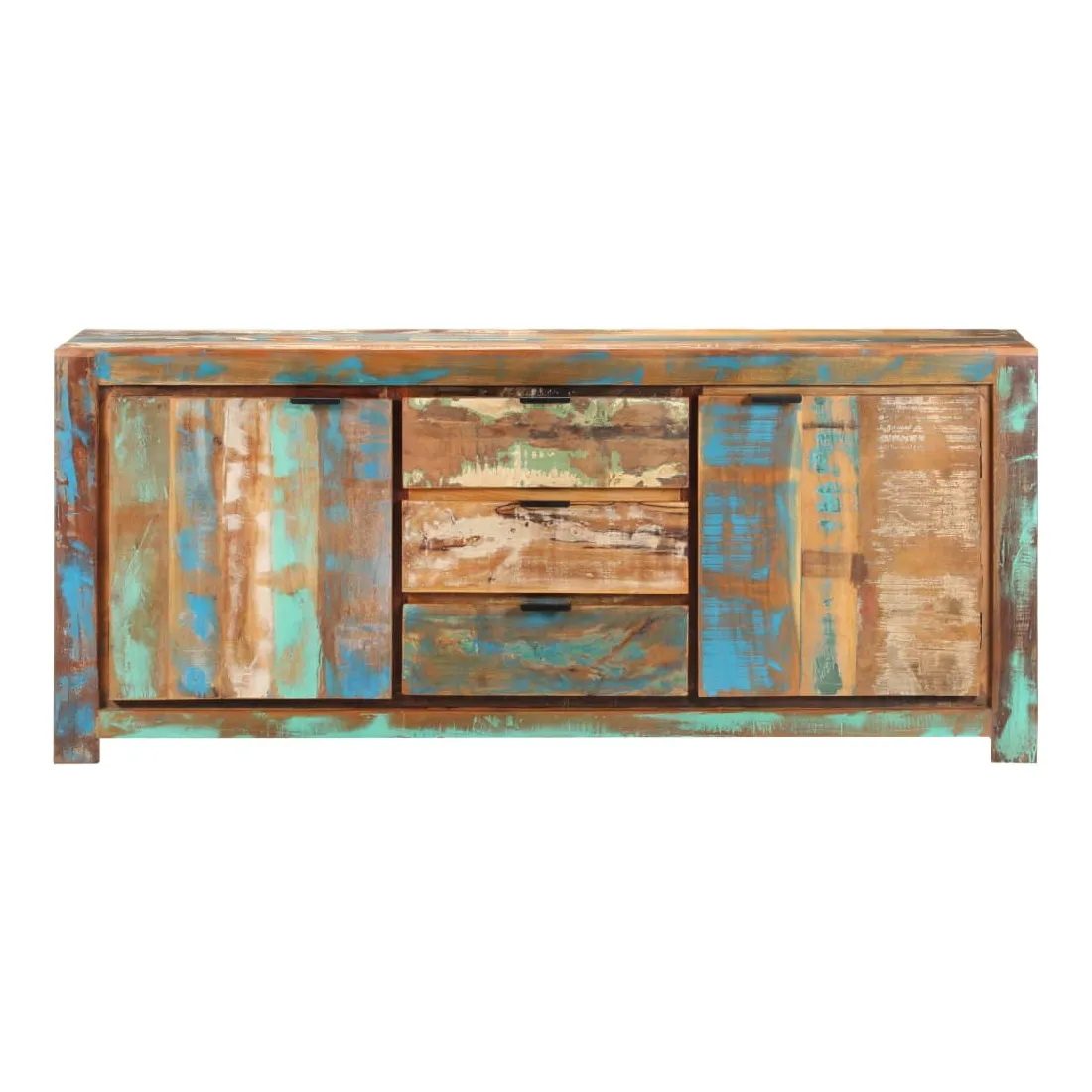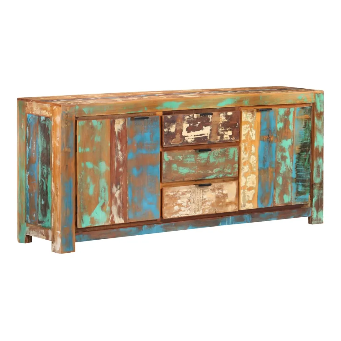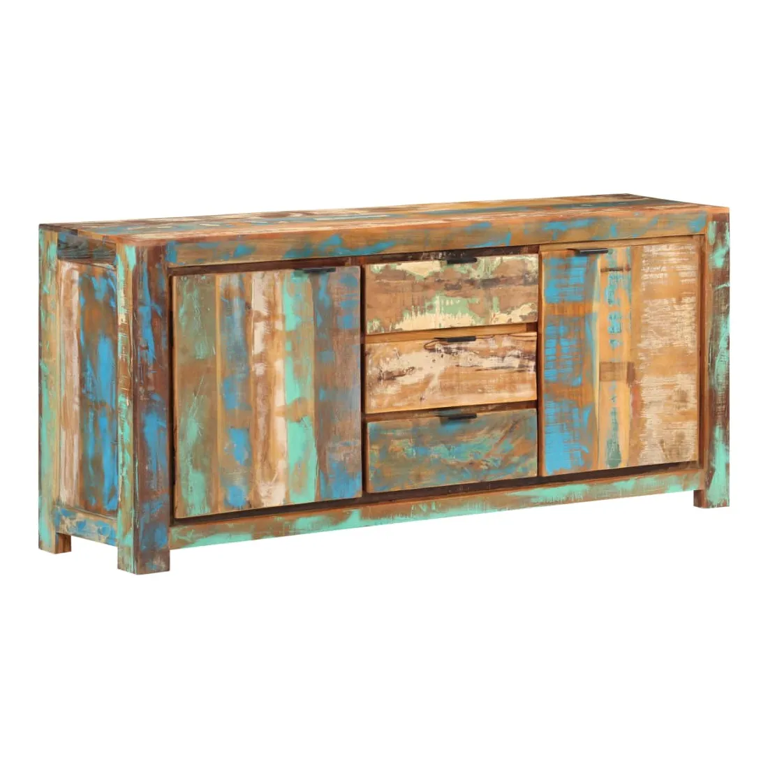 Ce buffet en bois est un supplément pratique et décoratif à votre salon ou à votre chambre à coucher. Cette armoire latérale est faite de bois de récupération provenant de solives, de planchers et de poutres de support d'anciens bâtiments démolis, et peut comprendre différents types de bois comme le pin, le teck, le hêtre, le chêne, le cèdre, le manguier, l'acacia, etc. Cela signifie que le bois de récupération conserve les caractéristiques de ces différents types de bois. Le bois de récupération est déjà vieilli, patiné et séché, il ne rétrécit pas et ne se plie pas. Cette armoire est entièrement faite à la main et les magnifiques grains de bois rendent chaque meuble unique et légèrement différent l'un de l'autre. Cette armoire de rangement dispose de 2 portes et de 3 tiroirs, offrant un grand espace pour garder les livres, magazines et autres articles bien organisés et à portée de main. De plus, son dessus robuste est idéal pour placer des objets décoratifs tels que des vases et des cadres photo. Remarque importante : les couleurs varient d'une pièce à l'autre, rendant chaque pièce unique. La livraison est aléatoire, garantissant l'exclusivité et l'individualité de votre produit.