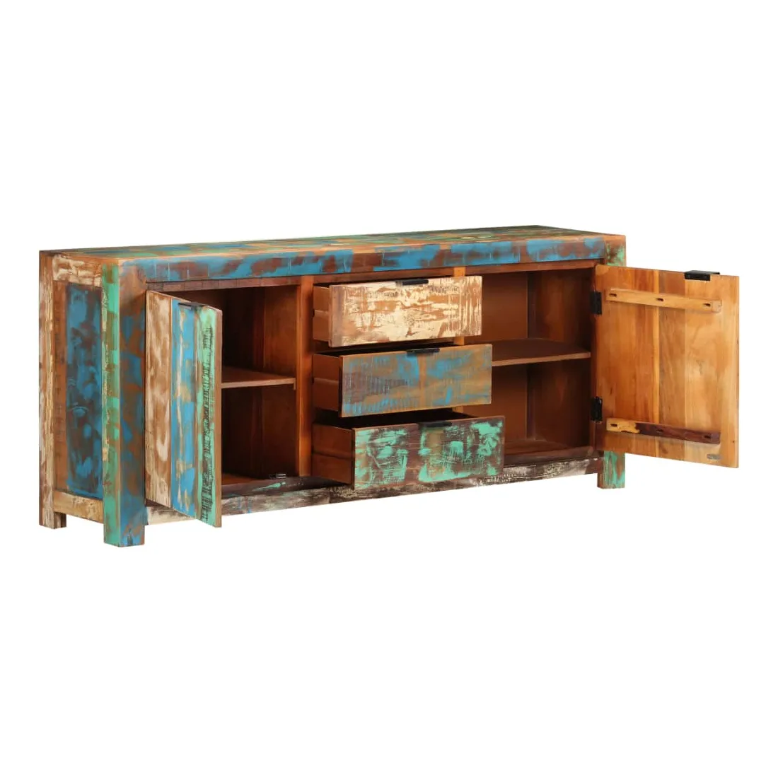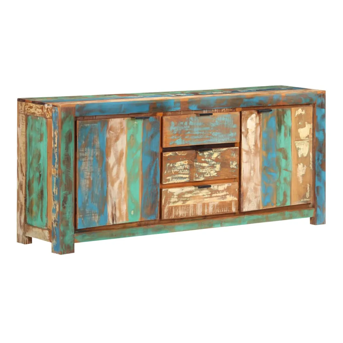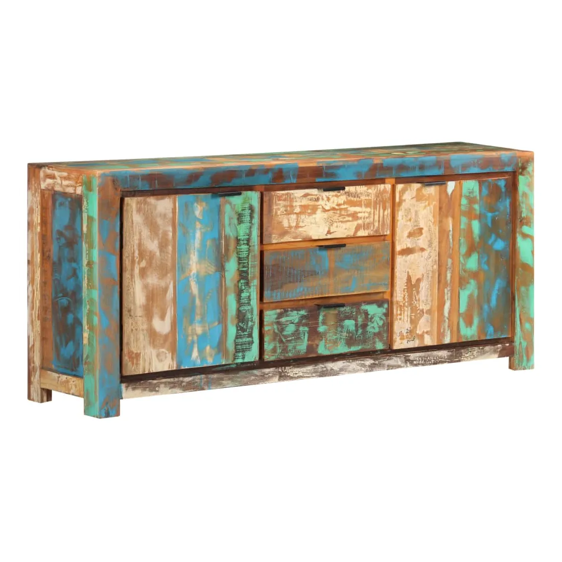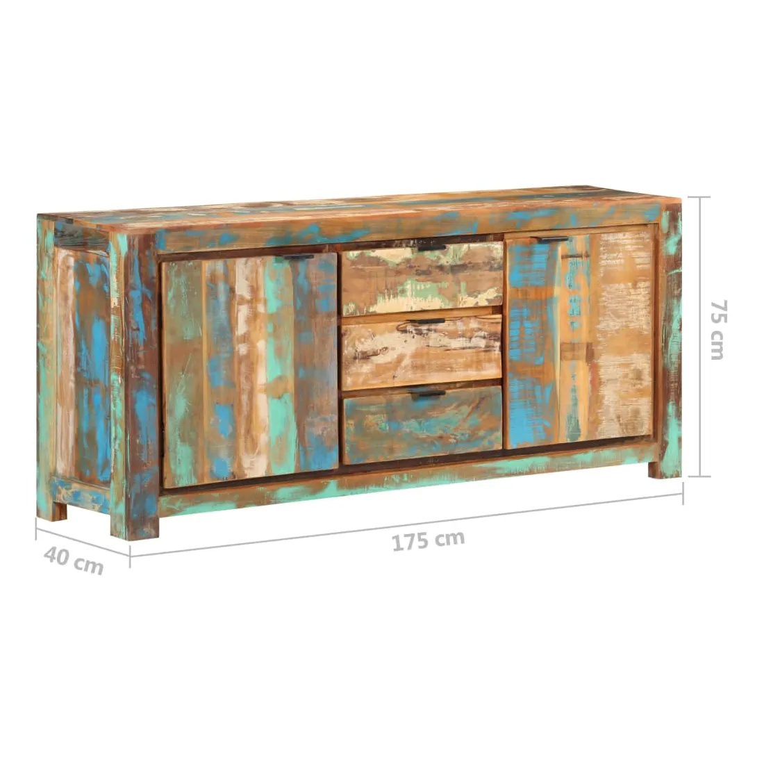 Ce buffet en bois est un supplément pratique et décoratif à votre salon ou à votre chambre à coucher. Cette armoire latérale est faite de bois de récupération provenant de solives, de planchers et de poutres de support d'anciens bâtiments démolis, et peut comprendre différents types de bois comme le pin, le teck, le hêtre, le chêne, le cèdre, le manguier, l'acacia, etc. Cela signifie que le bois de récupération conserve les caractéristiques de ces différents types de bois. Le bois de récupération est déjà vieilli, patiné et séché, il ne rétrécit pas et ne se plie pas. Cette armoire est entièrement faite à la main et les magnifiques grains de bois rendent chaque meuble unique et légèrement différent l'un de l'autre. Cette armoire de rangement dispose de 2 portes et de 3 tiroirs, offrant un grand espace pour garder les livres, magazines et autres articles bien organisés et à portée de main. De plus, son dessus robuste est idéal pour placer des objets décoratifs tels que des vases et des cadres photo. Remarque importante : les couleurs varient d'une pièce à l'autre, rendant chaque pièce unique. La livraison est aléatoire, garantissant l'exclusivité et l'individualité de votre produit.
