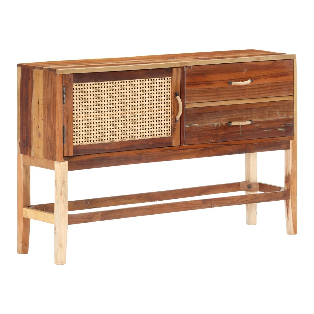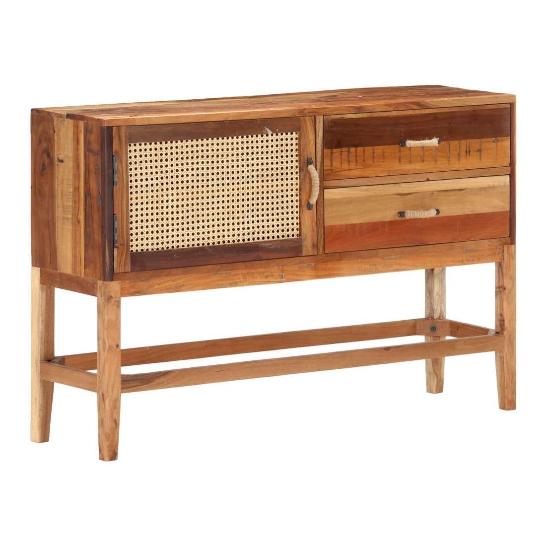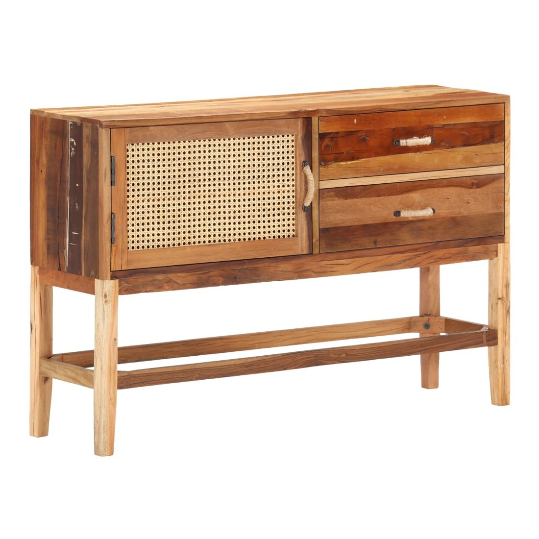 vidaXLCe buffet est un choix parfait si vous cherchez à ajouter une touche de charme rustique à votre décoration intérieure. Le buffet en bois est fait de bois de récupération solide, provenant des poutrelles, des planchers et des poutres de support d'anciens bâtiments démolis. De plus, il peut comprendre différents types de bois tels que le teck, le bois dur, le bois tropical, le bois de manguier, etc. Cela signifie que le bois de récupération conserve les caractéristiques de ces différents types de bois. Le bois de récupération est déjà vieilli, patiné et séché. Par conséquent, ils ne rétrécissent pas et ne se plient pas. La porte avant est en canne naturelle. Cette armoire à tiroirs est entièrement faite à la main, et les jolis grains de bois rendent chaque meuble distinctif et légèrement différent l'un de l'autre. Chaque étape du processus est réalisée avec le plus grand soin, que ce soit le polissage, la peinture ou le laquage. Cette armoire de rangement offre un espace de rangement pour vos livres, blocs-notes, stylos et autres bibelots. L'armoire latérale est également facile à assembler. Remarque importante : la couleur peut varier d'une pièce à l'autre, ce qui rend chaque pièce unique. La livraison est également aléatoire.