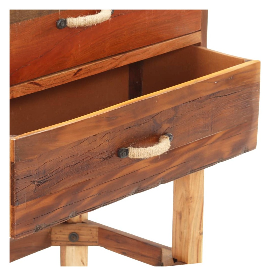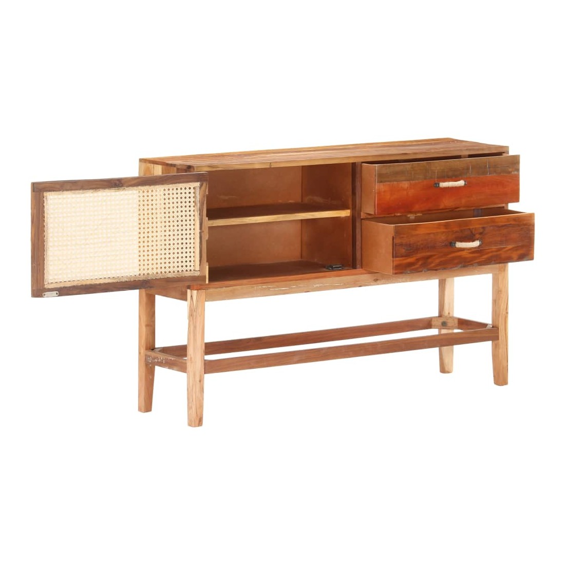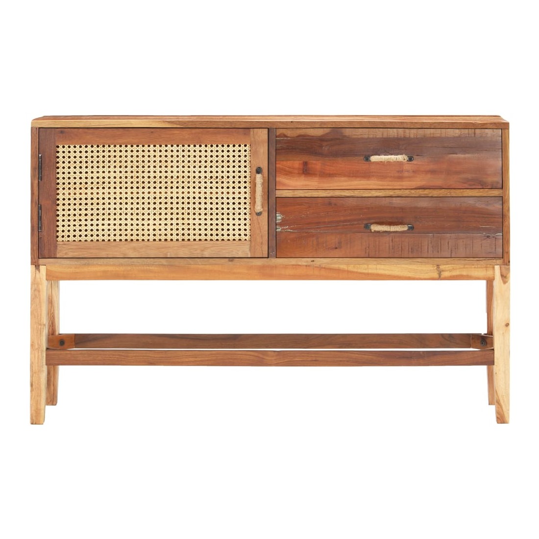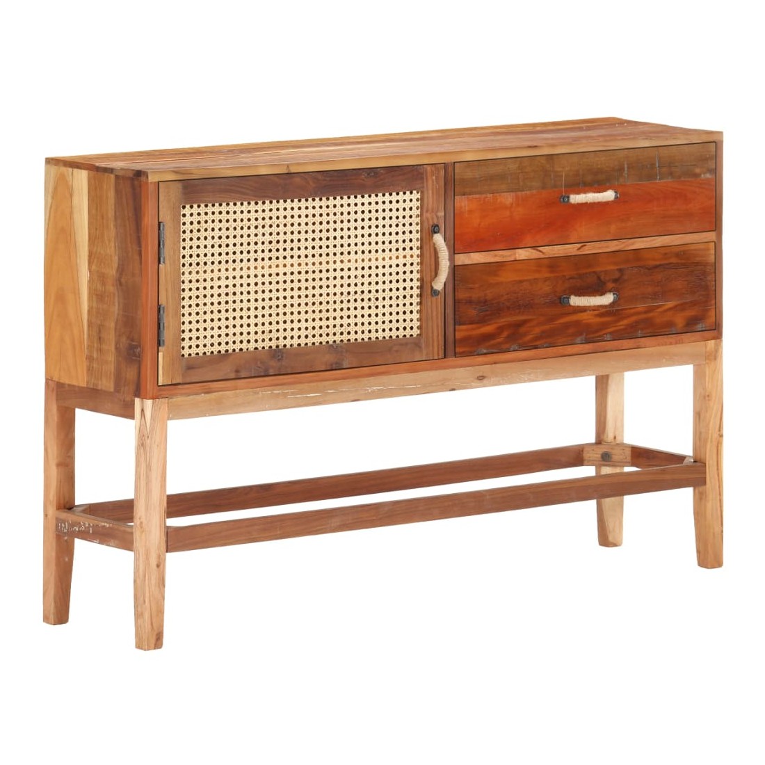 vidaXLCe buffet est un choix parfait si vous cherchez à ajouter une touche de charme rustique à votre décoration intérieure. Le buffet en bois est fait de bois de récupération solide, provenant des poutrelles, des planchers et des poutres de support d'anciens bâtiments démolis. De plus, il peut comprendre différents types de bois tels que le teck, le bois dur, le bois tropical, le bois de manguier, etc. Cela signifie que le bois de récupération conserve les caractéristiques de ces différents types de bois. Le bois de récupération est déjà vieilli, patiné et séché. Par conséquent, ils ne rétrécissent pas et ne se plient pas. La porte avant est en canne naturelle. Cette armoire à tiroirs est entièrement faite à la main, et les jolis grains de bois rendent chaque meuble distinctif et légèrement différent l'un de l'autre. Chaque étape du processus est réalisée avec le plus grand soin, que ce soit le polissage, la peinture ou le laquage. Cette armoire de rangement offre un espace de rangement pour vos livres, blocs-notes, stylos et autres bibelots. L'armoire latérale est également facile à assembler. Remarque importante : la couleur peut varier d'une pièce à l'autre, ce qui rend chaque pièce unique. La livraison est également aléatoire.
