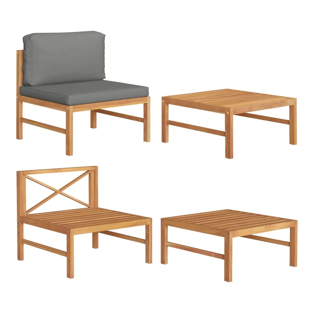 Cet ensemble de salon de jardin en bois, se démarquant par son design et ses coussins moelleux, est un excellent supplément à votre jardin, terrasse ou patio pour discuter avec votre famille et vos amis ou simplement profiter du beau temps. Construit à partir de bois dur de teck extrêmement durable, cet ensemble de meubles en teck a été chevronné, séché au four puis poncé finement pour lui donner un aspect très lisse. Le bois de teck est connu pour sa résistance exceptionnelle et sa résistance aux intempéries, ce qui le rend bien plus adapté aux meubles de jardin que tout autre type de bois. Le bois de teck est le choix parfait si vous souhaitez acheter un meuble de jardin durable. La surface poncée est facile à nettoyer avec un chiffon humide. Les coussins d'assise et de dossier bien rembourrés ajoutent un confort maximal. La table est idéale pour placer des boissons et de la nourriture.