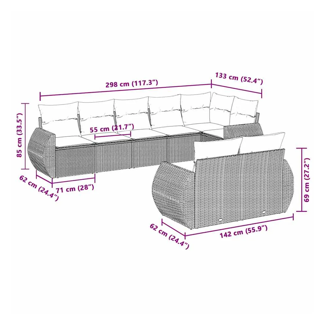 Cet ensemble de canapés de jardin est le complément parfait de votre arrière-cour, terrasse ou patio, offrant un espace confortable et accueillant pour discuter avec la famille et les amis ou simplement se détendre et profiter de l'extérieur. Matériau durable : la résine tressée, également connue sous le nom de poly rotin, est un matériau synthétique solide et nécessitant peu d'entretien qui ressemble au rotin naturel. Il est léger, facile à nettoyer et couramment utilisé pour les meubles d'extérieur en raison de sa durabilité et de ses propriétés de résistance aux intempéries.Expérience d'assise confortable : ce mobilier d'extérieur, doté de coussins épais, offre une expérience d'assise confortable.Housse amovible et lavable : ces coussins de siège sont dotés de housses amovibles pour un lavage et un entretien faciles.Conception modulaire : cet ensemble de meubles d'extérieur a une conception modulaire, ce qui le rend complètement flexible et facile à déplacer, afin que vous puissiez créer un agencement de meubles d'extérieur personnalisé. Bon à savoir :Pour que vos meubles d'extérieur restent beaux, nous vous recommandons de les protéger avec une housse imperméable.