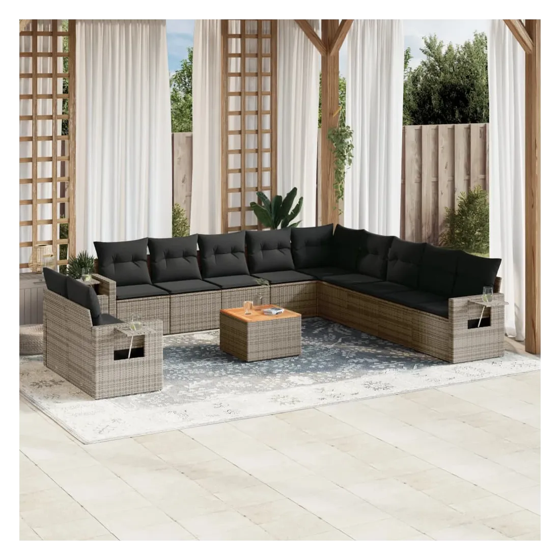 Cet ensemble de canapés de jardin est le complément parfait de votre arrière-cour, terrasse ou patio, offrant un espace confortable et accueillant pour discuter avec la famille et les amis ou simplement se détendre et profiter de l'extérieur. Matériau durable : la résine tressée, également connue sous le nom de poly rotin, est un matériau synthétique solide et nécessitant peu d'entretien qui ressemble au rotin naturel. Il est léger, facile à nettoyer et couramment utilisé pour les meubles d'extérieur en raison de sa durabilité et de ses propriétés de résistance aux intempéries.Table d'appoint pratique : ce mobilier d'extérieur comprend une table d'appoint pliable avec un ressort à gaz sur les accoudoirs, offrant un endroit pratique pour garder vos essentiels à portée de main.Dessus stable et facile à nettoyer : cette table de jardin a un dessus en bois d'acacia robuste, durable et facile à nettoyer avec un chiffon humide.Housse amovible et lavable : ces coussins de siège sont dotés de housses amovibles pour un lavage et un entretien faciles.Conception modulaire : cet ensemble de meubles d'extérieur a une conception modulaire, ce qui le rend complètement flexible et facile à déplacer, afin que vous puissiez créer un agencement de meubles d'extérieur personnalisé. Bon à savoir :Pour que vos meubles d'extérieur restent beaux, nous vous recommandons de les protéger avec une housse imperméable.