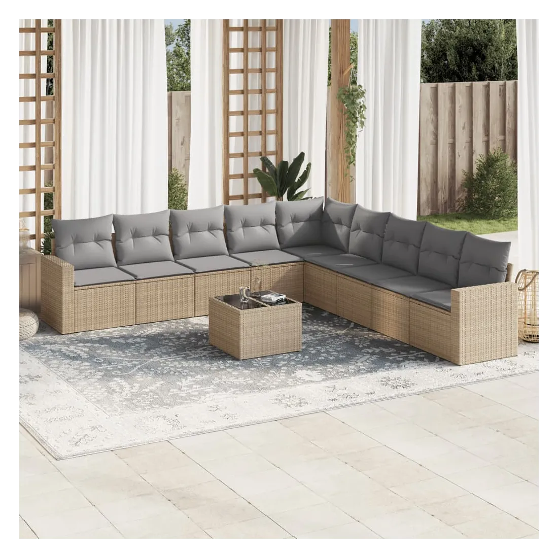 Cet ensemble de canapés de jardin est le complément parfait de votre arrière-cour, terrasse ou patio, offrant un espace confortable et accueillant pour discuter avec la famille et les amis ou simplement se détendre et profiter de l'extérieur. Matériau durable : la résine tressée, également connue sous le nom de poly rotin, est un matériau synthétique solide et nécessitant peu d'entretien qui ressemble au rotin naturel. Il est léger, facile à nettoyer et couramment utilisé pour les meubles d'extérieur en raison de sa durabilité et de ses propriétés de résistance aux intempéries.Fonction de rangement avec sac résistant à l'eau : chaque siège de jardin dispose d'un espace de rangement sous l'assise, complété par un sac résistant à l'eau pour ranger les coussins, les jouets et d'autres objets. Les sacs intérieurs sont dotés d'un couvercle et peuvent être solidement fixés aux sièges à l'aide de bandes auto-agrippantes pour plus de stabilité.Dessus en verre : le dessus de la table d'extérieur est fabriqué en verre trempé solide et durable, ce qui le rend facile à nettoyer avec un chiffon humide et ajoute une touche d'élégance à votre espace extérieur.Housse amovible et lavable : ces coussins de siège sont dotés de housses amovibles pour un lavage et un entretien faciles.Conception modulaire : cet ensemble de meubles d'extérieur a une conception modulaire, ce qui le rend complètement flexible et facile à déplacer, afin que vous puissiez créer un agencement de meubles d'extérieur personnalisé. Bon à savoir :Pour que vos meubles d'extérieur restent beaux, nous vous recommandons de les protéger avec une housse imperméable.
