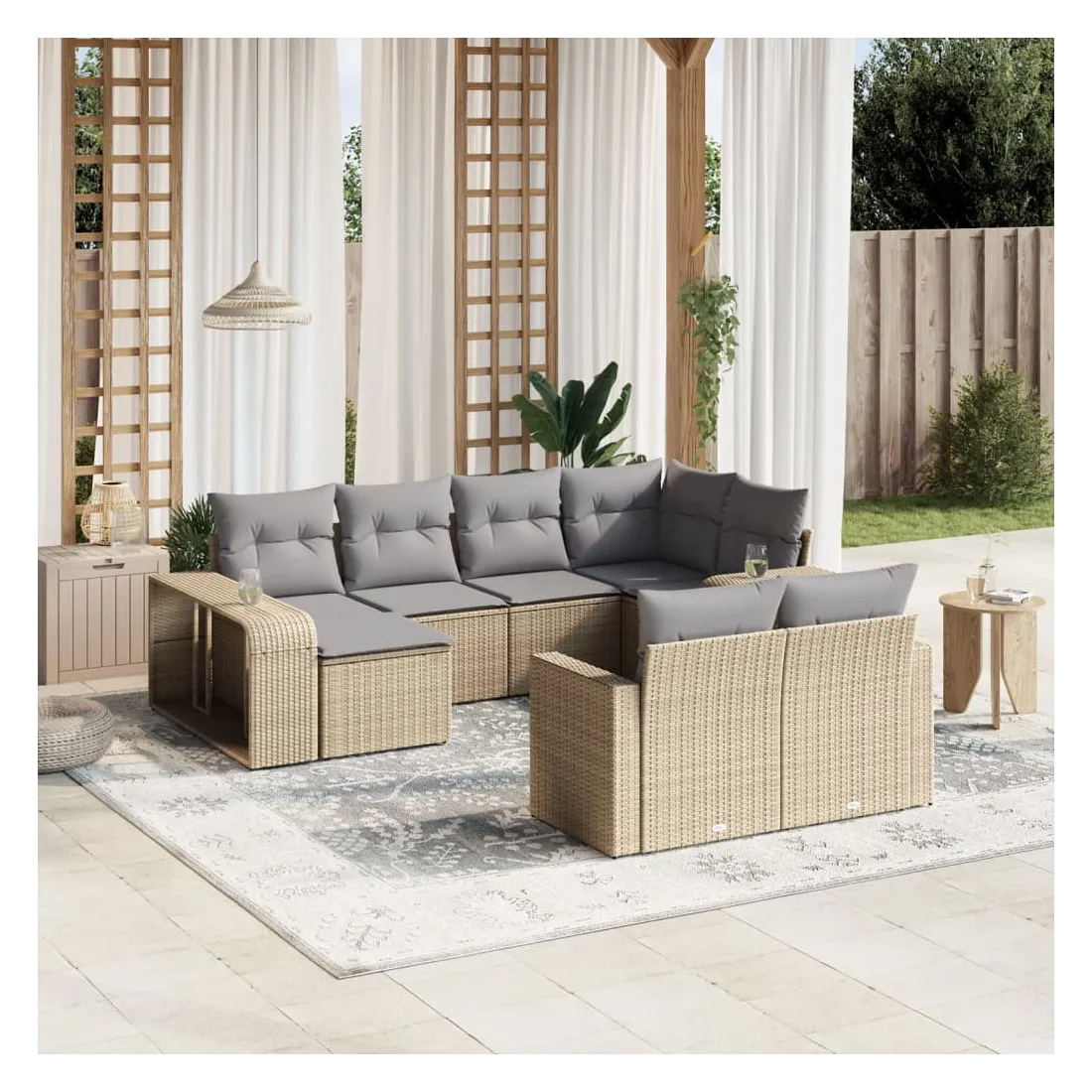 Cet ensemble de canapés de jardin est le complément parfait de votre arrière-cour, terrasse ou patio, offrant un espace confortable et accueillant pour discuter avec la famille et les amis ou simplement se détendre et profiter de l'extérieur. Matériau durable : la résine tressée, également connue sous le nom de poly rotin, est un matériau synthétique solide et nécessitant peu d'entretien qui ressemble au rotin naturel. Il est léger, facile à nettoyer et couramment utilisé pour les meubles d'extérieur en raison de sa durabilité et de ses propriétés de résistance aux intempéries.Fonction de rangement avec sac résistant à l'eau : chaque siège de jardin dispose d'un espace de rangement sous l'assise, complété par un sac résistant à l'eau pour ranger les coussins, les jouets et d'autres objets. Les sacs intérieurs sont dotés d'un couvercle et peuvent être solidement fixés aux sièges à l'aide de bandes auto-agrippantes pour plus de stabilité.Housse amovible et lavable : ces coussins de siège sont dotés de housses amovibles pour un lavage et un entretien faciles.Conception modulaire : cet ensemble de meubles d'extérieur a une conception modulaire, ce qui le rend complètement flexible et facile à déplacer, afin que vous puissiez créer un agencement de meubles d'extérieur personnalisé. Bon à savoir :Pour que vos meubles d'extérieur restent beaux, nous vous recommandons de les protéger avec une housse imperméable.