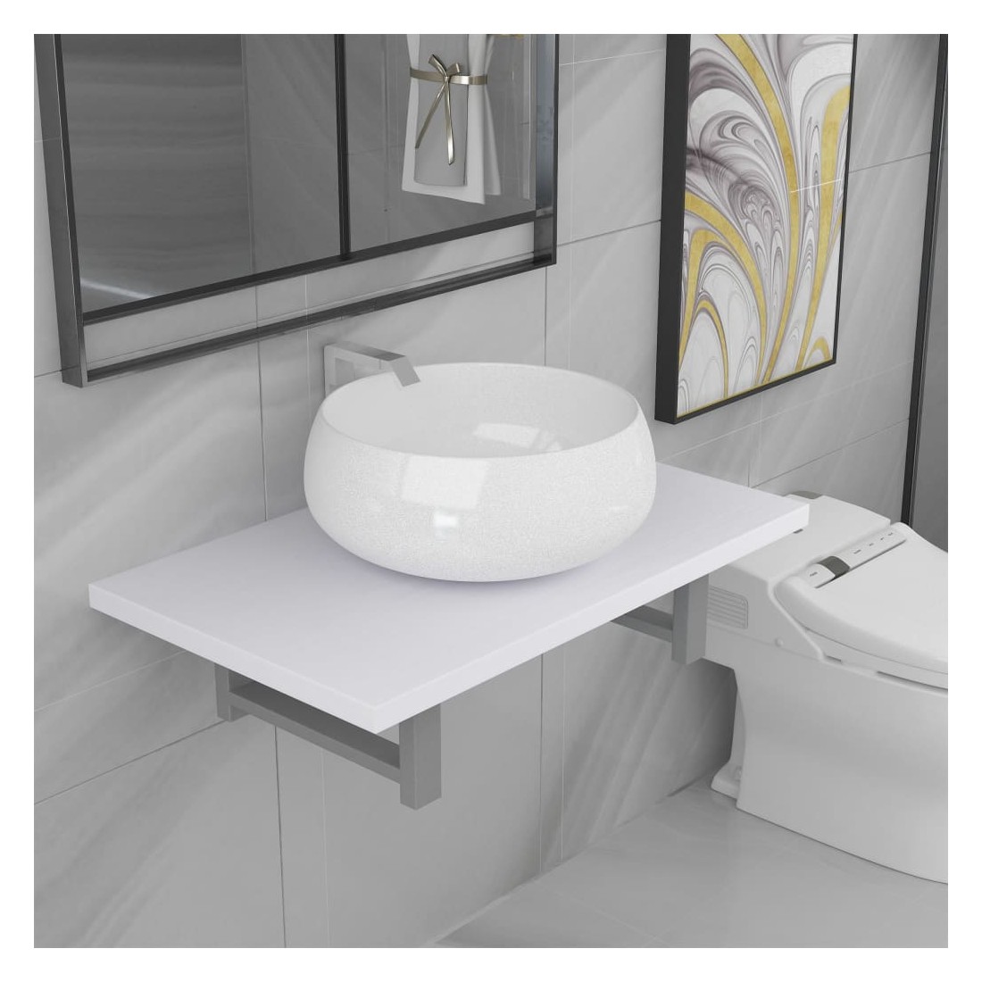 Notre ensemble de meubles de salle de bain pratique et intemporel se compose d'une étagère murale et d'un lavabo de forme ronde. Il fera un ajout élégant à toute salle de bain, salle d'eau ou toilette. Fabriquée dans un matériau solide, l'étagère murale de salle de bain est extrêmement stable et durable, ce qui en fait l'endroit idéal pour placer le lavabo en céramique inclus. Ce lavabo en céramique a une finition brillante et est facile à nettoyer avec un chiffon humide. De plus, les meubles de salle de bain peuvent être facilement installés sur le mur avec nos supports et matériaux de montage inclus. La combinaison parfaite de l'étagère murale et du lavabo sera le point d'attention de votre salle de bain ! Veuillez noter qu'aucun drain n'est inclus dans la livraison.