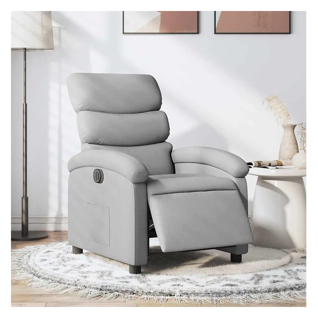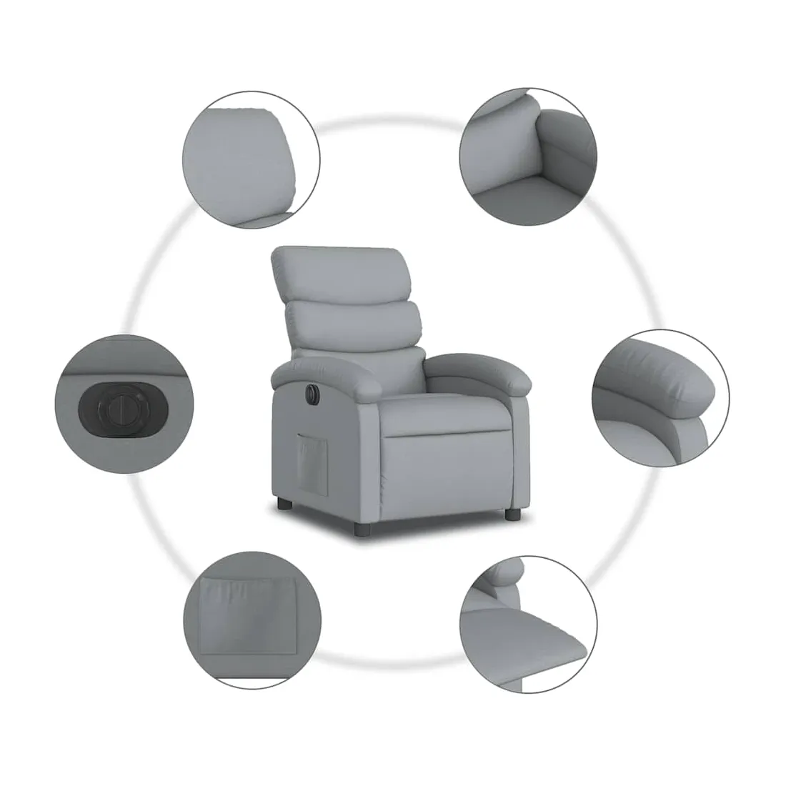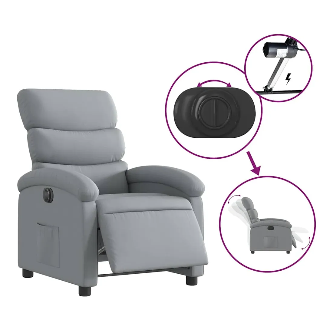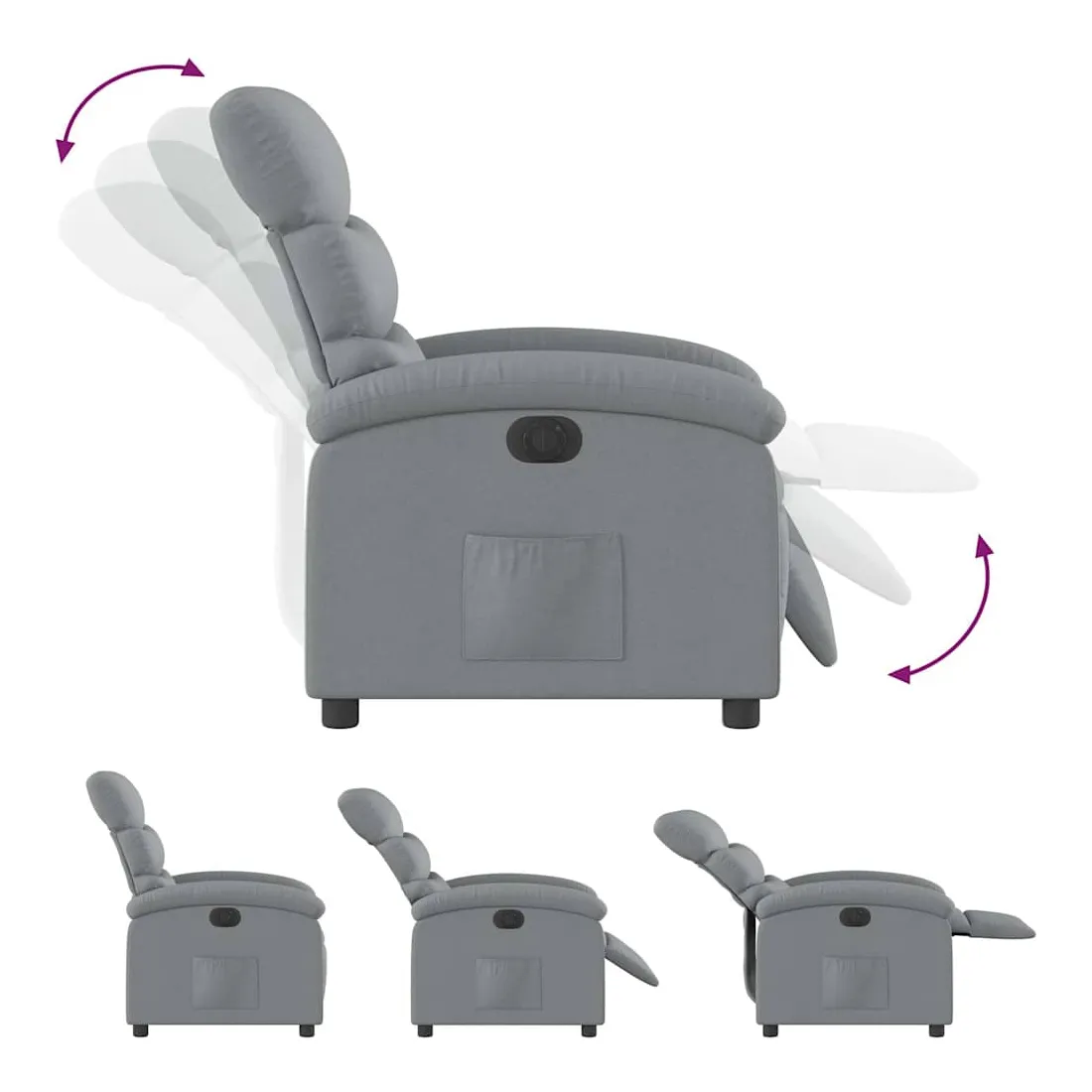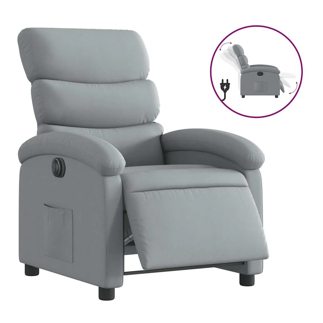 Asseyez-vous et détendez-vous dans ce fauteuil inclinable électrique très confortable ! Fonction d'inclinaison électrique : ce fauteuil inclinable est équipé d'un moteur électrique qui permet de régler automatiquement le repose-pied et le dossier dans n'importe quelle position, selon votre confort, en appuyant simplement sur le bouton situé sur le côté du fauteuil. Cette fonction permet une inclinaison maximale de 135 degrés. En outre, le dossier peut revenir automatiquement à sa position d'origine par une simple pression sur le bouton.Expérience d'assise confortable : le siège, le dossier et les larges accoudoirs bien rembourrés recouverts de tissu procurent une sensation confortable et chaleureuse, vous permettant de vous sentir enveloppé lorsque vous êtes assis. Le tissu présente un aspect simple et épuré et est respirant et durable.Poche latérale pratique : ce fauteuil est doté d'une poche latérale pour vous permettre de garder vos objets essentiels à portée de main.Cadre solide et stable : le cadre en bois et en métal offre une structure solide et une grande stabilité. Ce fauteuil inclinable est confortable et durable.