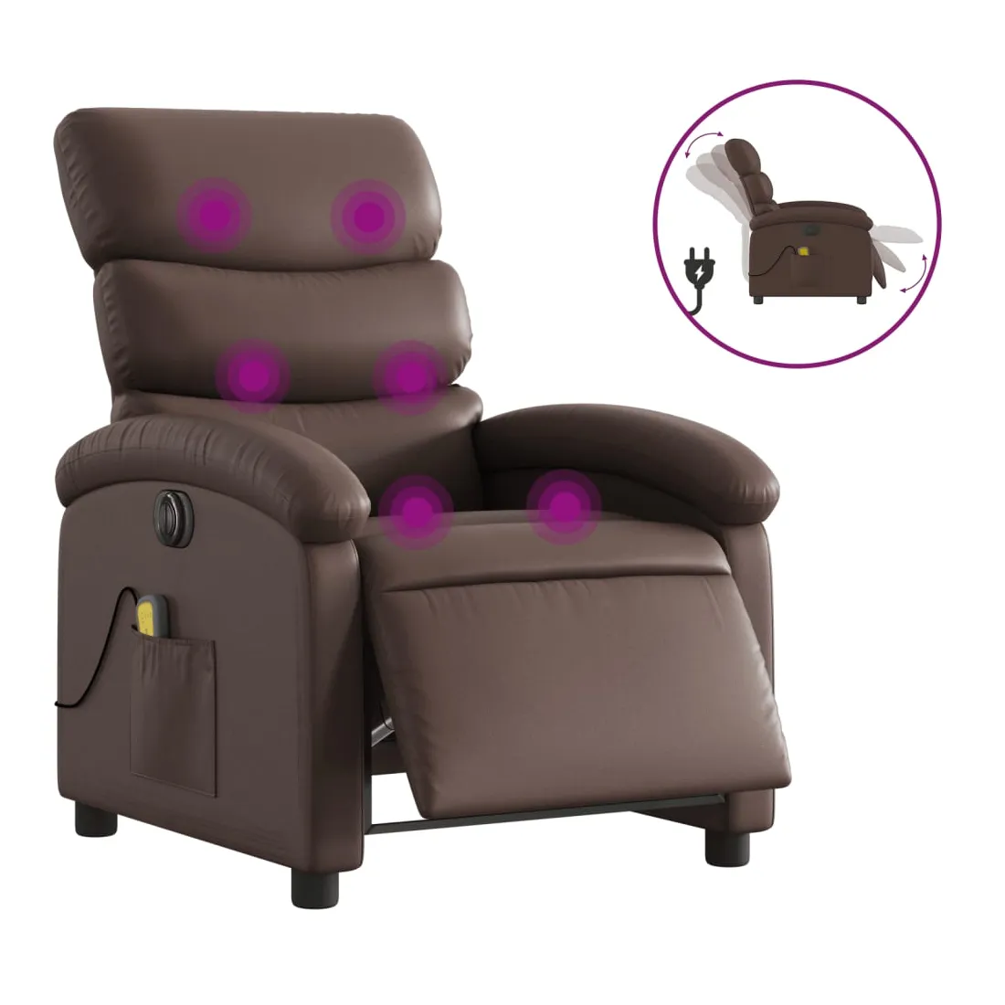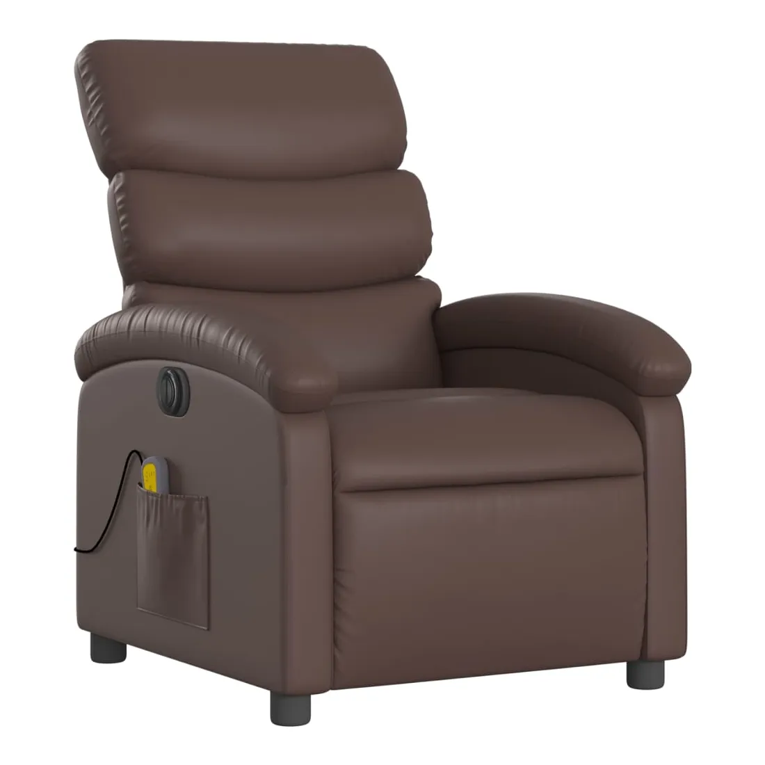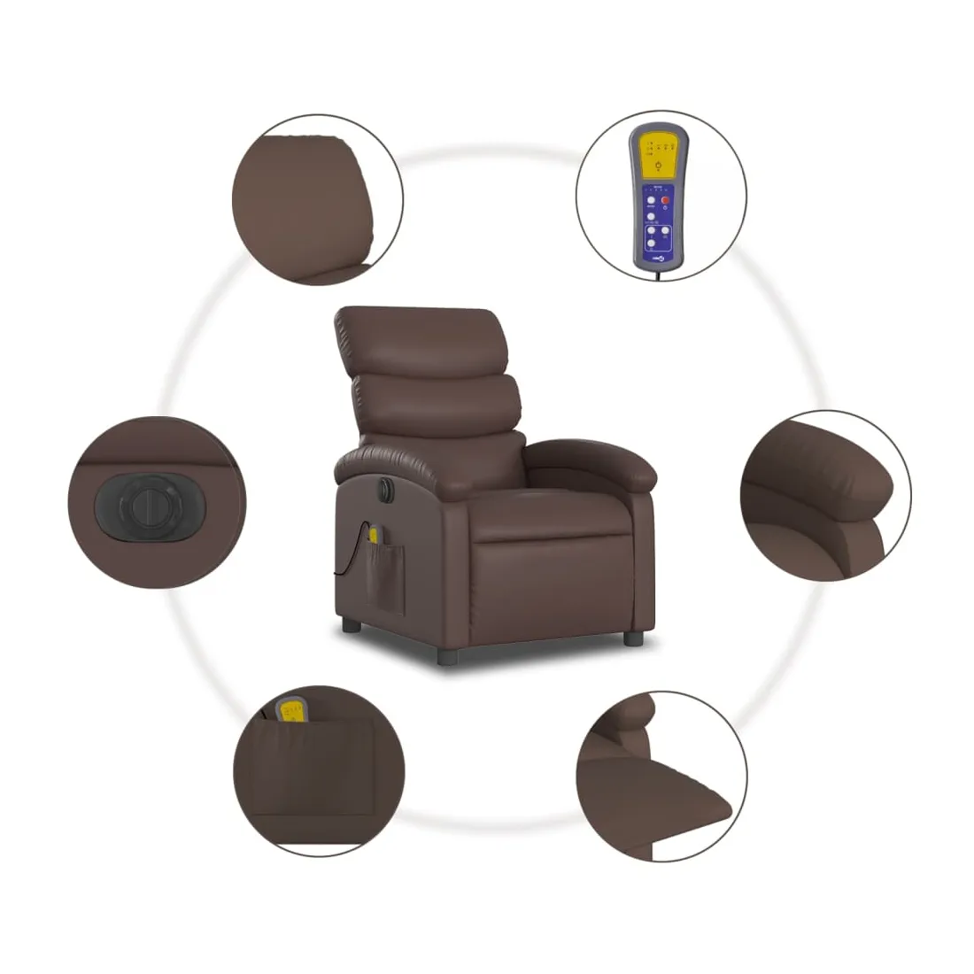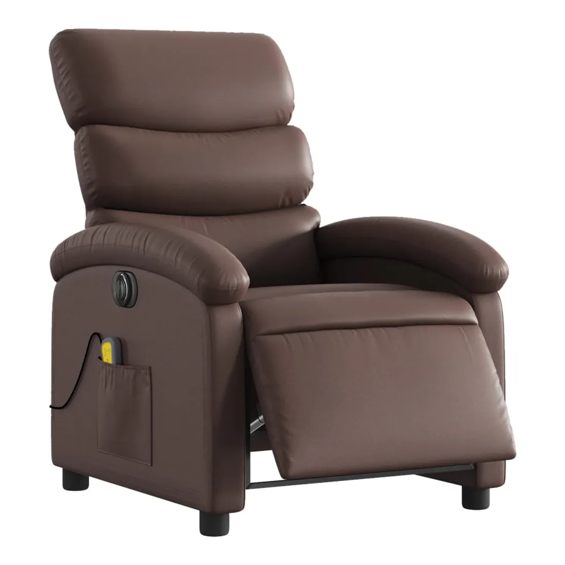 vidaXLAsseyez-vous et détendez-vous dans ce fauteuil inclinable de massage électrique très confortable ! Fonction d'inclinaison électrique : ce fauteuil inclinable est équipé d'un moteur électrique qui permet de régler automatiquement le repose-pied et le dossier dans n'importe quelle position, selon votre confort, en appuyant simplement sur le bouton situé sur le côté du fauteuil. Cette fonction permet une inclinaison maximale de 135 degrés. En outre, le dossier peut revenir automatiquement à sa position d'origine par une simple pression sur le bouton.Fonction de vibration : les 6 points de massage vous permettent de faire l'expérience d'un massage mieux ciblé. De plus, la télécommande incluse vous permet de choisir différents programmes de massage. La fonction de massage est alimentée par le connecteur USB qui nécessite une source d'alimentation USB certifiée de 5 V (non fournie).Expérience de siège confortable : le siège, le dossier et les larges accoudoirs rembourrés épais recouverts de similicuir procurent une sensation confortable, vous faisant vous sentir enlacé lorsque vous êtes assis. Le similicuir est un matériau très résistant. Il est résistant aux taches, ce qui le rend facile à nettoyer avec un chiffon humide. La surface lisse donne également un aspect luxueux et la beauté du cuir véritable.Poche latérale pratique : ce fauteuil est doté d'une poche latérale pour ranger votre télécommande ou garder vos objets essentiels à portée de main.Cadre solide et stable : le cadre en bois et en métal offre une structure solide et une grande stabilité. Ce fauteuil inclinable est confortable et durable.