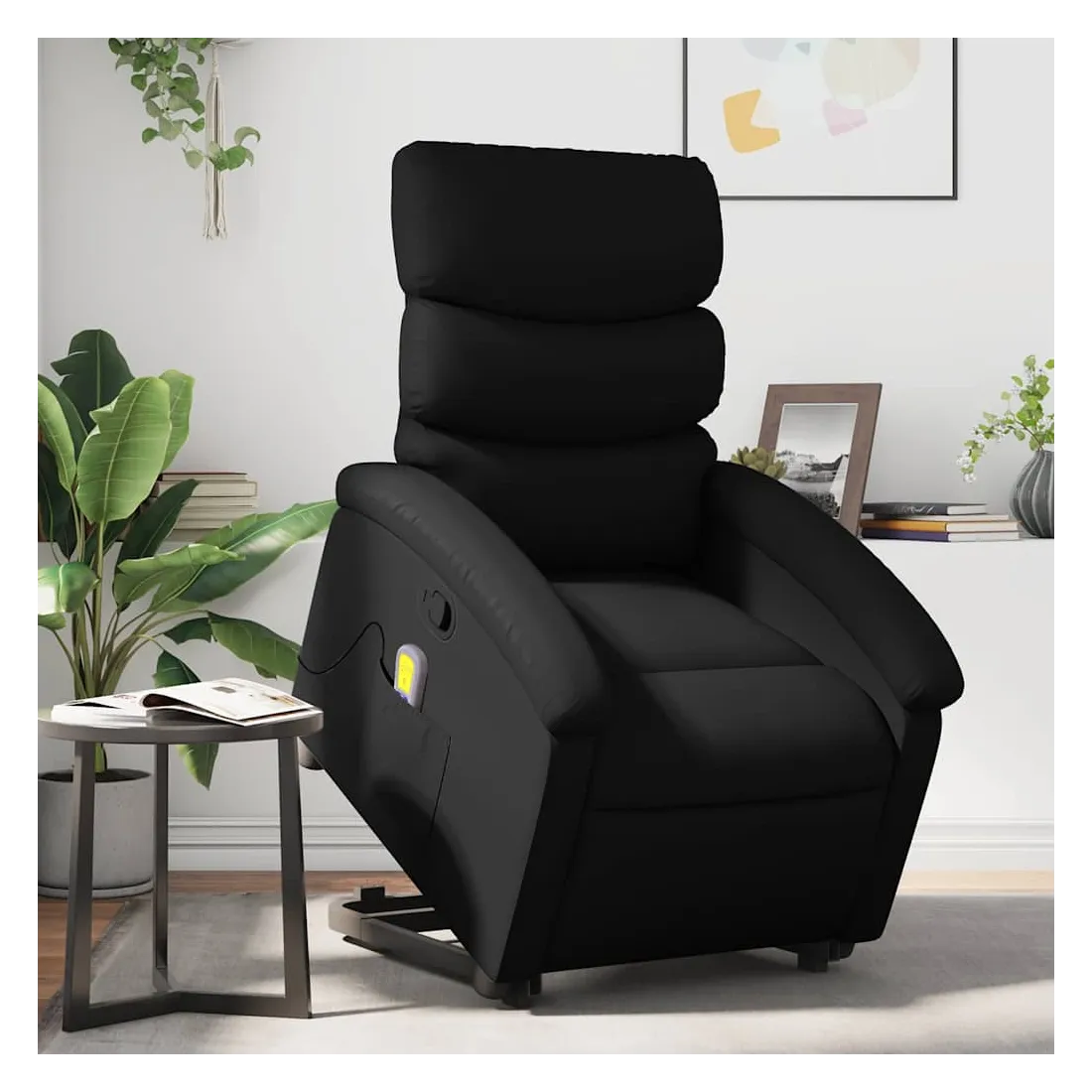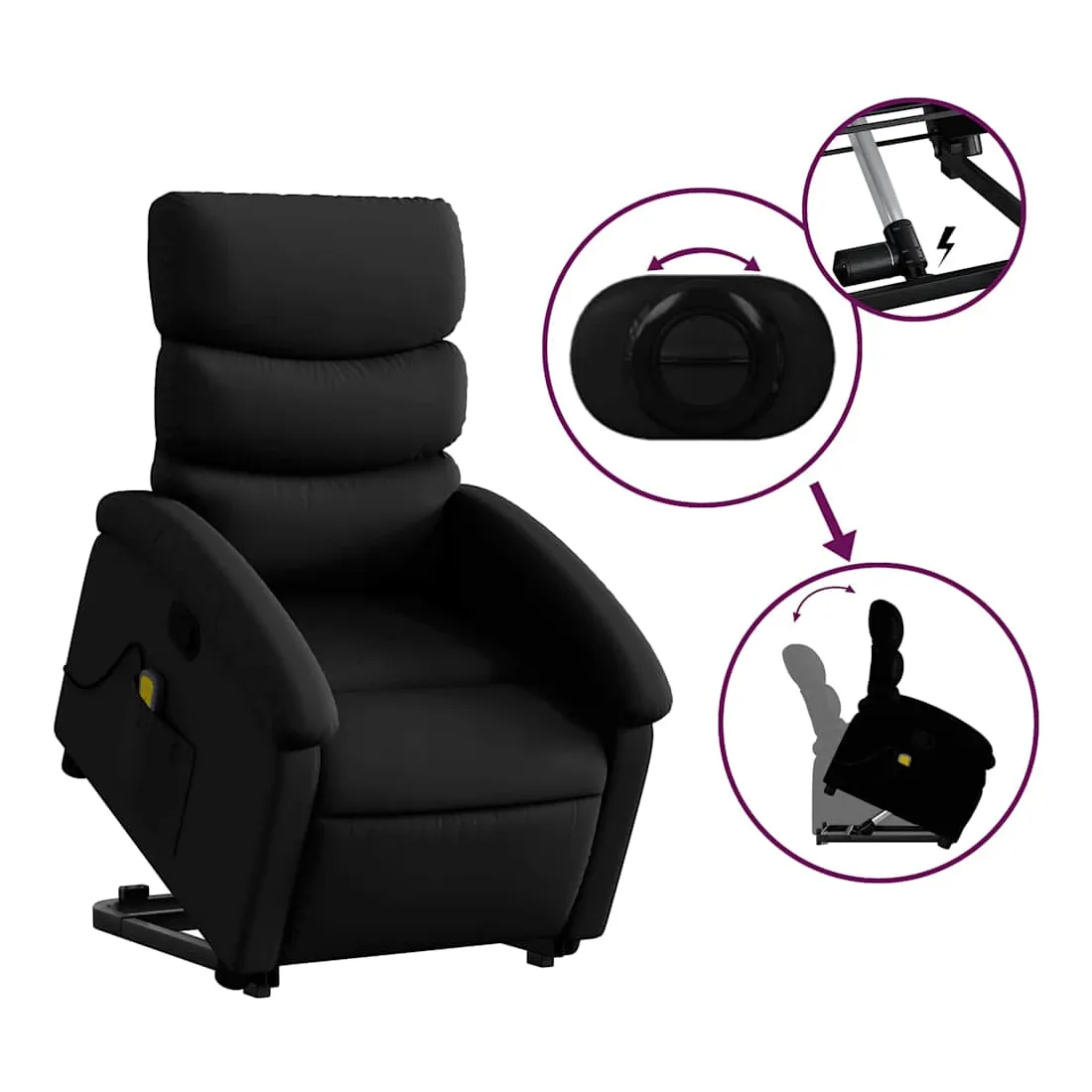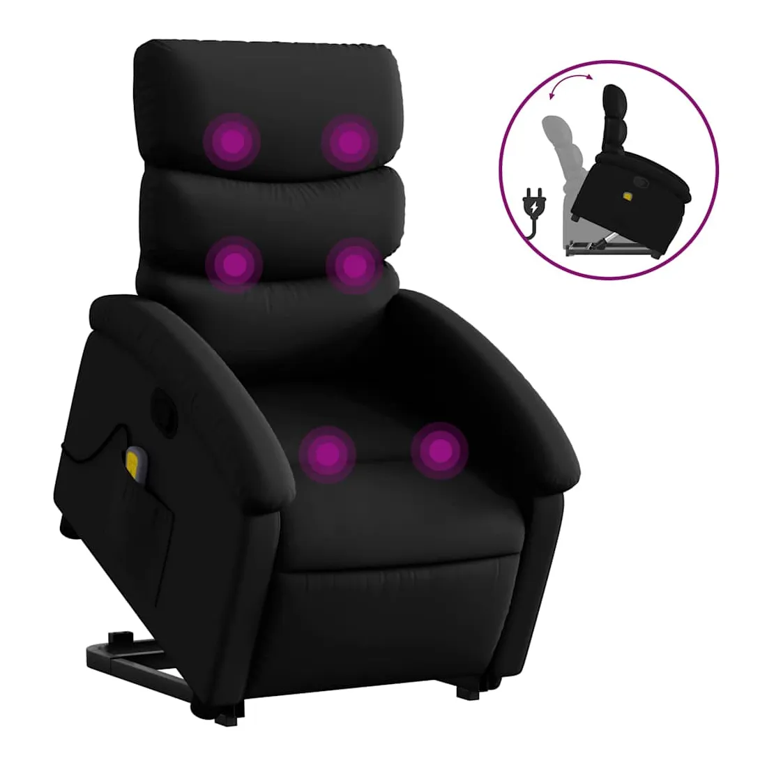 Asseyez-vous et détendez-vous dans ce fauteuil inclinable de massage très confortable ! Fonction de levage électrique : ce fauteuil inclinable pour personnes âgées est équipé d'un moteur électrique pour la fonction de levage. Grâce à la fonction qui pousse toute la chaise vers le haut, vous pouvez facilement vous tenir debout sans stresser votre dos et vos genoux en appuyant simplement sur le bouton.Fonction d'inclinaison manuelle : ce fauteuil inclinable est doté d'une poignée du côté droit. Vous pouvez régler manuellement le repose-pieds et le dossier dans n'importe quelle position selon votre confort en tirant simplement sur la poignée. Cette fonction permet une inclinaison maximale de 135 degrés. De plus, le dossier peut revenir rapidement à sa position d'origine en tirant simplement sur la poignée.Fonction de vibration : les 6 points de massage vous permettent de faire l'expérience d'un massage mieux ciblé. De plus, la télécommande incluse vous permet de choisir différents programmes de massage. La fonction de massage est alimentée par le connecteur USB qui nécessite une source d'alimentation USB certifiée de 5 V (non fournie).Expérience de siège confortable : le siège, le dossier et les larges accoudoirs rembourrés épais recouverts de similicuir procurent une sensation confortable, vous faisant vous sentir enlacé lorsque vous êtes assis. Le similicuir est un matériau très résistant. Il est résistant aux taches, ce qui le rend facile à nettoyer avec un chiffon humide. La surface lisse donne également un aspect luxueux et la beauté du cuir véritable.Poche latérale pratique : ce fauteuil est doté d'une poche latérale pour ranger votre télécommande ou garder vos objets essentiels à portée de main.Cadre solide et stable : le cadre en bois et en métal offre une structure solide et une grande stabilité. Ce fauteuil inclinable est confortable et durable.