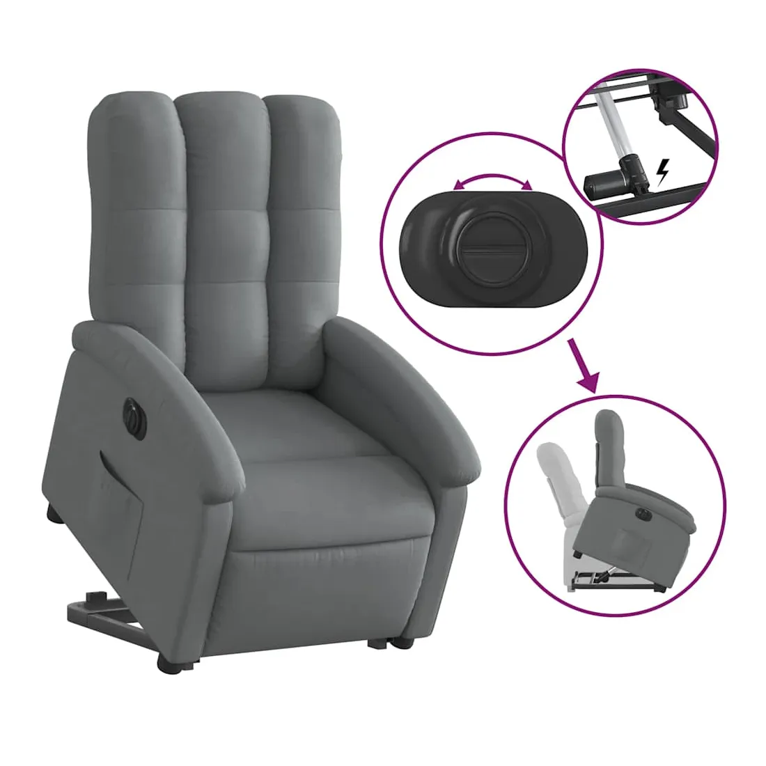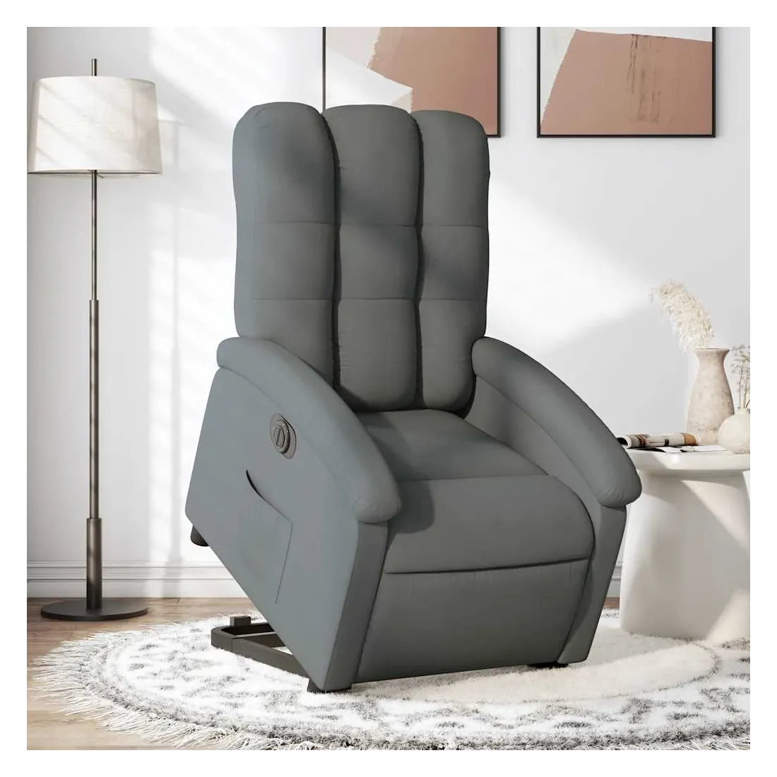 Asseyez-vous et détendez-vous dans ce fauteuil inclinable électrique très confortable ! Fonction de levage électrique : ce fauteuil inclinable pour personnes âgées est équipé d'un moteur électrique pour la fonction de levage. Grâce à la fonction qui pousse toute la chaise vers le haut, vous pouvez facilement vous tenir debout sans stresser votre dos et vos genoux en appuyant simplement sur le bouton.Fonction d'inclinaison électrique : ce fauteuil inclinable est également équipé d'un moteur électrique qui permet de régler automatiquement le repose-pied et le dossier dans n'importe quelle position, selon votre confort, en appuyant simplement sur le bouton situé sur le côté du fauteuil. Cette fonction permet une inclinaison maximale de 135 degrés. En outre, le dossier peut revenir automatiquement à sa position d'origine par une simple pression sur le bouton.Expérience d'assise confortable : le siège, le dossier et les larges accoudoirs bien rembourrés recouverts de tissu procurent une sensation confortable et chaleureuse, vous permettant de vous sentir enveloppé lorsque vous êtes assis. Le tissu présente un aspect simple et épuré et est respirant et durable.Poche latérale pratique : ce fauteuil est doté d'une poche latérale pour vous permettre de garder vos objets essentiels à portée de main.Cadre solide et stable : le cadre en bois et en métal offre une structure solide et une grande stabilité. Ce fauteuil inclinable est confortable et durable.