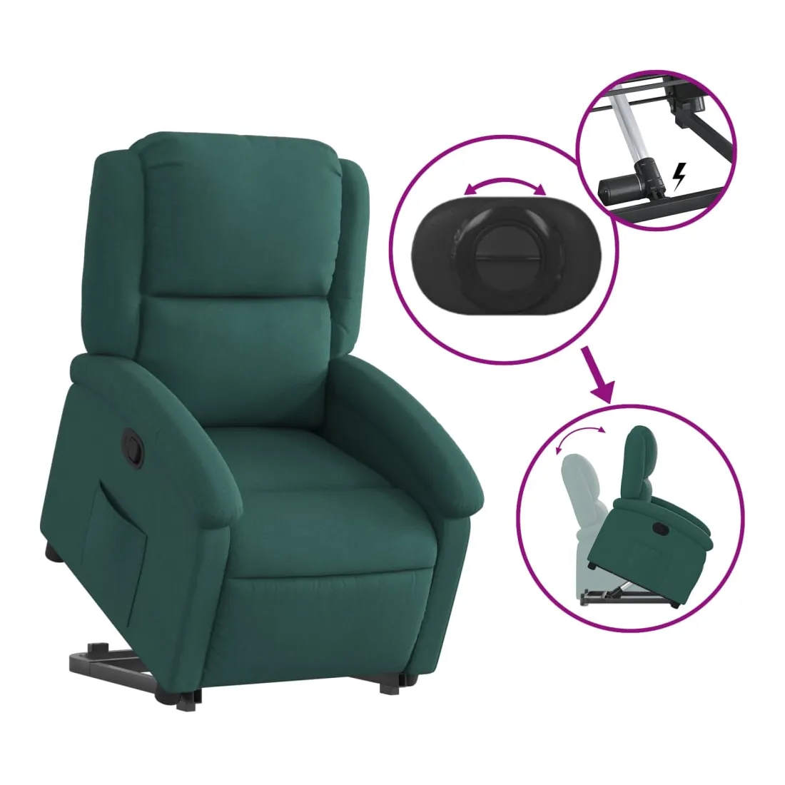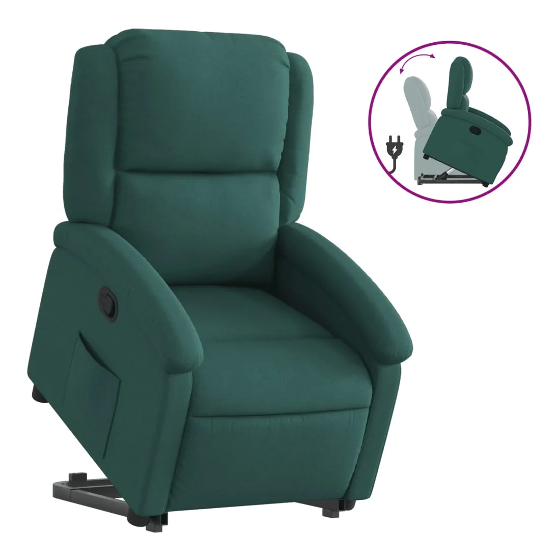 Asseyez-vous et détendez-vous dans ce fauteuil inclinable très confortable ! Fonction de levage électrique : ce fauteuil inclinable pour personnes âgées est équipé d'un moteur électrique pour la fonction de levage. Grâce à la fonction qui pousse toute la chaise vers le haut, vous pouvez facilement vous tenir debout sans stresser votre dos et vos genoux en appuyant simplement sur le bouton.Fonction d'inclinaison manuelle : ce fauteuil inclinable est doté d'une poignée du côté droit. Vous pouvez régler manuellement le repose-pieds et le dossier dans n'importe quelle position selon votre confort en tirant simplement sur la poignée. Cette fonction permet une inclinaison maximale de 135 degrés. De plus, le dossier peut revenir rapidement à sa position d'origine en tirant simplement sur la poignée.Expérience d'assise confortable : le siège, le dossier et les larges accoudoirs bien rembourrés recouverts de tissu procurent une sensation confortable et chaleureuse, vous permettant de vous sentir enveloppé lorsque vous êtes assis. Le tissu présente un aspect simple et épuré et est respirant et durable.Poche latérale pratique : ce fauteuil est doté d'une poche latérale pour vous permettre de garder vos objets essentiels à portée de main.Cadre solide et stable : le cadre en bois et en métal offre une structure solide et une grande stabilité. Ce fauteuil inclinable est confortable et durable.