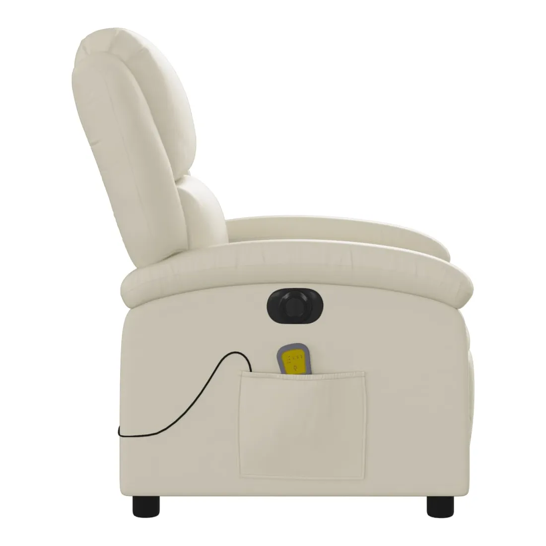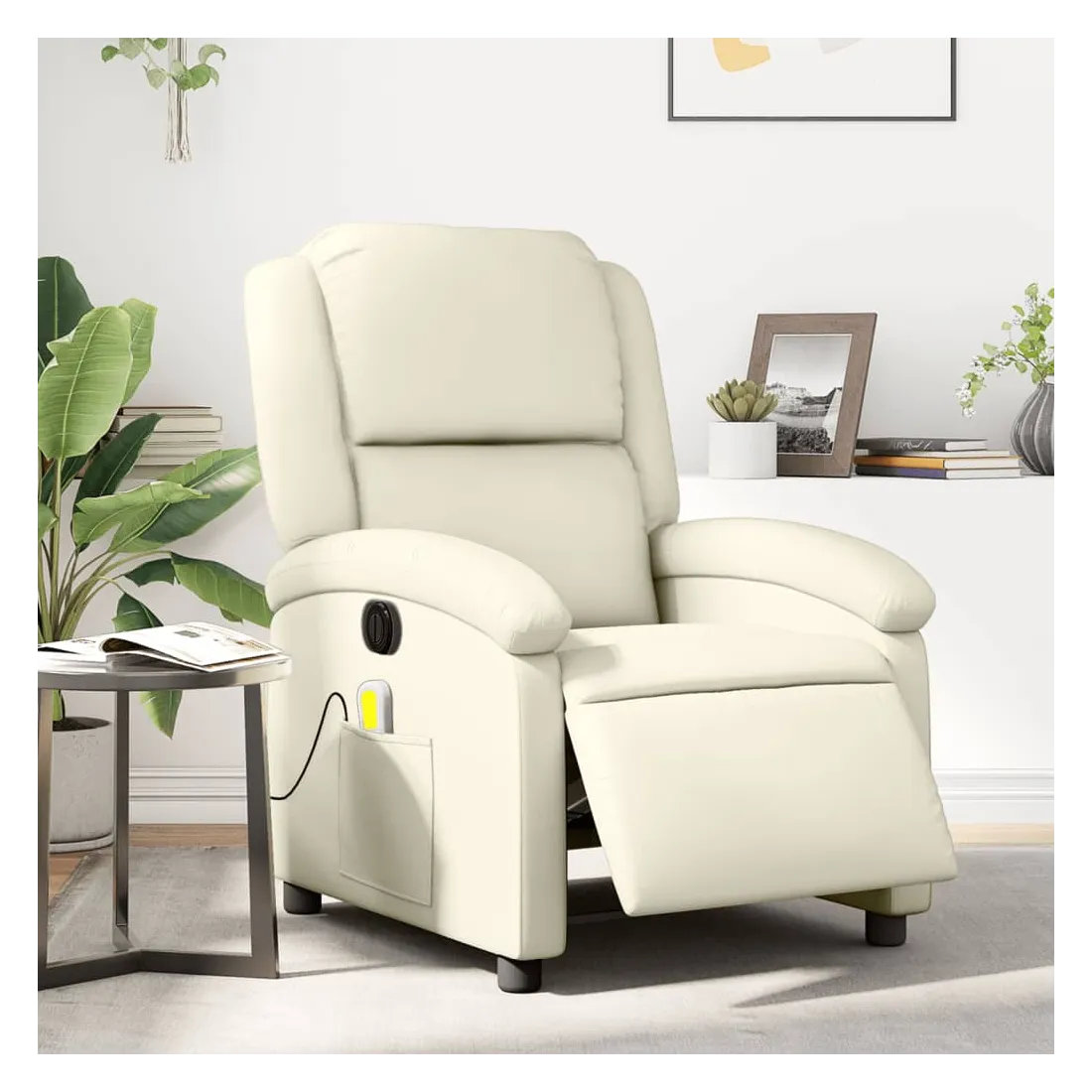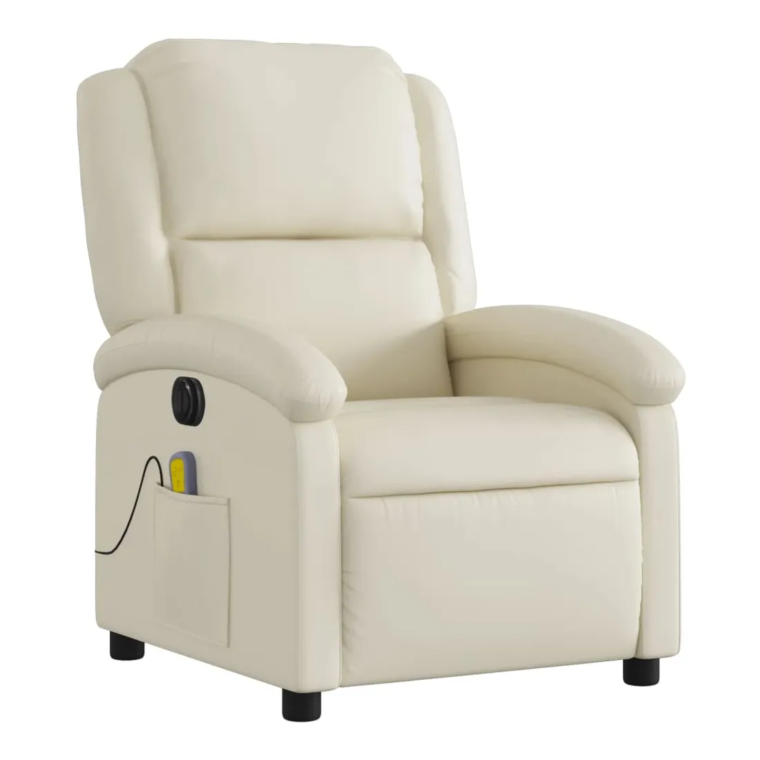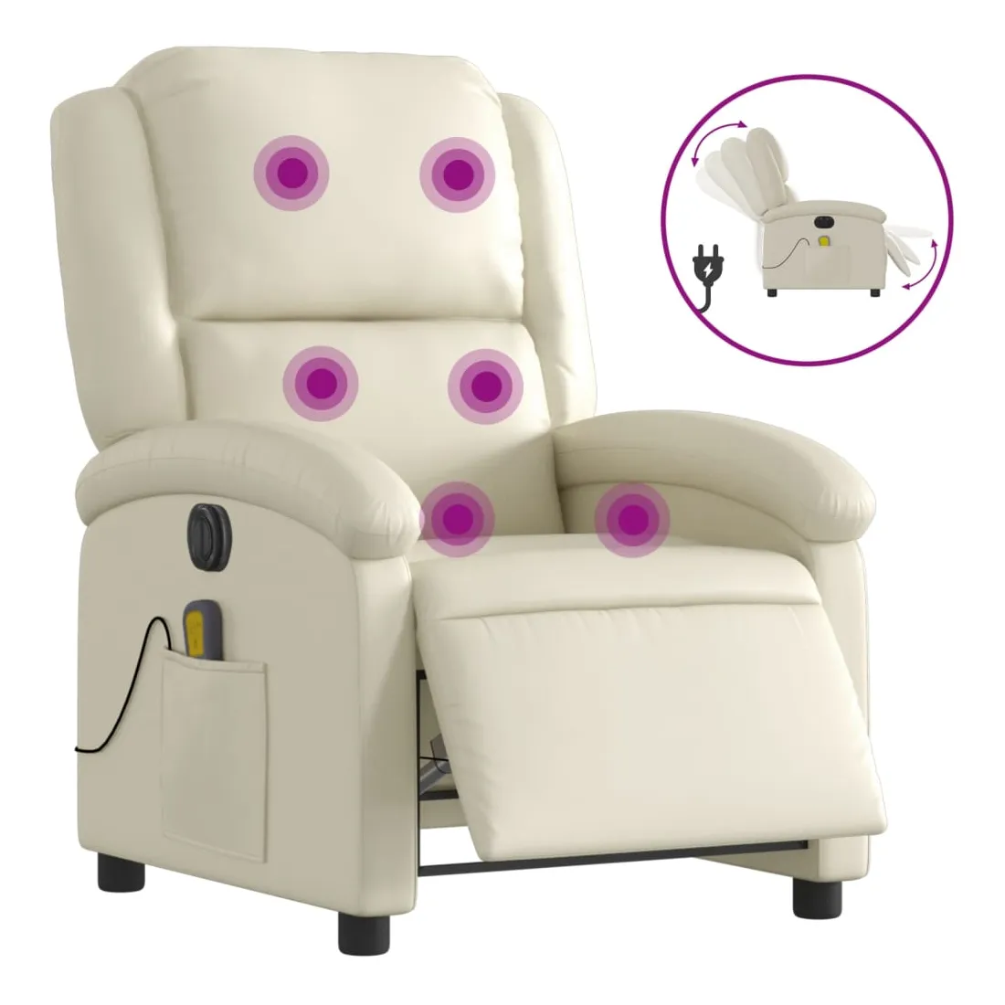 Asseyez-vous et détendez-vous dans ce fauteuil inclinable de massage électrique très confortable ! Fonction d'inclinaison électrique : ce fauteuil inclinable est équipé d'un moteur électrique qui permet de régler automatiquement le repose-pied et le dossier dans n'importe quelle position, selon votre confort, en appuyant simplement sur le bouton situé sur le côté du fauteuil. Cette fonction permet une inclinaison maximale de 135 degrés. En outre, le dossier peut revenir automatiquement à sa position d'origine par une simple pression sur le bouton.Fonction de vibration : les 6 points de massage vous permettent de faire l'expérience d'un massage mieux ciblé. De plus, la télécommande incluse vous permet de choisir différents programmes de massage. La fonction de massage est alimentée par le connecteur USB qui nécessite une source d'alimentation USB certifiée de 5 V (non fournie).Expérience de siège confortable : le siège, le dossier et les larges accoudoirs rembourrés épais recouverts de similicuir procurent une sensation confortable, vous faisant vous sentir enlacé lorsque vous êtes assis. Le similicuir est un matériau très résistant. Il est résistant aux taches, ce qui le rend facile à nettoyer avec un chiffon humide. La surface lisse donne également un aspect luxueux et la beauté du cuir véritable.Poche latérale pratique : ce fauteuil est doté d'une poche latérale pour ranger votre télécommande ou garder vos objets essentiels à portée de main.Cadre solide et stable : le cadre en bois et en métal offre une structure solide et une grande stabilité. Ce fauteuil inclinable est confortable et durable.