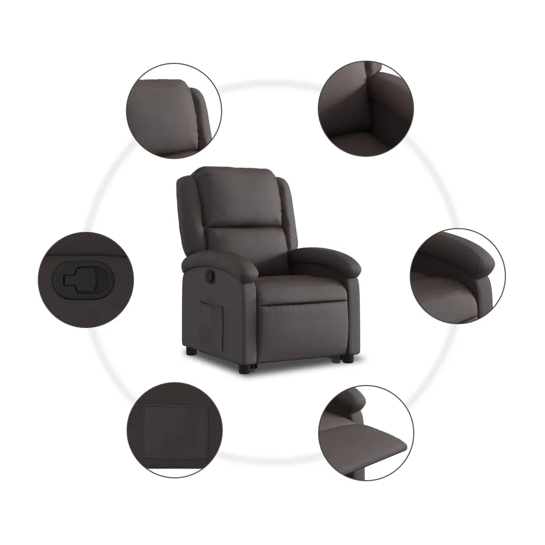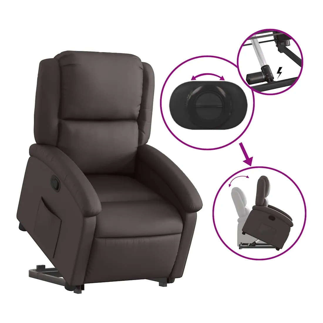 Asseyez-vous et détendez-vous dans ce fauteuil inclinable très confortable ! Fonction de levage électrique : ce fauteuil inclinable pour personnes âgées est équipé d'un moteur électrique pour la fonction de levage. Grâce à la fonction qui pousse toute la chaise vers le haut, vous pouvez facilement vous tenir debout sans stresser votre dos et vos genoux en appuyant simplement sur le bouton.Fonction d'inclinaison manuelle : ce fauteuil inclinable est doté d'une poignée du côté droit. Vous pouvez régler manuellement le repose-pieds et le dossier dans n'importe quelle position selon votre confort en tirant simplement sur la poignée. Cette fonction permet une inclinaison maximale de 135 degrés. De plus, le dossier peut revenir rapidement à sa position d'origine en tirant simplement sur la poignée.Expérience de siège confortable : le siège, le dossier et les larges accoudoirs rembourrés épais recouverts de cuir véritable procurent une sensation confortable et chaleureuse, vous faisant vous sentir enlacé lorsque vous êtes assis. Le cuir véritable est un matériau naturellement intemporel. Il peut durer toute une vie avec des soins et un entretien appropriés. La surface lisse lui donne également un aspect élégant tout en garantissant un confort optimal.Poche latérale pratique : ce fauteuil est doté d'une poche latérale pour vous permettre de garder vos objets essentiels à portée de main.Cadre solide et stable : le cadre en bois et en métal offre une structure solide et une grande stabilité. Ce fauteuil inclinable est confortable et durable.