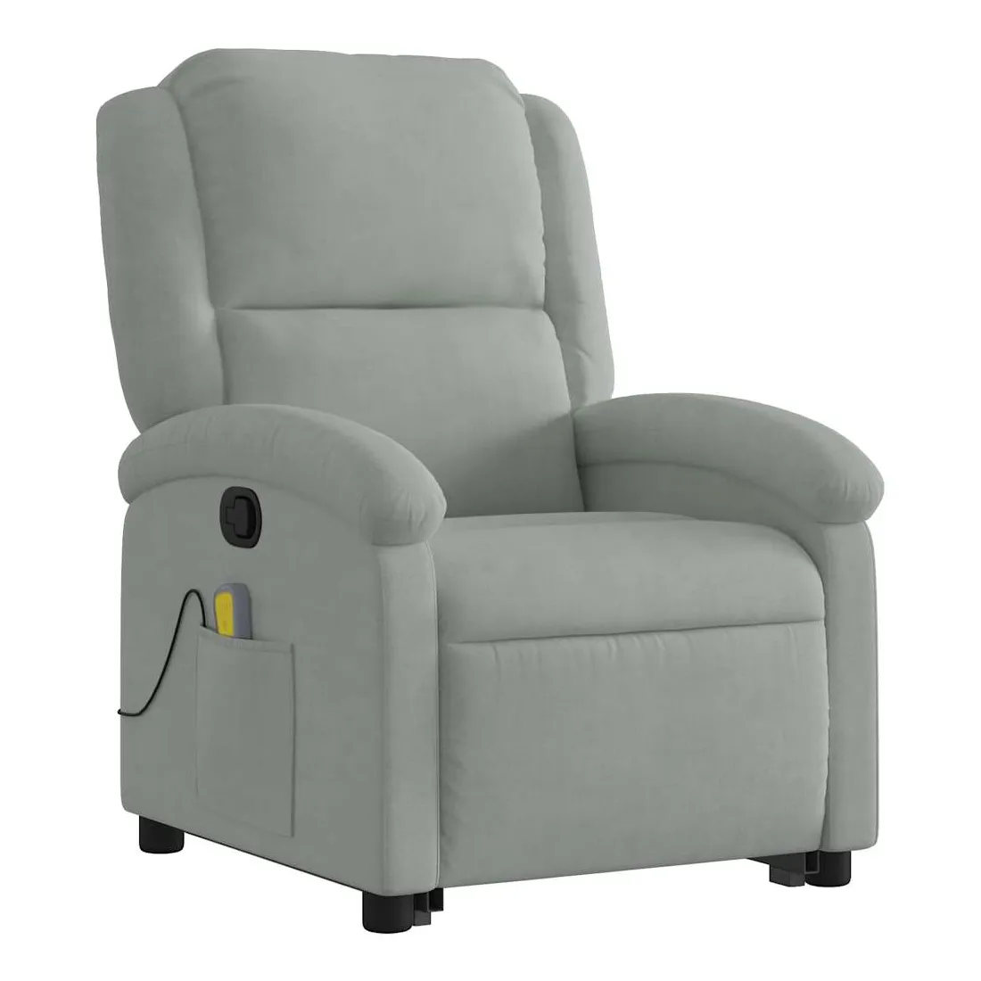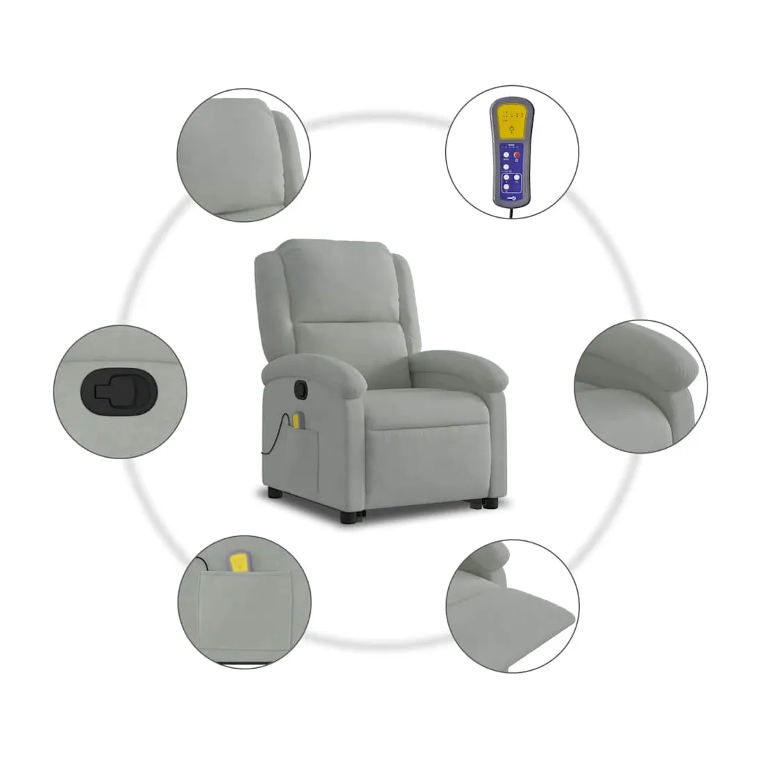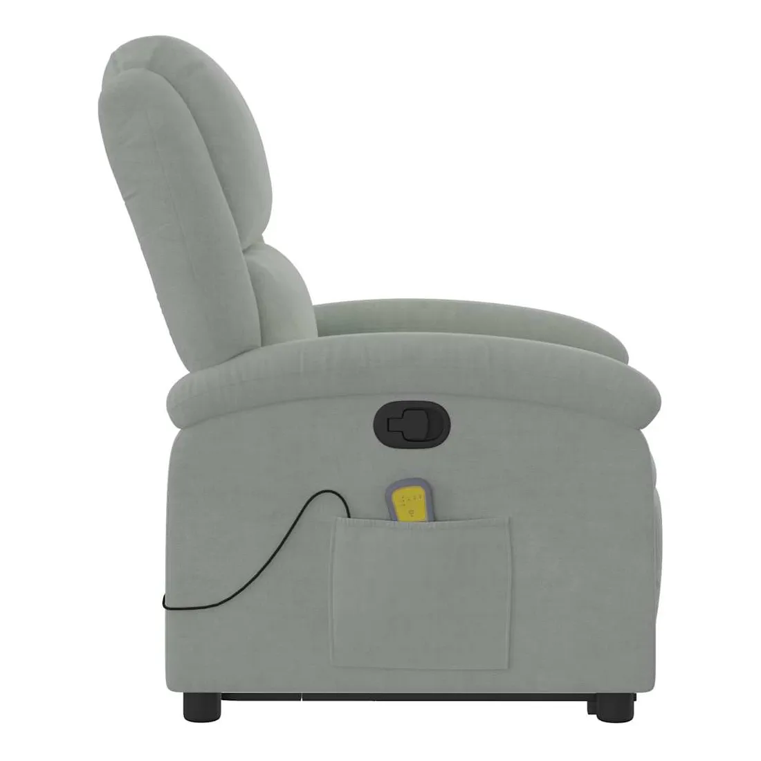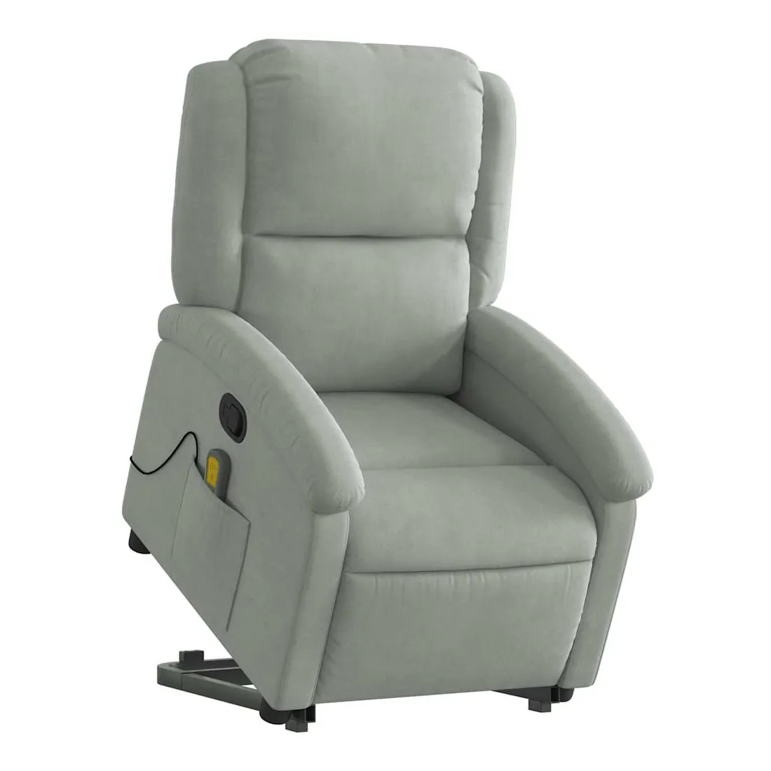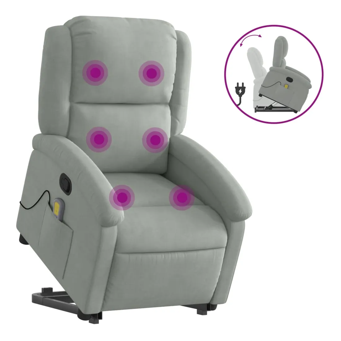 Asseyez-vous et détendez-vous dans ce fauteuil inclinable de massage très confortable ! Fonction de levage électrique : ce fauteuil inclinable pour personnes âgées est équipé d'un moteur électrique pour la fonction de levage. Grâce à la fonction qui pousse toute la chaise vers le haut, vous pouvez facilement vous tenir debout sans stresser votre dos et vos genoux en appuyant simplement sur le bouton.Fonction d'inclinaison manuelle : ce fauteuil inclinable est doté d'une poignée du côté droit. Vous pouvez régler manuellement le repose-pieds et le dossier dans n'importe quelle position selon votre confort en tirant simplement sur la poignée. Cette fonction permet une inclinaison maximale de 135 degrés. De plus, le dossier peut revenir rapidement à sa position d'origine en tirant simplement sur la poignée.Fonction de vibration : les 6 points de massage vous permettent de faire l'expérience d'un massage mieux ciblé. De plus, la télécommande incluse vous permet de choisir différents programmes de massage. La fonction de massage est alimentée par le connecteur USB qui nécessite une source d'alimentation USB certifiée de 5 V (non fournie).Expérience d'assise confortable : le siège, le dossier et les larges accoudoirs rembourrés épais recouverts de velours procurent une sensation confortable et chaleureuse, vous faisant vous sentir enlacé lorsque vous êtes assis. Le velours est un tissu doux et confortable qui est agréable sur la peau.Poche latérale pratique : ce fauteuil est doté d'une poche latérale pour ranger votre télécommande ou garder vos objets essentiels à portée de main.Cadre solide et stable : le cadre en bois et en métal offre une structure solide et une grande stabilité. Ce fauteuil inclinable est confortable et durable.
