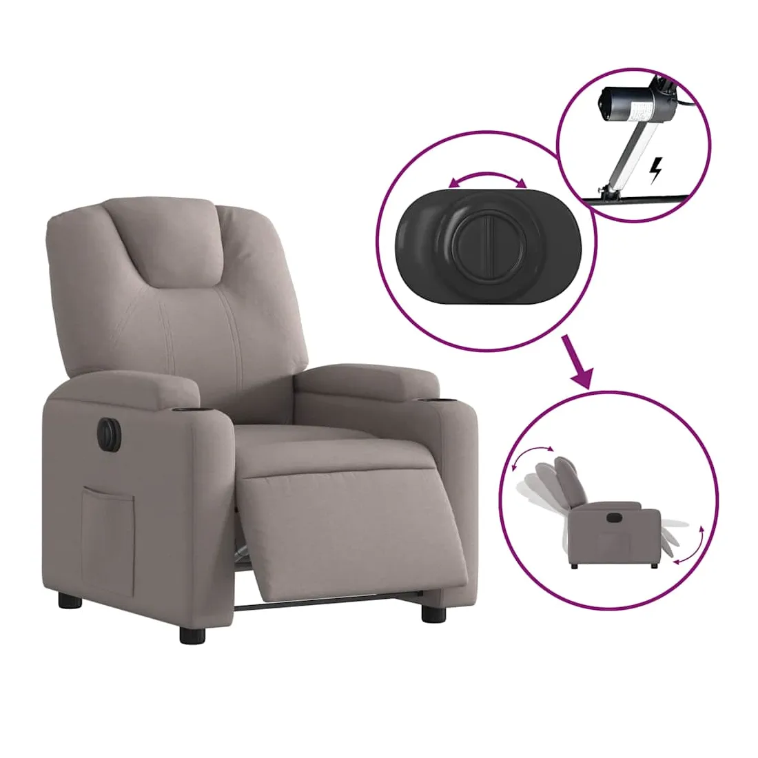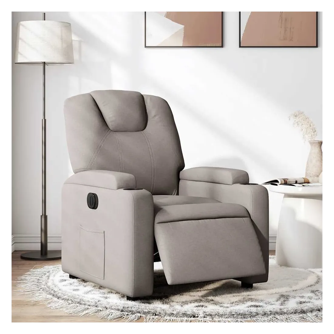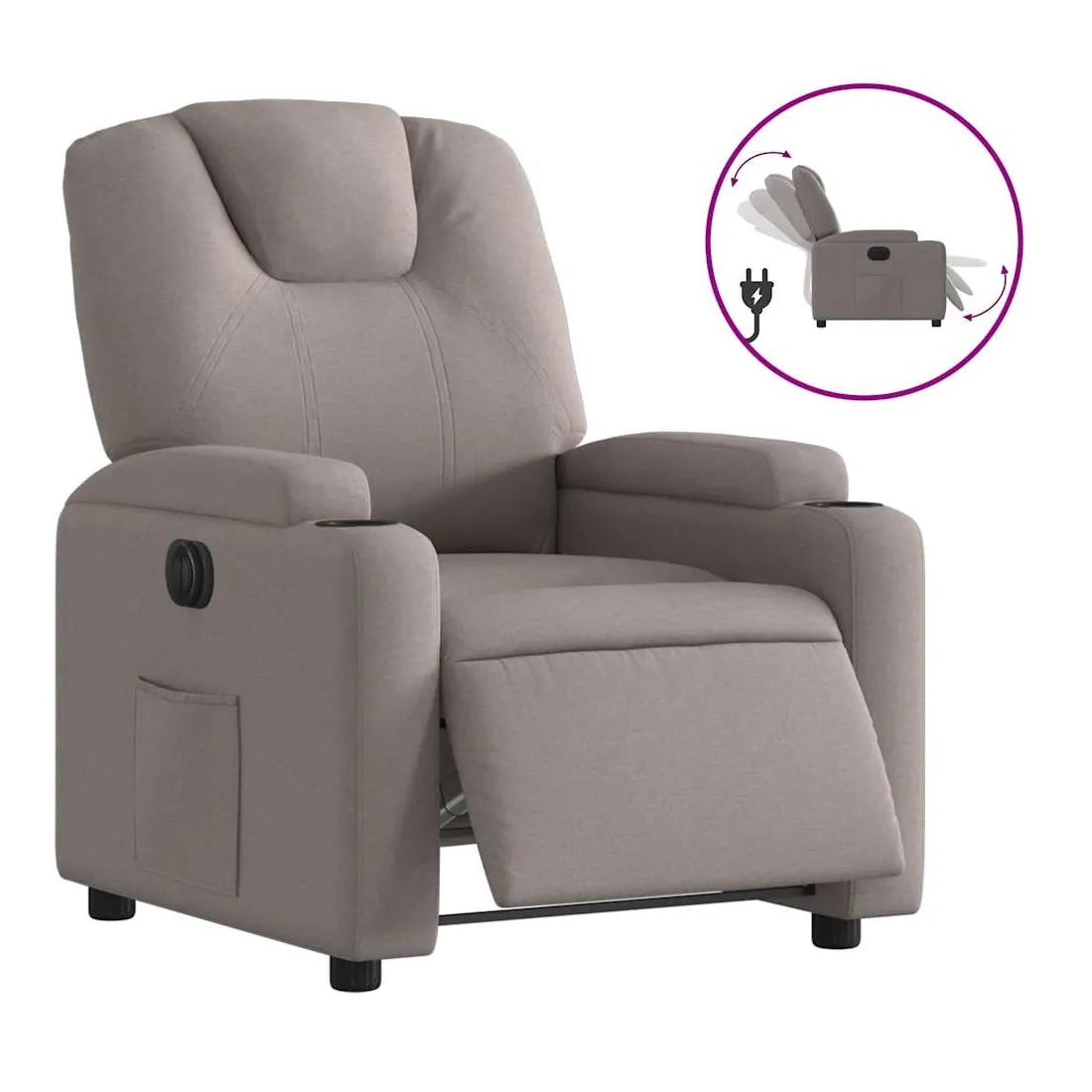 Asseyez-vous et détendez-vous dans ce fauteuil inclinable électrique très confortable ! Fonction d'inclinaison électrique : ce fauteuil inclinable est équipé d'un moteur électrique qui permet de régler automatiquement le repose-pied et le dossier dans n'importe quelle position, selon votre confort, en appuyant simplement sur le bouton situé sur le côté du fauteuil. Cette fonction permet une inclinaison maximale de 135 degrés. En outre, le dossier peut revenir automatiquement à sa position d'origine par une simple pression sur le bouton.Expérience d'assise confortable : le siège, le dossier et les larges accoudoirs bien rembourrés recouverts de tissu procurent une sensation confortable et chaleureuse, vous permettant de vous sentir enveloppé lorsque vous êtes assis. Le tissu présente un aspect simple et épuré et est respirant et durable.Porte-gobelets et poche latérale pratiques : ce fauteuil dispose de deux porte-gobelets pratiques pour vos boissons et d'une poche latérale pour garder vos objets essentiels à portée de main.Cadre solide et stable : le cadre en bois et en métal offre une structure solide et une grande stabilité. Ce fauteuil inclinable est confortable et durable.