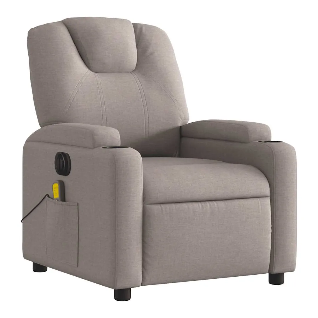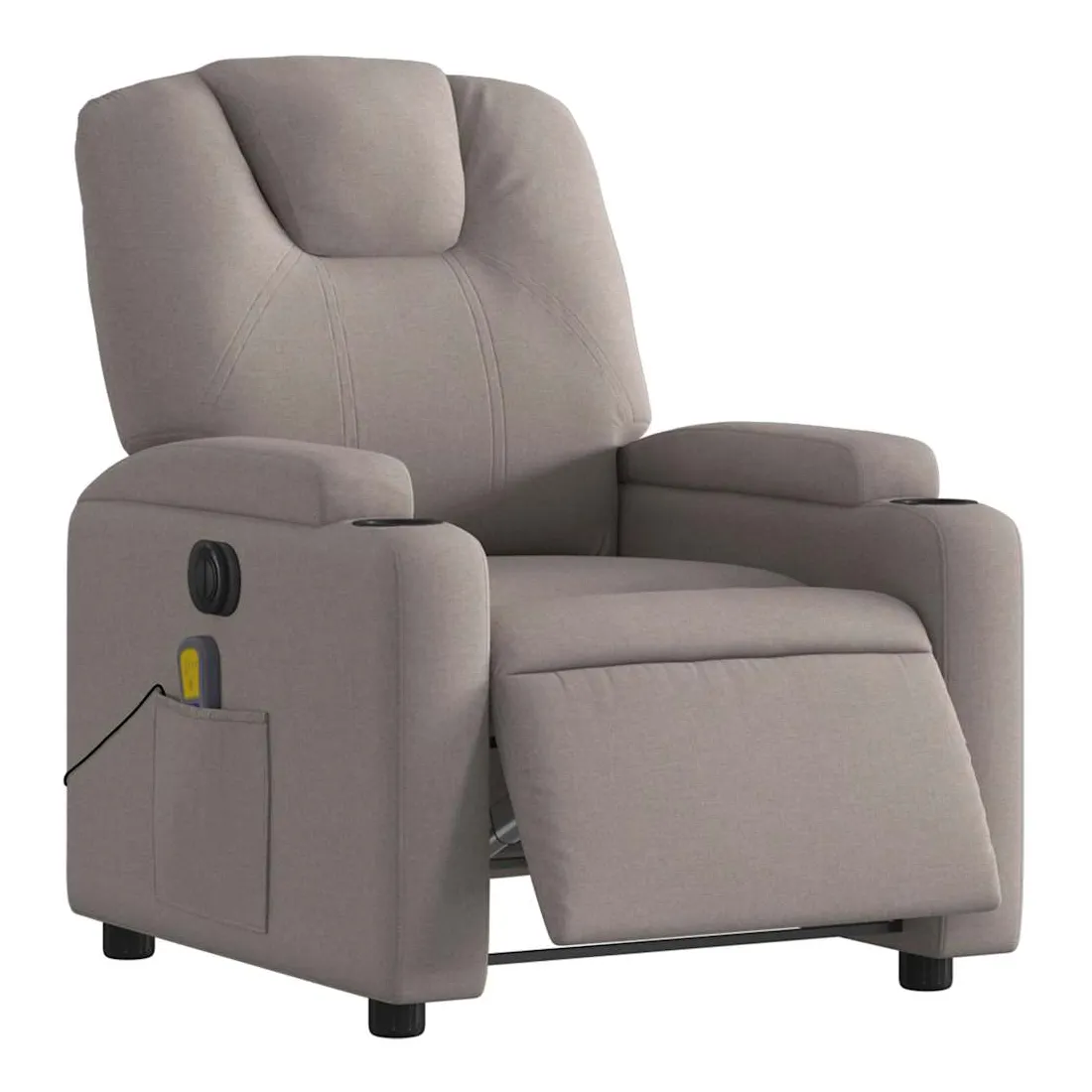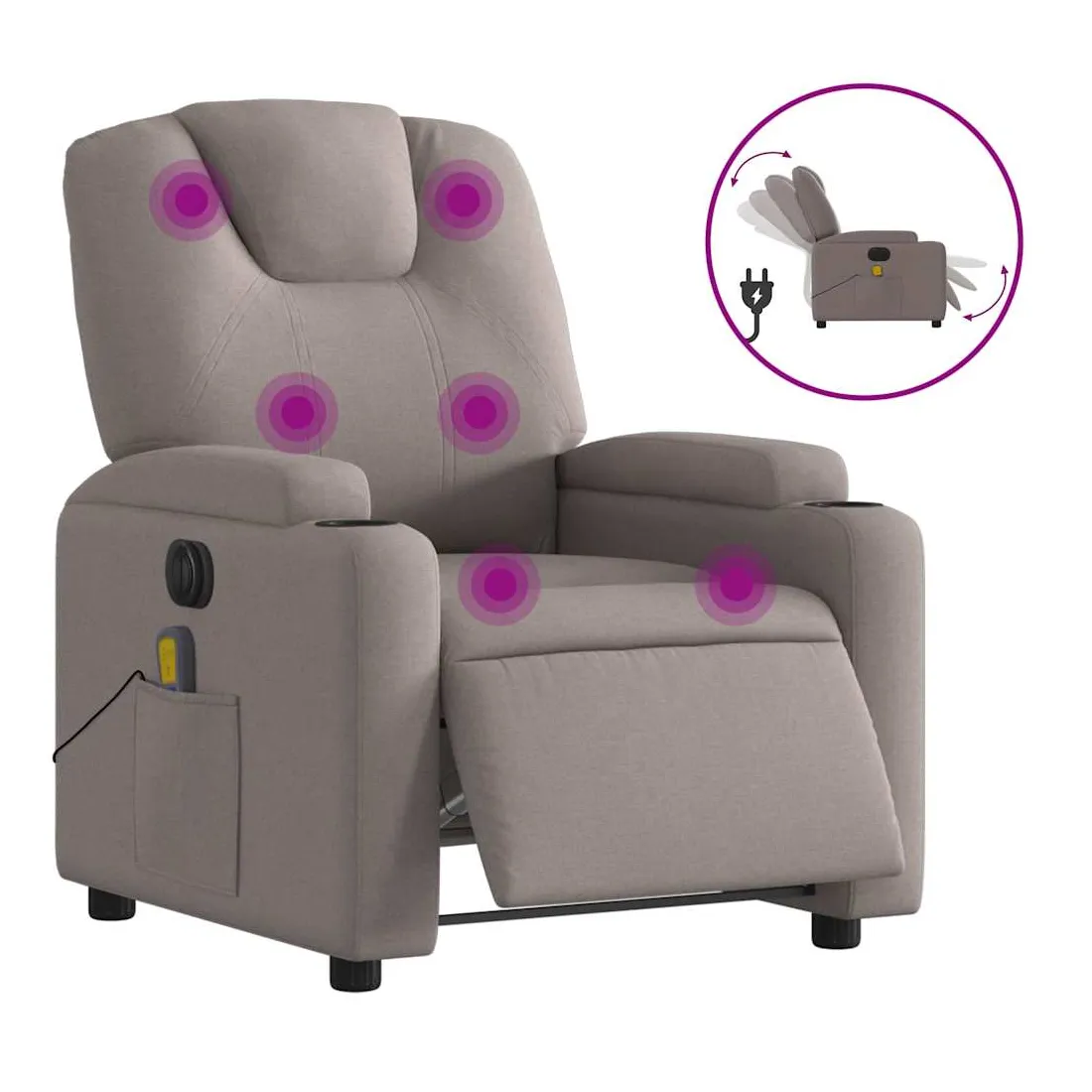 Asseyez-vous et détendez-vous dans ce fauteuil inclinable de massage électrique très confortable ! Fonction d'inclinaison électrique : ce fauteuil inclinable est équipé d'un moteur électrique qui permet de régler automatiquement le repose-pied et le dossier dans n'importe quelle position, selon votre confort, en appuyant simplement sur le bouton situé sur le côté du fauteuil. Cette fonction permet une inclinaison maximale de 135 degrés. En outre, le dossier peut revenir automatiquement à sa position d'origine par une simple pression sur le bouton.Fonction de vibration : les 6 points de massage vous permettent de faire l'expérience d'un massage mieux ciblé. De plus, la télécommande incluse vous permet de choisir différents programmes de massage. La fonction de massage est alimentée par le connecteur USB qui nécessite une source d'alimentation USB certifiée de 5 V (non fournie).Expérience d'assise confortable : le siège, le dossier et les larges accoudoirs bien rembourrés recouverts de tissu procurent une sensation confortable et chaleureuse, vous permettant de vous sentir enveloppé lorsque vous êtes assis. Le tissu présente un aspect simple et épuré et est respirant et durable.Porte-gobelets et poche latérale pratiques : ce fauteuil dispose de deux porte-gobelets pratiques pour vos boissons et d'une poche latérale pour votre télécommande ou pour garder vos objets essentiels à portée de main.Cadre solide et stable : le cadre en bois et en métal offre une structure solide et une grande stabilité. Ce fauteuil inclinable est confortable et durable.