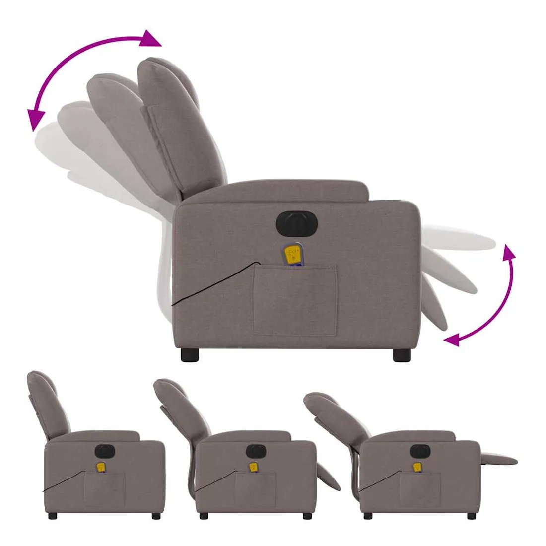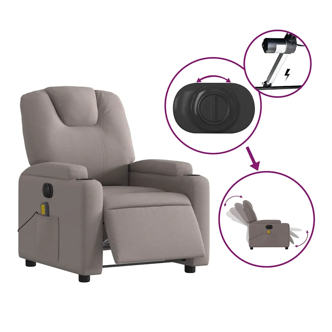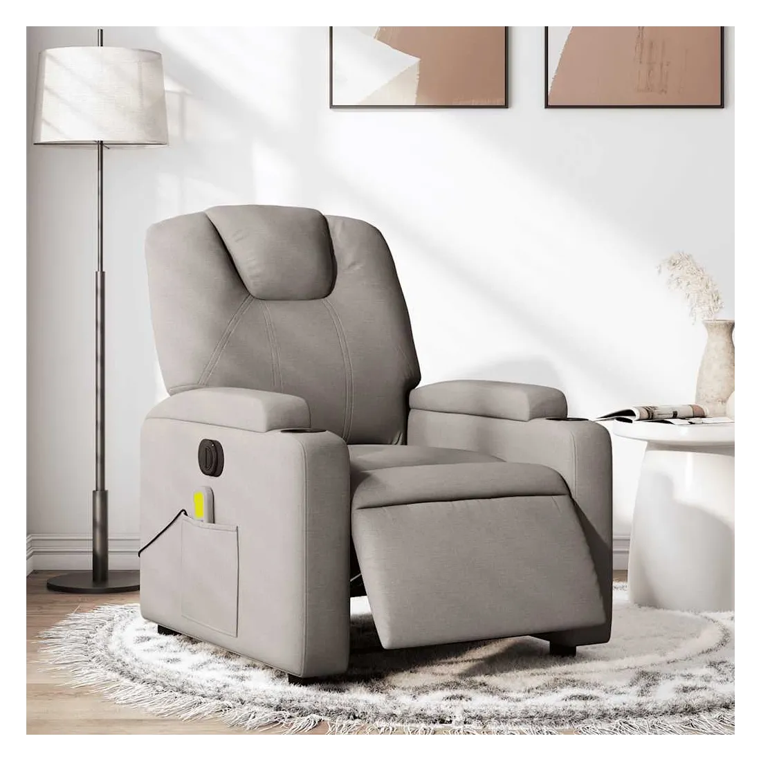 Asseyez-vous et détendez-vous dans ce fauteuil inclinable de massage électrique très confortable ! Fonction d'inclinaison électrique : ce fauteuil inclinable est équipé d'un moteur électrique qui permet de régler automatiquement le repose-pied et le dossier dans n'importe quelle position, selon votre confort, en appuyant simplement sur le bouton situé sur le côté du fauteuil. Cette fonction permet une inclinaison maximale de 135 degrés. En outre, le dossier peut revenir automatiquement à sa position d'origine par une simple pression sur le bouton.Fonction de vibration : les 6 points de massage vous permettent de faire l'expérience d'un massage mieux ciblé. De plus, la télécommande incluse vous permet de choisir différents programmes de massage. La fonction de massage est alimentée par le connecteur USB qui nécessite une source d'alimentation USB certifiée de 5 V (non fournie).Expérience d'assise confortable : le siège, le dossier et les larges accoudoirs bien rembourrés recouverts de tissu procurent une sensation confortable et chaleureuse, vous permettant de vous sentir enveloppé lorsque vous êtes assis. Le tissu présente un aspect simple et épuré et est respirant et durable.Porte-gobelets et poche latérale pratiques : ce fauteuil dispose de deux porte-gobelets pratiques pour vos boissons et d'une poche latérale pour votre télécommande ou pour garder vos objets essentiels à portée de main.Cadre solide et stable : le cadre en bois et en métal offre une structure solide et une grande stabilité. Ce fauteuil inclinable est confortable et durable.