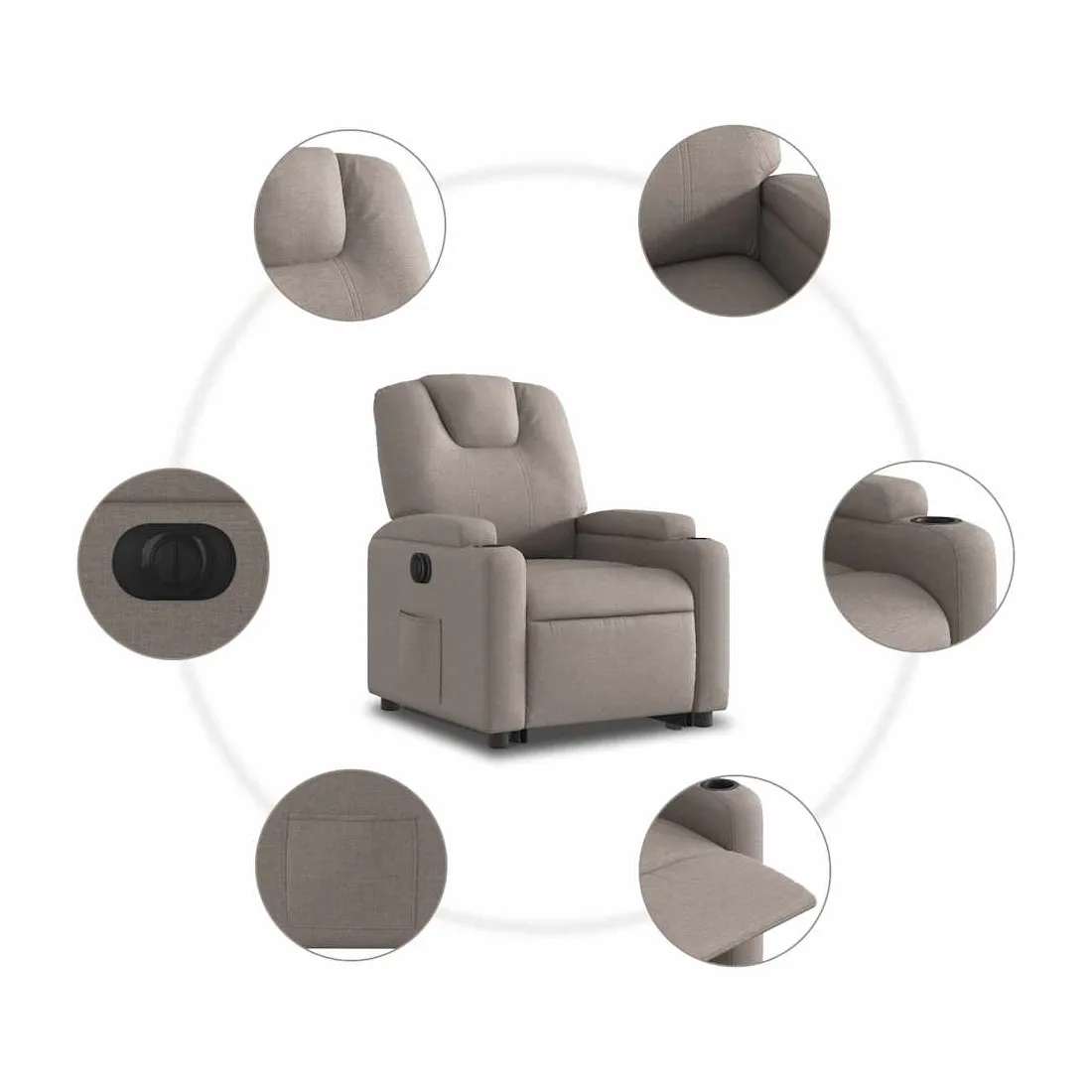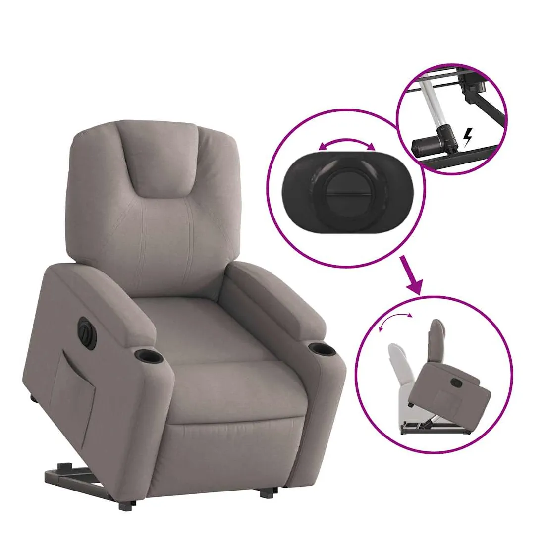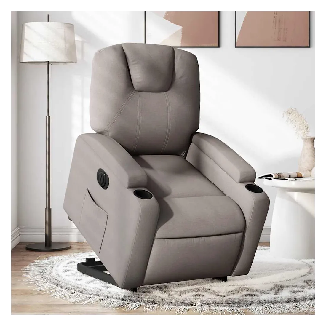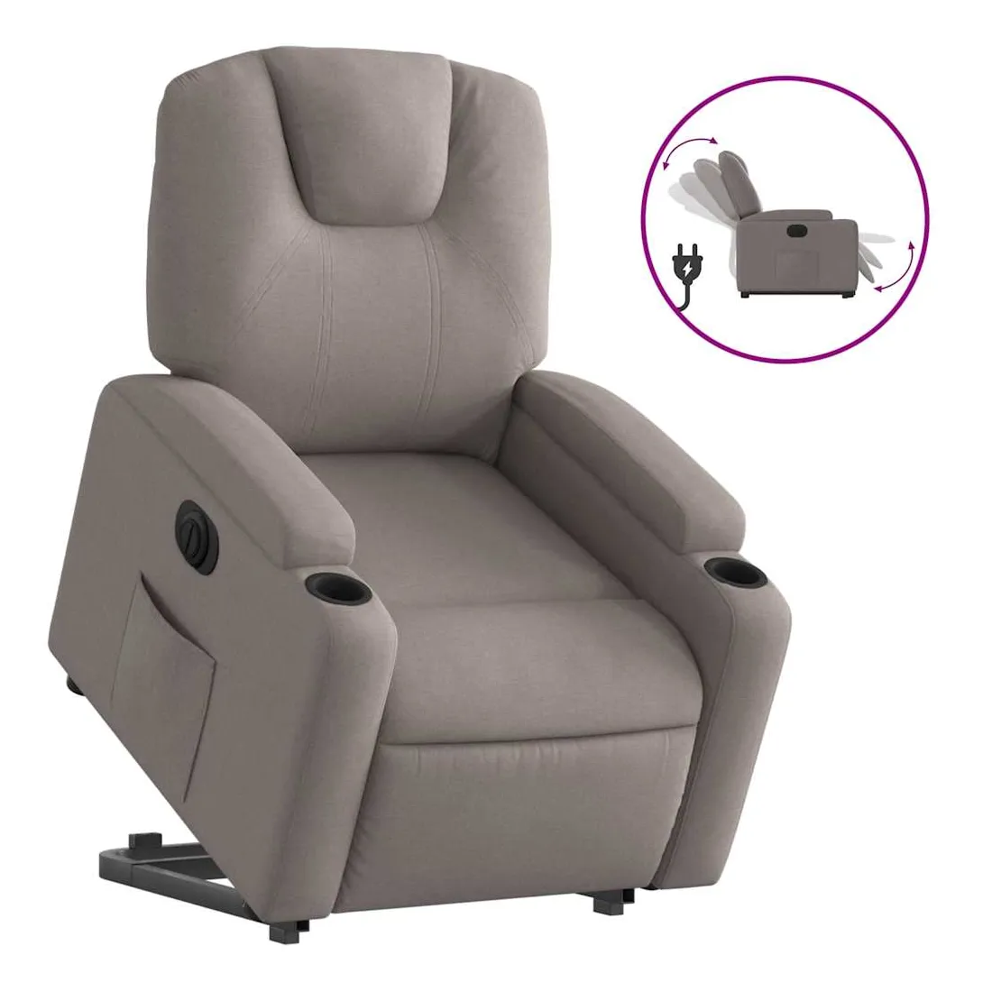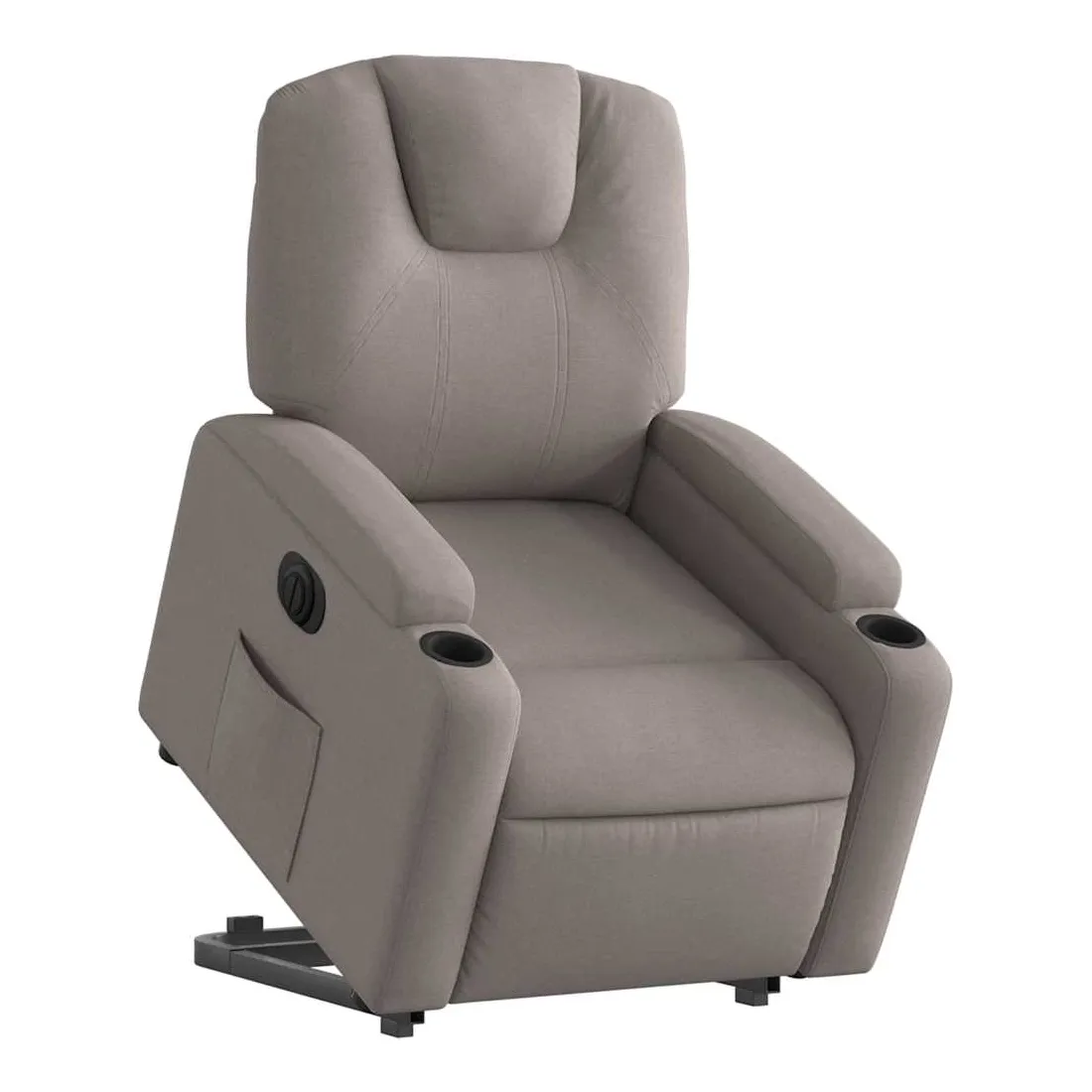 Asseyez-vous et détendez-vous dans ce fauteuil inclinable électrique très confortable ! Fonction de levage électrique : ce fauteuil inclinable pour personnes âgées est équipé d'un moteur électrique pour la fonction de levage. Grâce à la fonction qui pousse toute la chaise vers le haut, vous pouvez facilement vous tenir debout sans stresser votre dos et vos genoux en appuyant simplement sur le bouton.Fonction d'inclinaison électrique : ce fauteuil inclinable est également équipé d'un moteur électrique qui permet de régler automatiquement le repose-pied et le dossier dans n'importe quelle position, selon votre confort, en appuyant simplement sur le bouton situé sur le côté du fauteuil. Cette fonction permet une inclinaison maximale de 135 degrés. En outre, le dossier peut revenir automatiquement à sa position d'origine par une simple pression sur le bouton.Expérience d'assise confortable : le siège, le dossier et les larges accoudoirs bien rembourrés recouverts de tissu procurent une sensation confortable et chaleureuse, vous permettant de vous sentir enveloppé lorsque vous êtes assis. Le tissu présente un aspect simple et épuré et est respirant et durable.Porte-gobelets et poche latérale pratiques : ce fauteuil dispose de deux porte-gobelets pratiques pour vos boissons et d'une poche latérale pour garder vos objets essentiels à portée de main.Cadre solide et stable : le cadre en bois et en métal offre une structure solide et une grande stabilité. Ce fauteuil inclinable est confortable et durable.