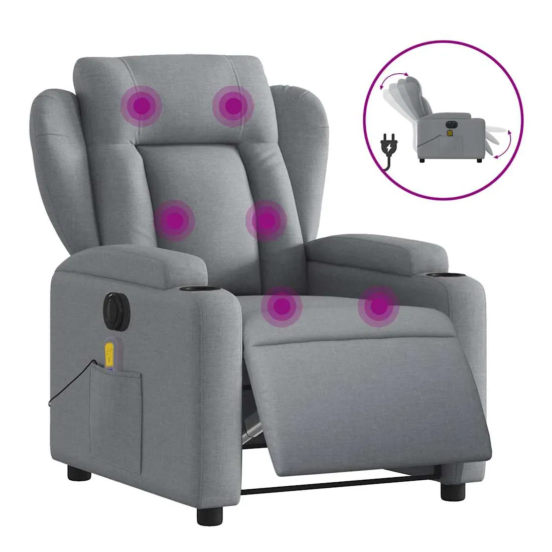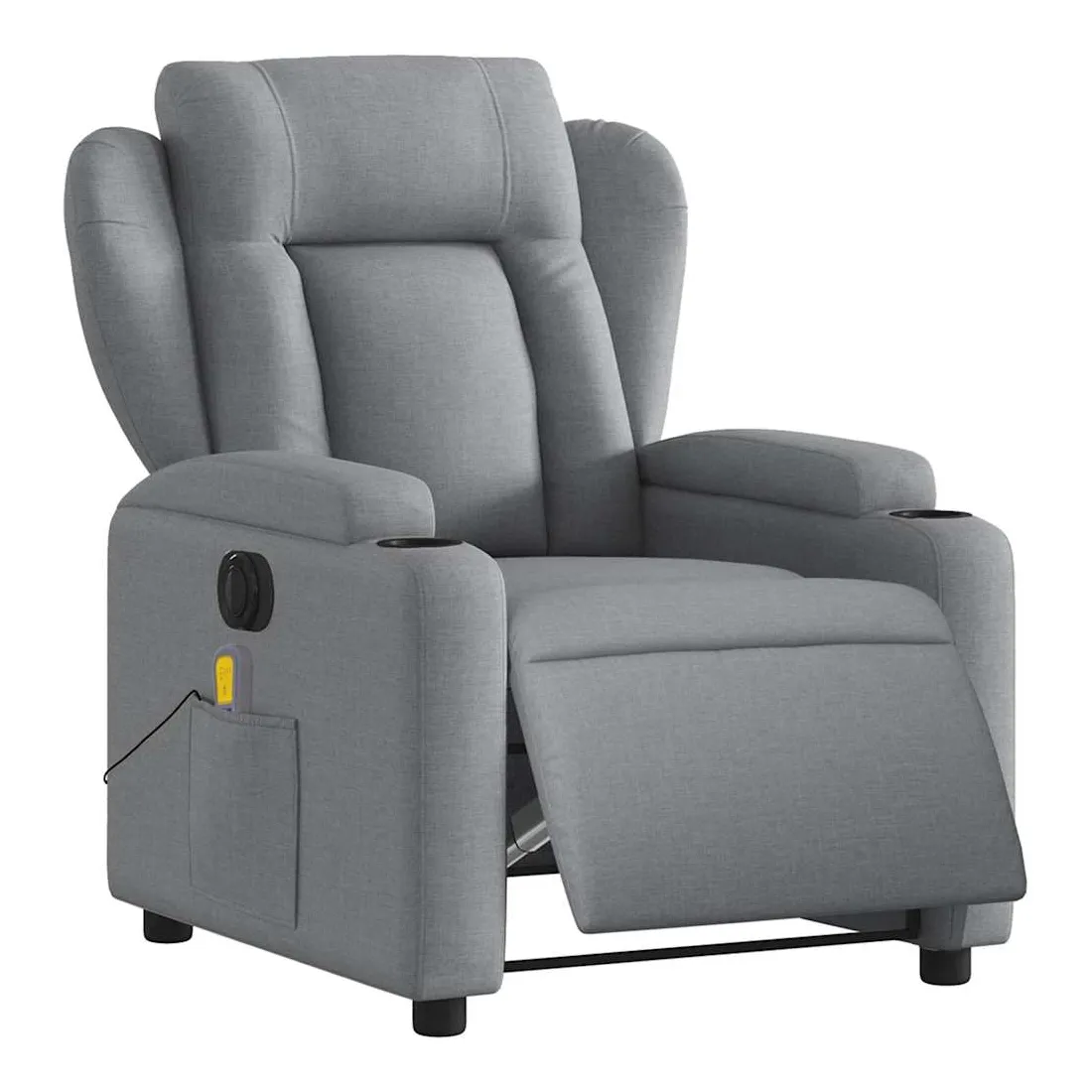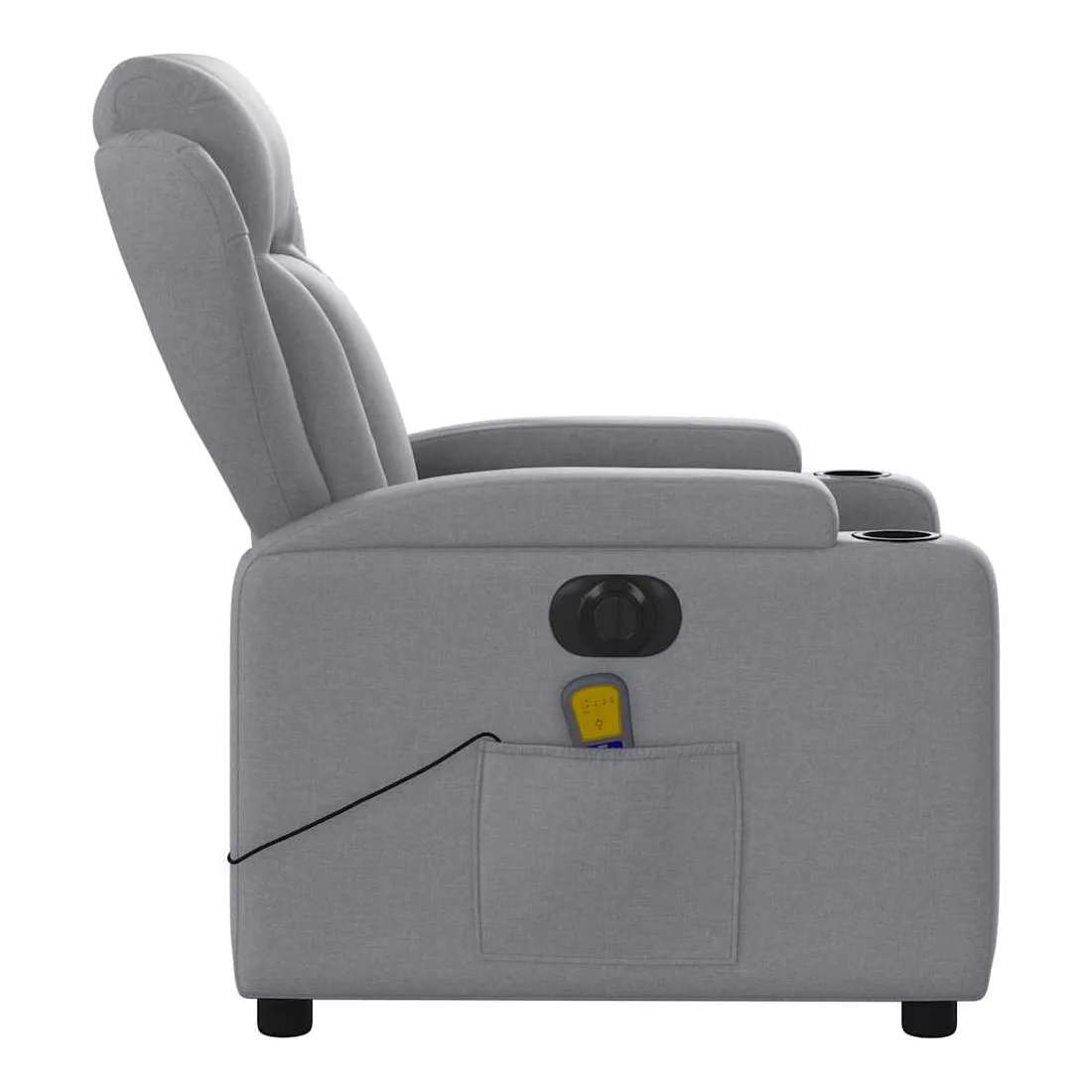 Asseyez-vous et détendez-vous dans ce fauteuil inclinable de massage électrique très confortable ! Fonction d'inclinaison électrique : ce fauteuil inclinable est équipé d'un moteur électrique qui permet de régler automatiquement le repose-pied et le dossier dans n'importe quelle position, selon votre confort, en appuyant simplement sur le bouton situé sur le côté du fauteuil. Cette fonction permet une inclinaison maximale de 135 degrés. En outre, le dossier peut revenir automatiquement à sa position d'origine par une simple pression sur le bouton.Fonction de vibration : les 6 points de massage vous permettent de faire l'expérience d'un massage mieux ciblé. De plus, la télécommande incluse vous permet de choisir différents programmes de massage. La fonction de massage est alimentée par le connecteur USB qui nécessite une source d'alimentation USB certifiée de 5 V (non fournie).Expérience d'assise confortable : le siège, le dossier et les larges accoudoirs bien rembourrés recouverts de tissu procurent une sensation confortable et chaleureuse, vous permettant de vous sentir enveloppé lorsque vous êtes assis. Le tissu présente un aspect simple et épuré et est respirant et durable.Porte-gobelets et poche latérale pratiques : ce fauteuil dispose de deux porte-gobelets pratiques pour vos boissons et d'une poche latérale pour votre télécommande ou pour garder vos objets essentiels à portée de main.Cadre solide et stable : le cadre en bois et en métal offre une structure solide et une grande stabilité. Ce fauteuil inclinable est confortable et durable.