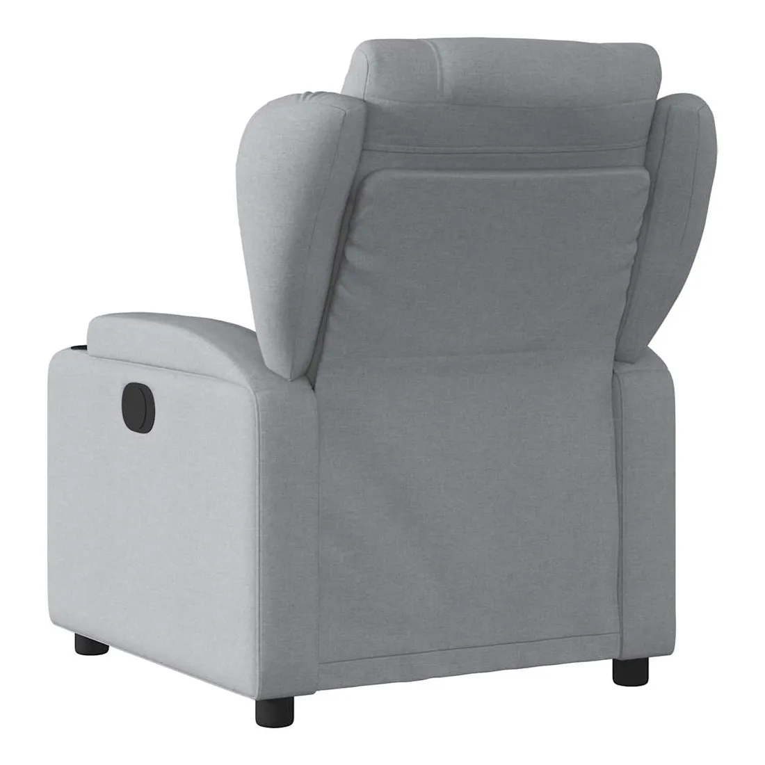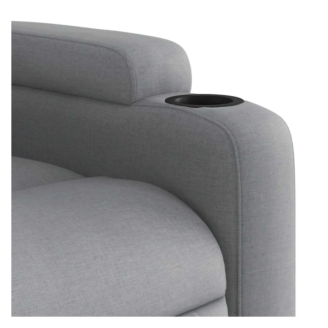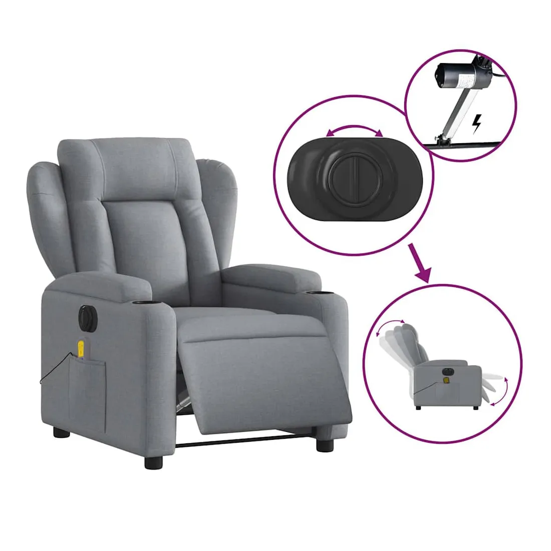 Asseyez-vous et détendez-vous dans ce fauteuil inclinable de massage électrique très confortable ! Fonction d'inclinaison électrique : ce fauteuil inclinable est équipé d'un moteur électrique qui permet de régler automatiquement le repose-pied et le dossier dans n'importe quelle position, selon votre confort, en appuyant simplement sur le bouton situé sur le côté du fauteuil. Cette fonction permet une inclinaison maximale de 135 degrés. En outre, le dossier peut revenir automatiquement à sa position d'origine par une simple pression sur le bouton.Fonction de vibration : les 6 points de massage vous permettent de faire l'expérience d'un massage mieux ciblé. De plus, la télécommande incluse vous permet de choisir différents programmes de massage. La fonction de massage est alimentée par le connecteur USB qui nécessite une source d'alimentation USB certifiée de 5 V (non fournie).Expérience d'assise confortable : le siège, le dossier et les larges accoudoirs bien rembourrés recouverts de tissu procurent une sensation confortable et chaleureuse, vous permettant de vous sentir enveloppé lorsque vous êtes assis. Le tissu présente un aspect simple et épuré et est respirant et durable.Porte-gobelets et poche latérale pratiques : ce fauteuil dispose de deux porte-gobelets pratiques pour vos boissons et d'une poche latérale pour votre télécommande ou pour garder vos objets essentiels à portée de main.Cadre solide et stable : le cadre en bois et en métal offre une structure solide et une grande stabilité. Ce fauteuil inclinable est confortable et durable.