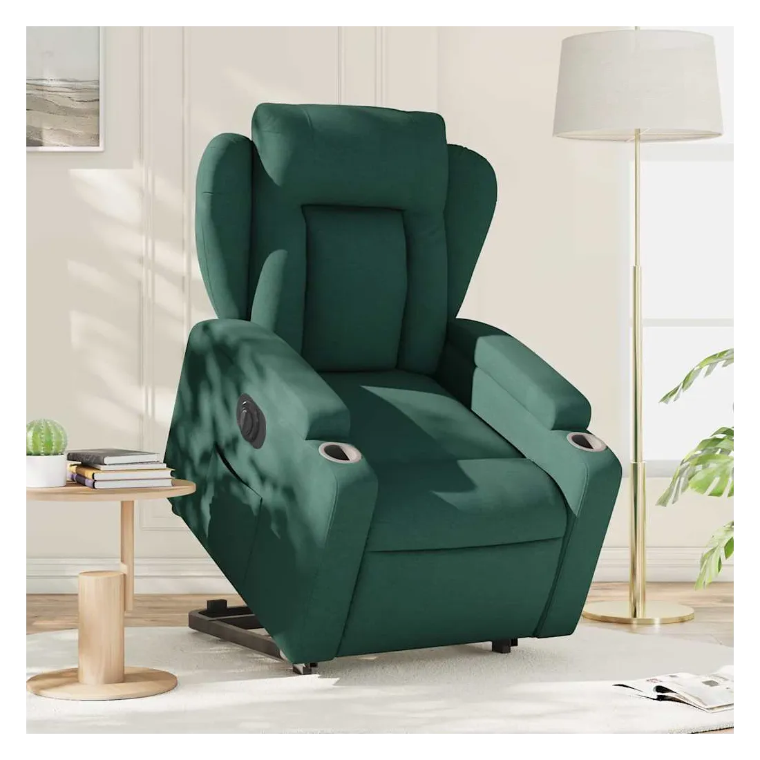 Asseyez-vous et détendez-vous dans ce fauteuil inclinable électrique très confortable ! Fonction de levage électrique : ce fauteuil inclinable pour personnes âgées est équipé d'un moteur électrique pour la fonction de levage. Grâce à la fonction qui pousse toute la chaise vers le haut, vous pouvez facilement vous tenir debout sans stresser votre dos et vos genoux en appuyant simplement sur le bouton.Fonction d'inclinaison électrique : ce fauteuil inclinable est également équipé d'un moteur électrique qui permet de régler automatiquement le repose-pied et le dossier dans n'importe quelle position, selon votre confort, en appuyant simplement sur le bouton situé sur le côté du fauteuil. Cette fonction permet une inclinaison maximale de 135 degrés. En outre, le dossier peut revenir automatiquement à sa position d'origine par une simple pression sur le bouton.Expérience d'assise confortable : le siège, le dossier et les larges accoudoirs bien rembourrés recouverts de tissu procurent une sensation confortable et chaleureuse, vous permettant de vous sentir enveloppé lorsque vous êtes assis. Le tissu présente un aspect simple et épuré et est respirant et durable.Porte-gobelets et poche latérale pratiques : ce fauteuil dispose de deux porte-gobelets pratiques pour vos boissons et d'une poche latérale pour garder vos objets essentiels à portée de main.Cadre solide et stable : le cadre en bois et en métal offre une structure solide et une grande stabilité. Ce fauteuil inclinable est confortable et durable.