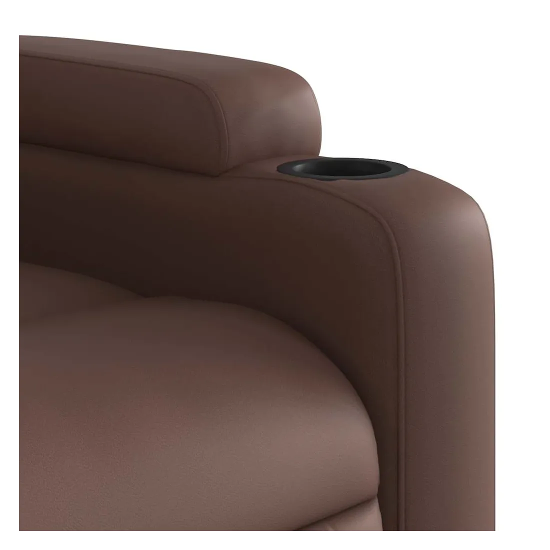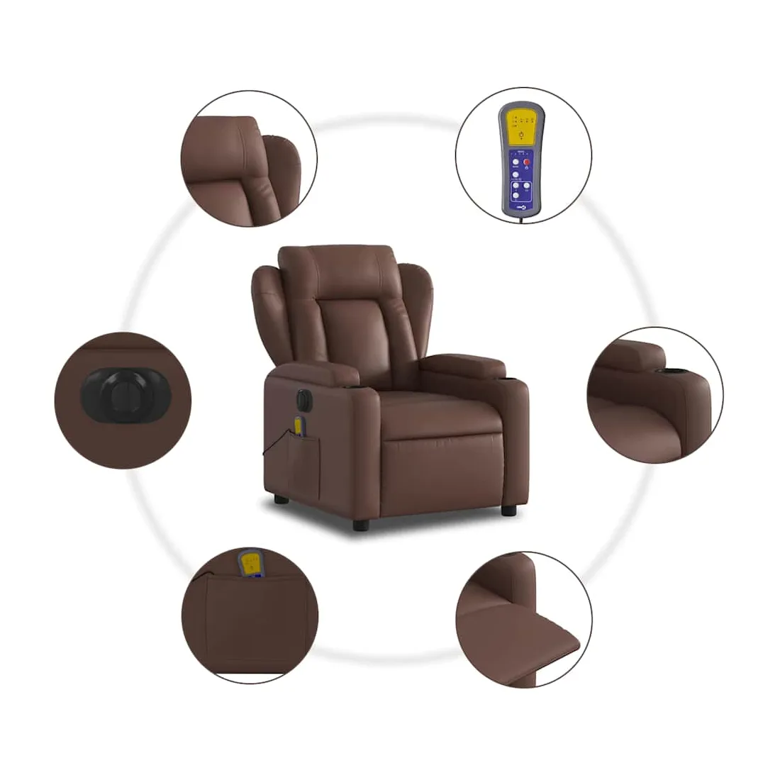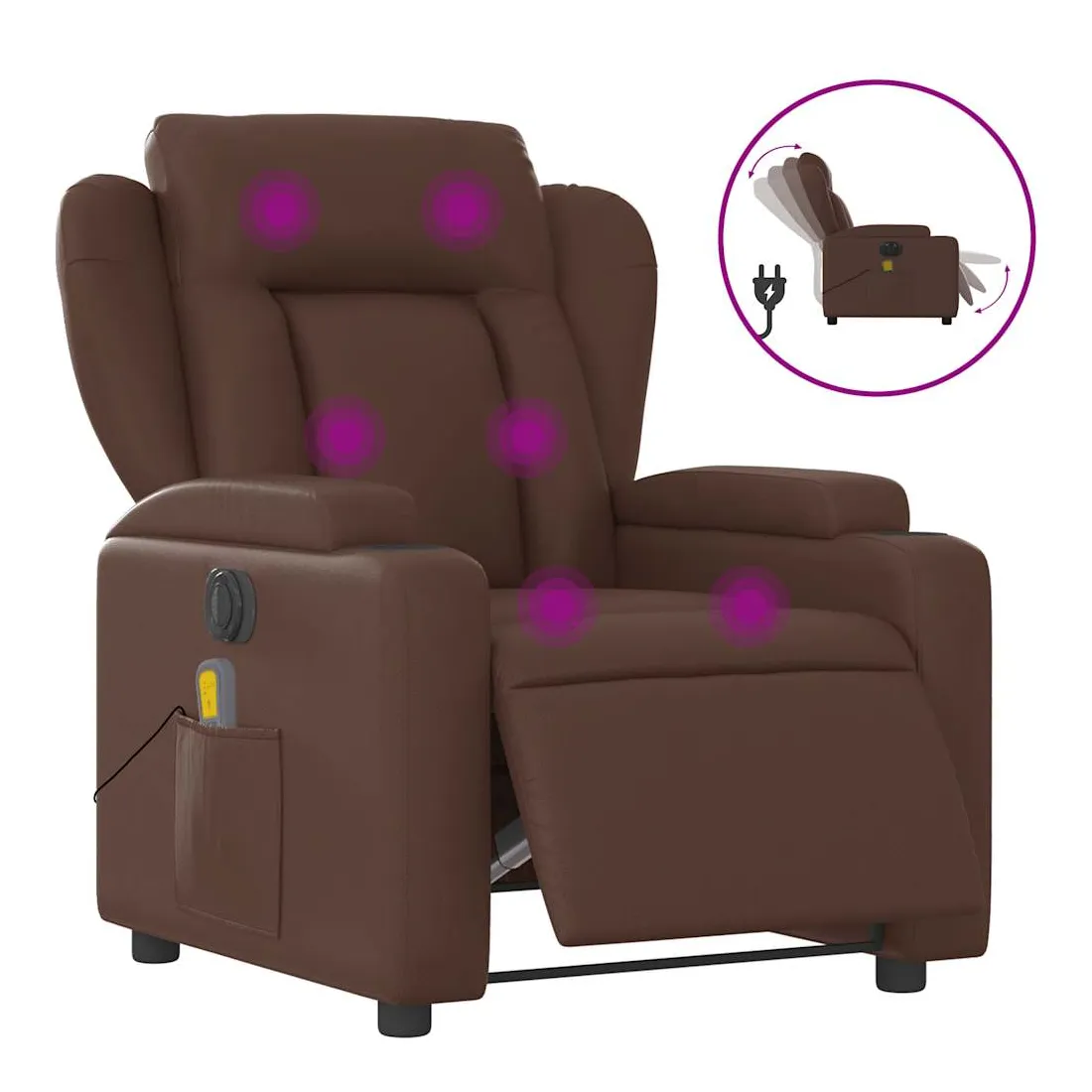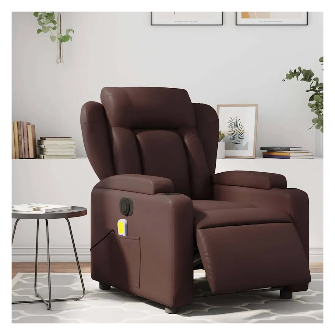 Asseyez-vous et détendez-vous dans ce fauteuil inclinable de massage électrique très confortable ! Fonction d'inclinaison électrique : ce fauteuil inclinable est équipé d'un moteur électrique qui permet de régler automatiquement le repose-pied et le dossier dans n'importe quelle position, selon votre confort, en appuyant simplement sur le bouton situé sur le côté du fauteuil. Cette fonction permet une inclinaison maximale de 135 degrés. En outre, le dossier peut revenir automatiquement à sa position d'origine par une simple pression sur le bouton.Fonction de vibration : les 6 points de massage vous permettent de faire l'expérience d'un massage mieux ciblé. De plus, la télécommande incluse vous permet de choisir différents programmes de massage. La fonction de massage est alimentée par le connecteur USB qui nécessite une source d'alimentation USB certifiée de 5 V (non fournie).Expérience de siège confortable : le siège, le dossier et les larges accoudoirs rembourrés épais recouverts de similicuir procurent une sensation confortable, vous faisant vous sentir enlacé lorsque vous êtes assis. Le similicuir est un matériau très résistant. Il est résistant aux taches, ce qui le rend facile à nettoyer avec un chiffon humide. La surface lisse donne également un aspect luxueux et la beauté du cuir véritable.Porte-gobelets et poche latérale pratiques : ce fauteuil dispose de deux porte-gobelets pratiques pour vos boissons et d'une poche latérale pour garder vos objets essentiels à portée de main.Cadre solide et stable : le cadre en bois et en métal offre une structure solide et une grande stabilité. Ce fauteuil inclinable est confortable et durable.