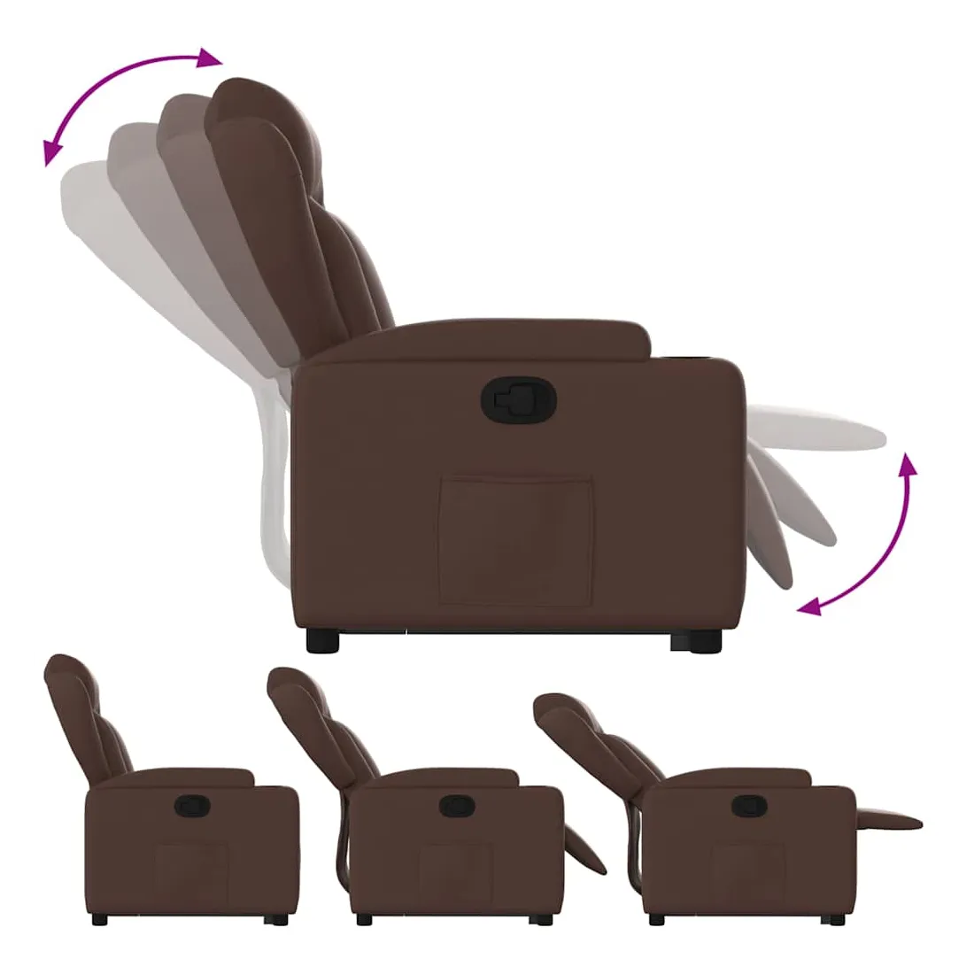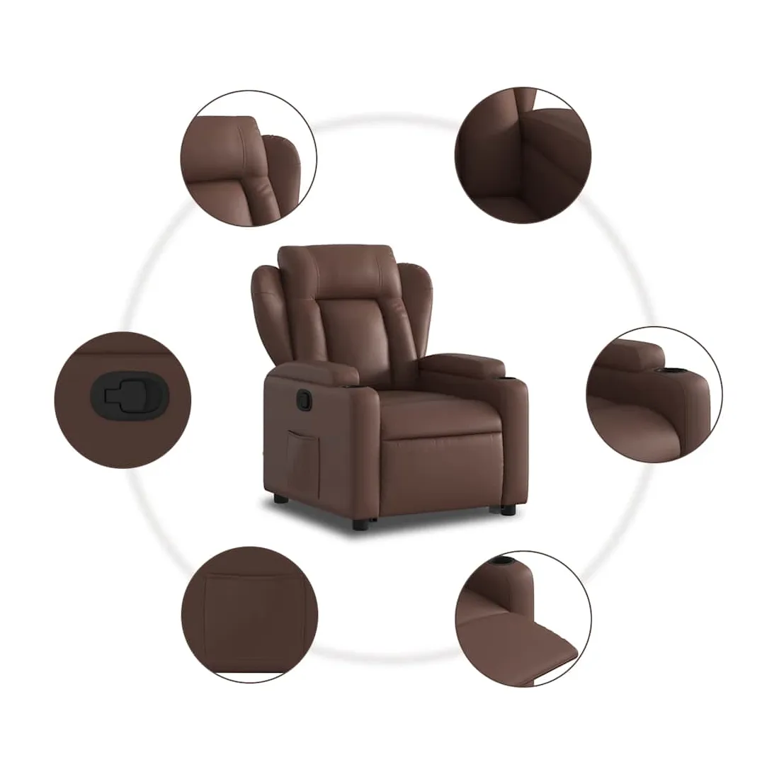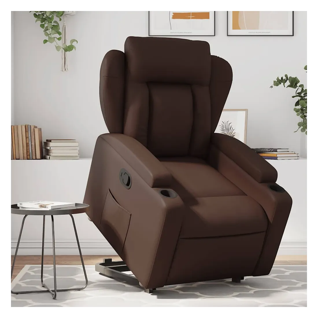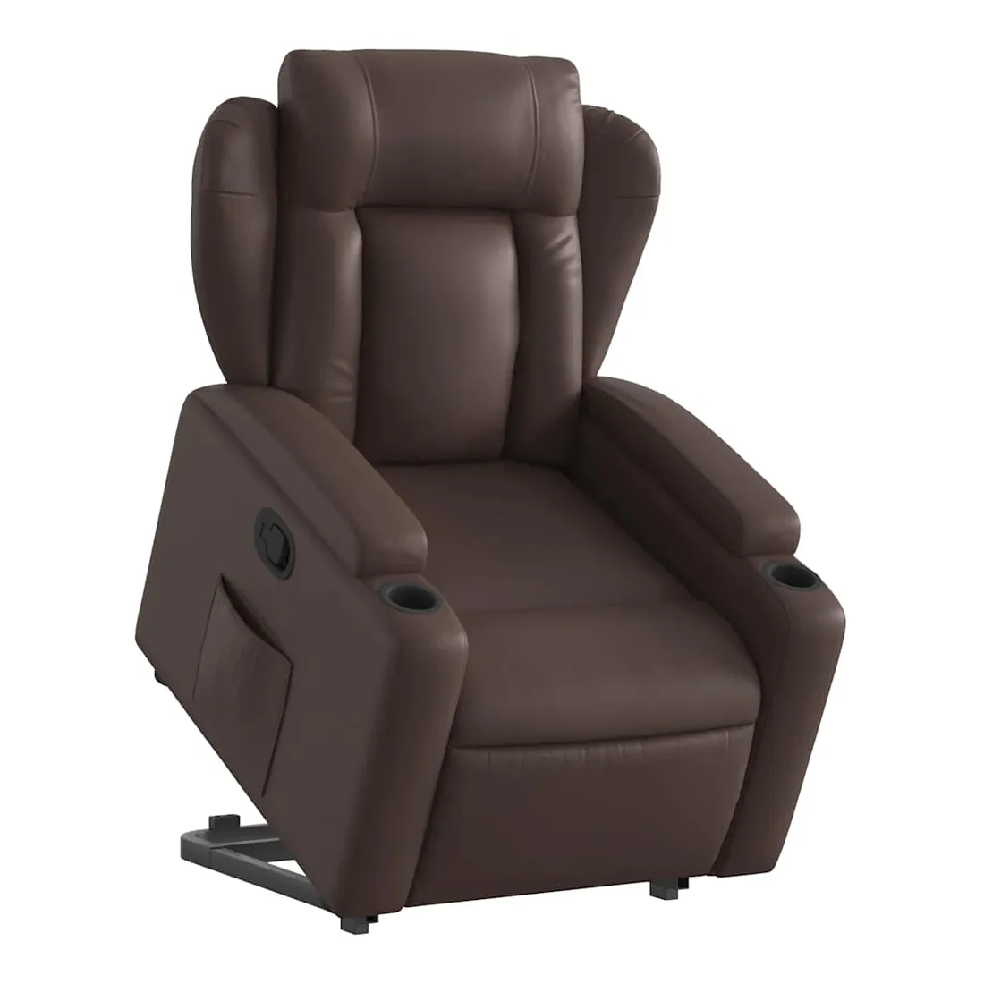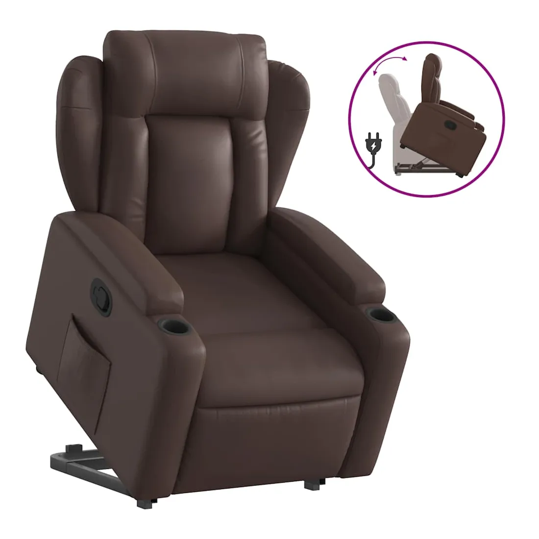 Asseyez-vous et détendez-vous dans ce fauteuil inclinable très confortable ! Fonction de levage électrique : ce fauteuil inclinable pour personnes âgées est équipé d'un moteur électrique pour la fonction de levage. Grâce à la fonction qui pousse toute la chaise vers le haut, vous pouvez facilement vous tenir debout sans stresser votre dos et vos genoux en appuyant simplement sur le bouton.Fonction d'inclinaison manuelle : ce fauteuil inclinable est doté d'une poignée du côté droit. Vous pouvez régler manuellement le repose-pieds et le dossier dans n'importe quelle position selon votre confort en tirant simplement sur la poignée. Cette fonction permet une inclinaison maximale de 135 degrés. De plus, le dossier peut revenir rapidement à sa position d'origine en tirant simplement sur la poignée.Expérience de siège confortable : le siège, le dossier et les larges accoudoirs rembourrés épais recouverts de similicuir procurent une sensation confortable, vous faisant vous sentir enlacé lorsque vous êtes assis. Le similicuir est un matériau très résistant. Il est résistant aux taches, ce qui le rend facile à nettoyer avec un chiffon humide. La surface lisse donne également un aspect luxueux et la beauté du cuir véritable.Porte-gobelets et poche latérale pratiques : ce fauteuil dispose de deux porte-gobelets pratiques pour vos boissons et d'une poche latérale pour garder vos objets essentiels à portée de main.Cadre solide et stable : le cadre en bois et en métal offre une structure solide et une grande stabilité. Ce fauteuil inclinable est confortable et durable.