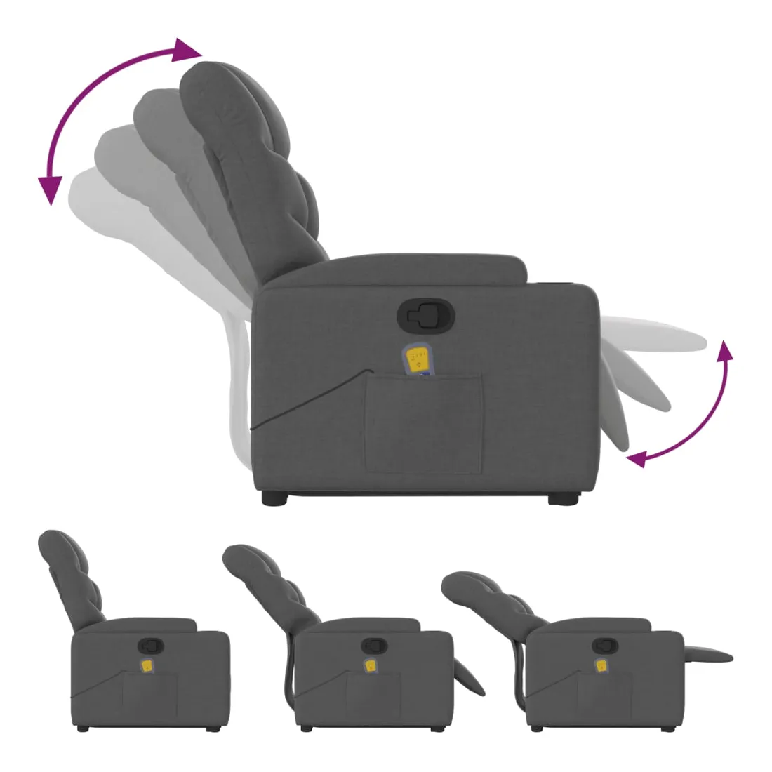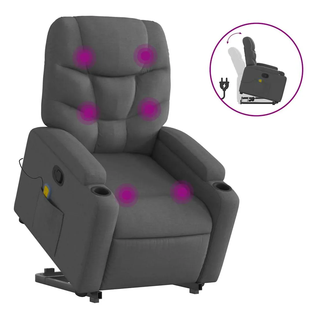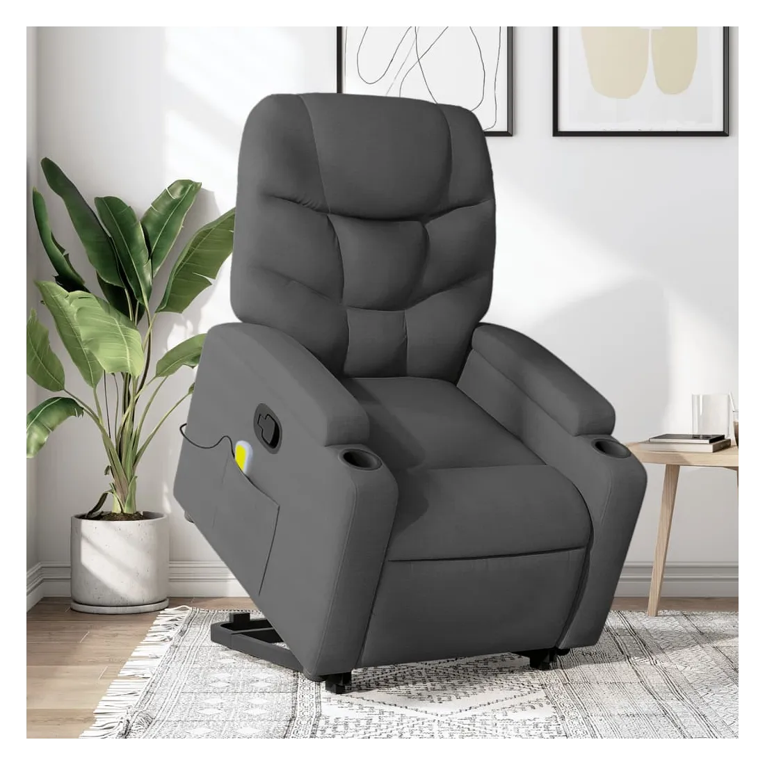 Asseyez-vous et détendez-vous dans ce fauteuil inclinable de massage très confortable ! Fonction de levage électrique : ce fauteuil inclinable pour personnes âgées est équipé d'un moteur électrique pour la fonction de levage. Grâce à la fonction qui pousse toute la chaise vers le haut, vous pouvez facilement vous tenir debout sans stresser votre dos et vos genoux en appuyant simplement sur le bouton.Fonction d'inclinaison manuelle : ce fauteuil inclinable est doté d'une poignée du côté droit. Vous pouvez régler manuellement le repose-pieds et le dossier dans n'importe quelle position selon votre confort en tirant simplement sur la poignée. Cette fonction permet une inclinaison maximale de 135 degrés. De plus, le dossier peut revenir rapidement à sa position d'origine en tirant simplement sur la poignée.Fonction de vibration : les 6 points de massage vous permettent de faire l'expérience d'un massage mieux ciblé. De plus, la télécommande incluse vous permet de choisir différents programmes de massage. La fonction de massage est alimentée par le connecteur USB qui nécessite une source d'alimentation USB certifiée de 5 V (non fournie).Expérience d'assise confortable : le siège, le dossier et les larges accoudoirs bien rembourrés recouverts de tissu procurent une sensation confortable et chaleureuse, vous permettant de vous sentir enveloppé lorsque vous êtes assis. Le tissu présente un aspect simple et épuré et est respirant et durable.Porte-gobelets et poche latérale pratiques : ce fauteuil dispose de deux porte-gobelets pratiques pour vos boissons et d'une poche latérale pour garder vos objets essentiels à portée de main.Cadre solide et stable : le cadre en bois et en métal offre une structure solide et une grande stabilité. Ce fauteuil inclinable est confortable et durable.