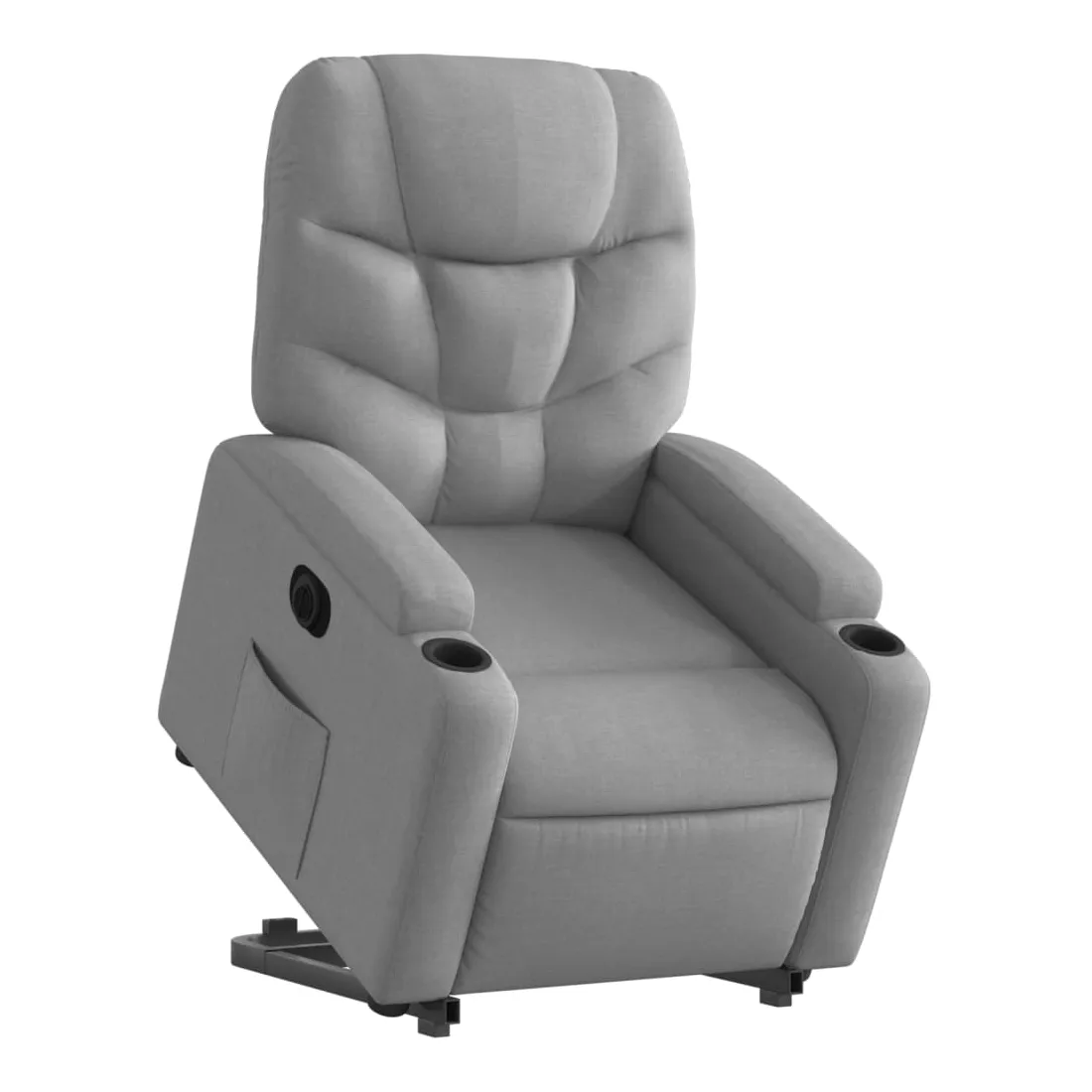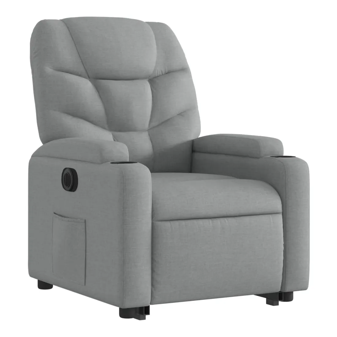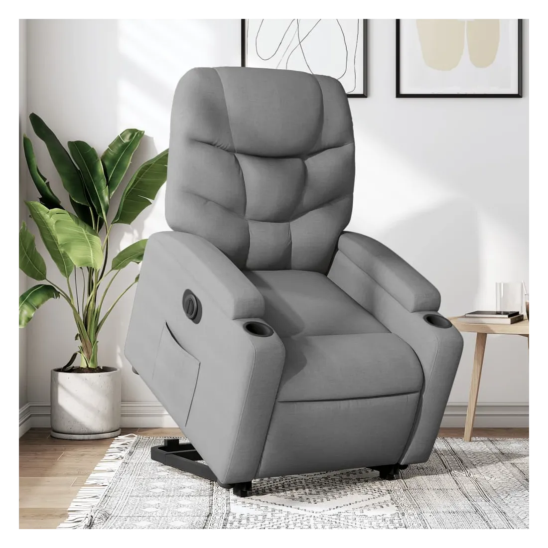 Asseyez-vous et détendez-vous dans ce fauteuil inclinable électrique très confortable ! Fonction de levage électrique : ce fauteuil inclinable pour personnes âgées est équipé d'un moteur électrique pour la fonction de levage. Grâce à la fonction qui pousse toute la chaise vers le haut, vous pouvez facilement vous tenir debout sans stresser votre dos et vos genoux en appuyant simplement sur le bouton.Fonction d'inclinaison électrique : ce fauteuil inclinable est également équipé d'un moteur électrique qui permet de régler automatiquement le repose-pied et le dossier dans n'importe quelle position, selon votre confort, en appuyant simplement sur le bouton situé sur le côté du fauteuil. Cette fonction permet une inclinaison maximale de 135 degrés. En outre, le dossier peut revenir automatiquement à sa position d'origine par une simple pression sur le bouton.Expérience d'assise confortable : le siège, le dossier et les larges accoudoirs bien rembourrés recouverts de tissu procurent une sensation confortable et chaleureuse, vous permettant de vous sentir enveloppé lorsque vous êtes assis. Le tissu présente un aspect simple et épuré et est respirant et durable.Porte-gobelets et poche latérale pratiques : ce fauteuil dispose de deux porte-gobelets pratiques pour vos boissons et d'une poche latérale pour garder vos objets essentiels à portée de main.Cadre solide et stable : le cadre en bois et en métal offre une structure solide et une grande stabilité. Ce fauteuil inclinable est confortable et durable.