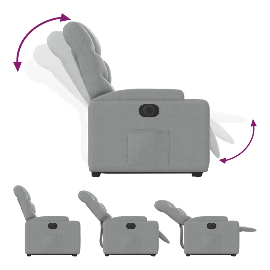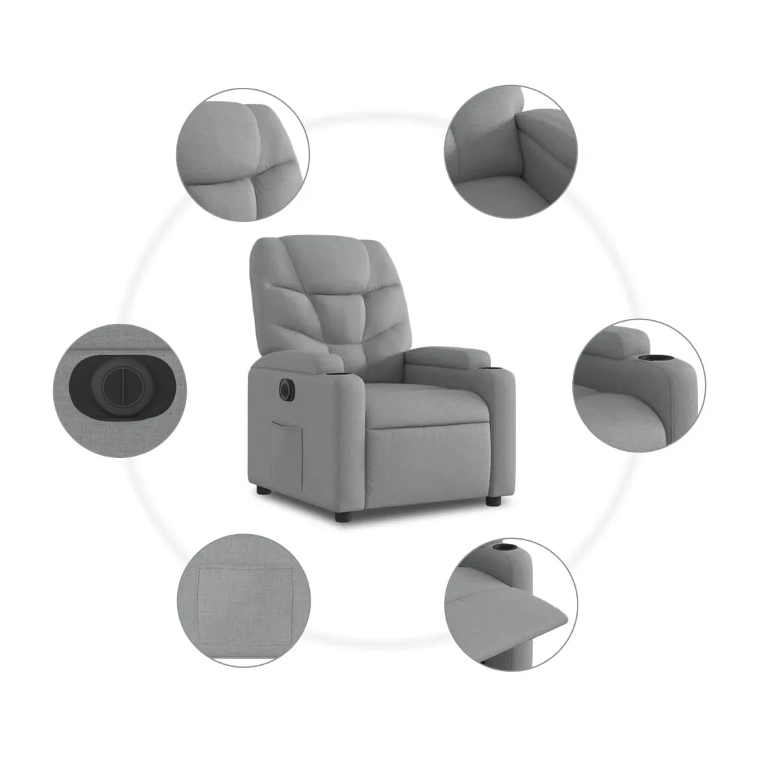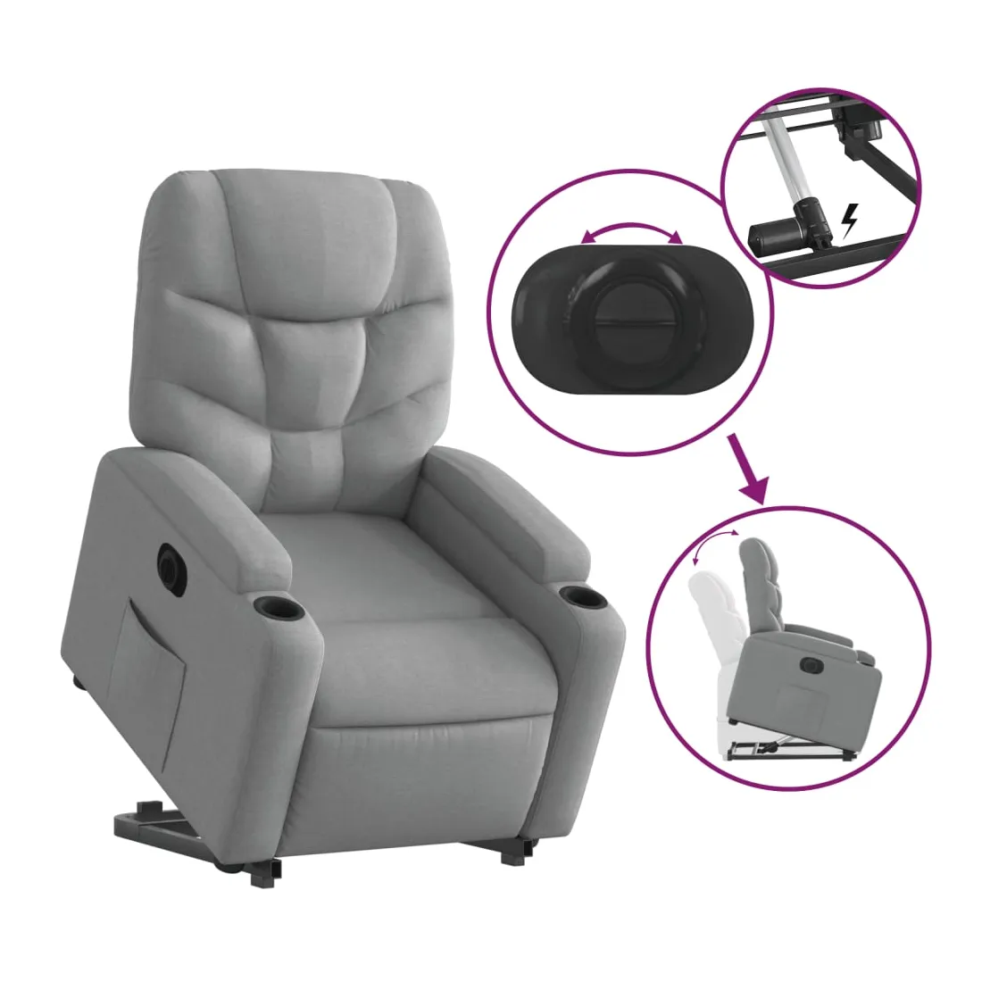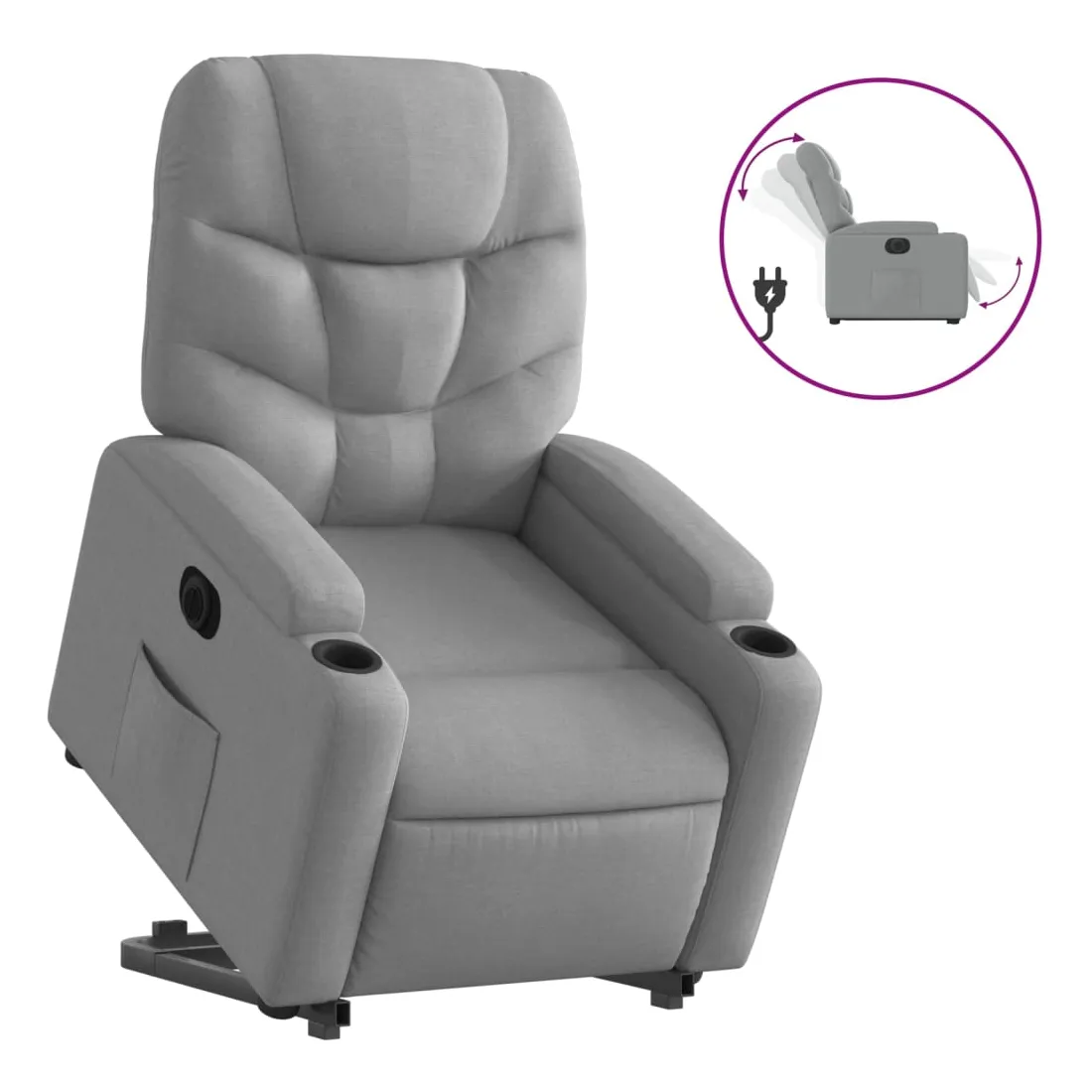 Asseyez-vous et détendez-vous dans ce fauteuil inclinable électrique très confortable ! Fonction de levage électrique : ce fauteuil inclinable pour personnes âgées est équipé d'un moteur électrique pour la fonction de levage. Grâce à la fonction qui pousse toute la chaise vers le haut, vous pouvez facilement vous tenir debout sans stresser votre dos et vos genoux en appuyant simplement sur le bouton.Fonction d'inclinaison électrique : ce fauteuil inclinable est également équipé d'un moteur électrique qui permet de régler automatiquement le repose-pied et le dossier dans n'importe quelle position, selon votre confort, en appuyant simplement sur le bouton situé sur le côté du fauteuil. Cette fonction permet une inclinaison maximale de 135 degrés. En outre, le dossier peut revenir automatiquement à sa position d'origine par une simple pression sur le bouton.Expérience d'assise confortable : le siège, le dossier et les larges accoudoirs bien rembourrés recouverts de tissu procurent une sensation confortable et chaleureuse, vous permettant de vous sentir enveloppé lorsque vous êtes assis. Le tissu présente un aspect simple et épuré et est respirant et durable.Porte-gobelets et poche latérale pratiques : ce fauteuil dispose de deux porte-gobelets pratiques pour vos boissons et d'une poche latérale pour garder vos objets essentiels à portée de main.Cadre solide et stable : le cadre en bois et en métal offre une structure solide et une grande stabilité. Ce fauteuil inclinable est confortable et durable.