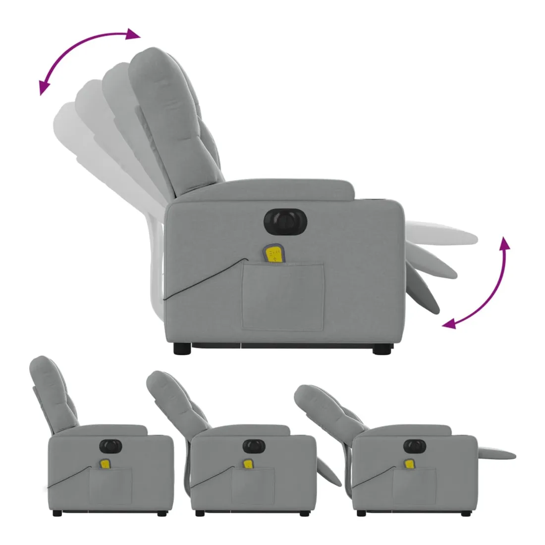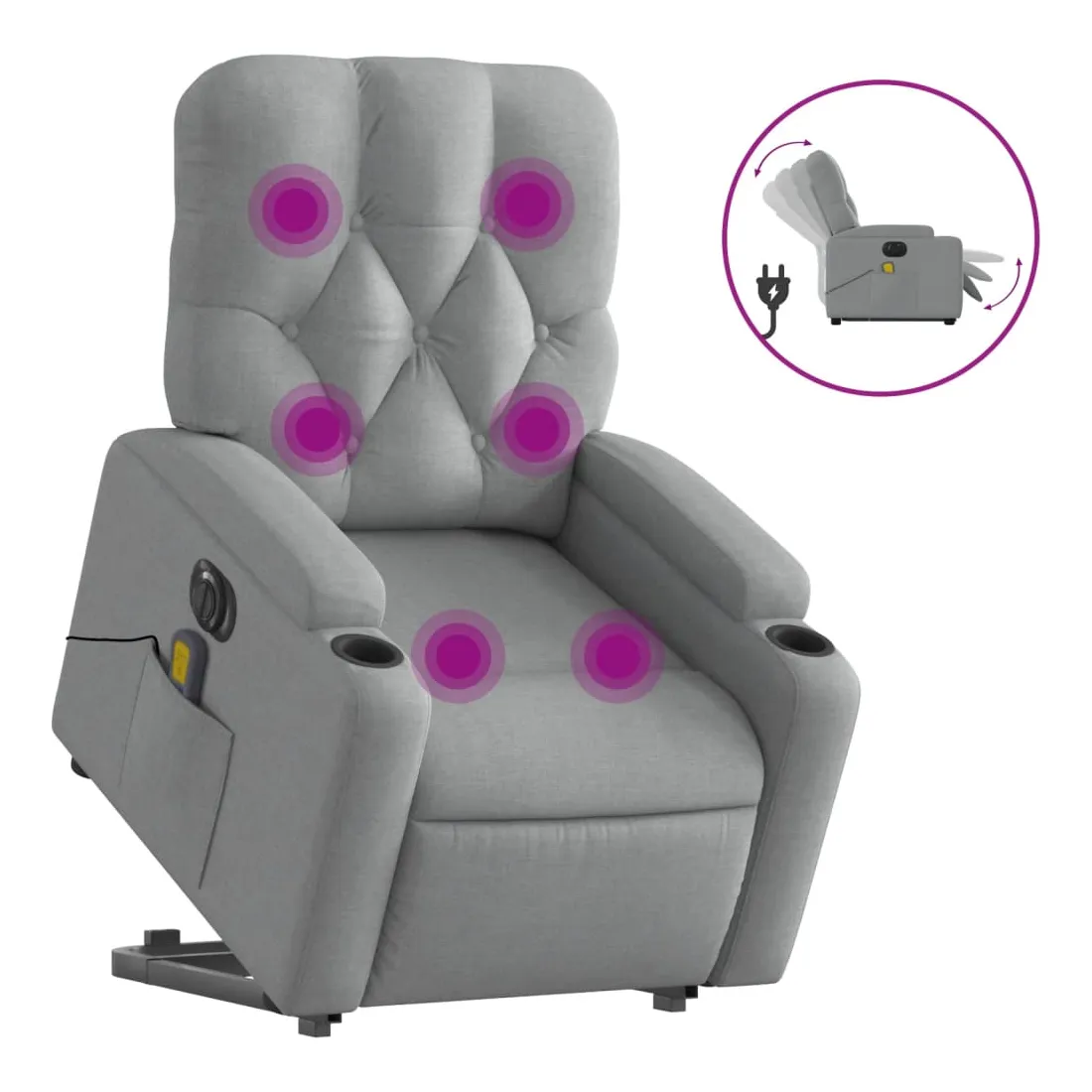 Asseyez-vous et détendez-vous dans ce fauteuil inclinable de massage électrique très confortable ! Fonction de levage électrique : ce fauteuil inclinable pour personnes âgées est équipé d'un moteur électrique pour la fonction de levage. Grâce à la fonction qui pousse toute la chaise vers le haut, vous pouvez facilement vous tenir debout sans stresser votre dos et vos genoux en appuyant simplement sur le bouton.Fonction d'inclinaison électrique : ce fauteuil inclinable est également équipé d'un moteur électrique qui permet de régler automatiquement le repose-pied et le dossier dans n'importe quelle position, selon votre confort, en appuyant simplement sur le bouton situé sur le côté du fauteuil. Cette fonction permet une inclinaison maximale de 135 degrés. En outre, le dossier peut revenir automatiquement à sa position d'origine par une simple pression sur le bouton.Fonction de vibration : les 6 points de massage vous permettent de faire l'expérience d'un massage mieux ciblé. De plus, la télécommande incluse vous permet de choisir différents programmes de massage. La fonction de massage est alimentée par le connecteur USB qui nécessite une source d'alimentation USB certifiée de 5 V (non fournie).Expérience d'assise confortable : le siège, le dossier et les larges accoudoirs bien rembourrés recouverts de tissu procurent une sensation confortable et chaleureuse, vous permettant de vous sentir enveloppé lorsque vous êtes assis. Le tissu présente un aspect simple et épuré et est respirant et durable.Porte-gobelets et poche latérale pratiques : ce fauteuil dispose de deux porte-gobelets pratiques pour vos boissons et d'une poche latérale pour garder vos objets essentiels à portée de main.Cadre solide et stable : le cadre en bois et en métal offre une structure solide et une grande stabilité. Ce fauteuil inclinable est confortable et durable.