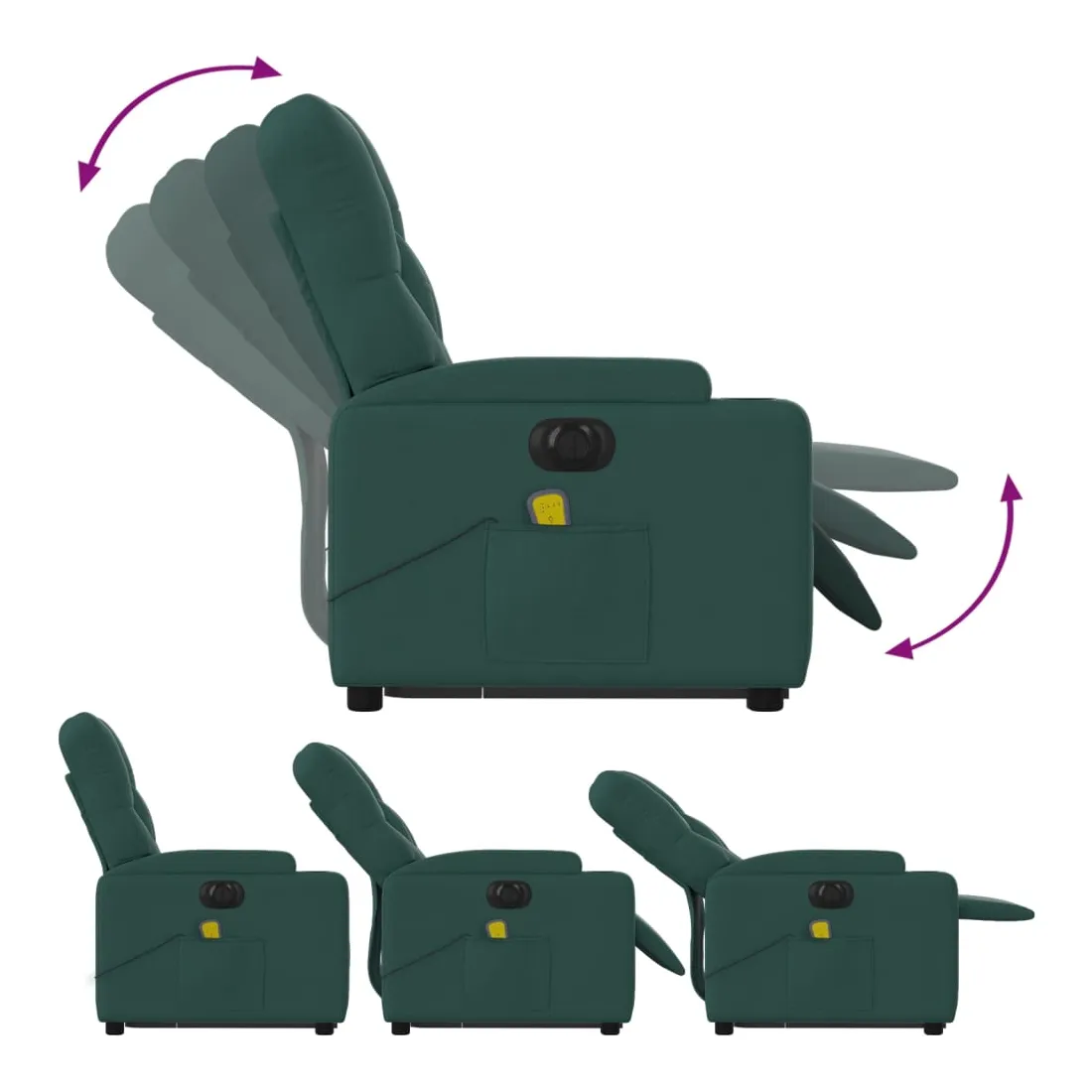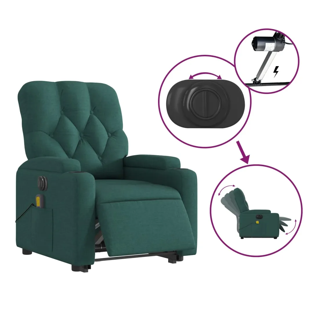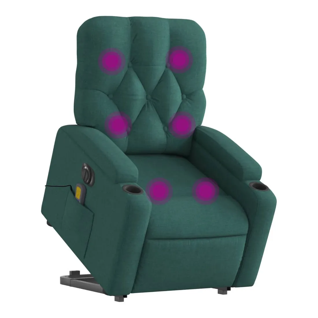 Asseyez-vous et détendez-vous dans ce fauteuil inclinable de massage électrique très confortable ! Fonction de levage électrique : ce fauteuil inclinable pour personnes âgées est équipé d'un moteur électrique pour la fonction de levage. Grâce à la fonction qui pousse toute la chaise vers le haut, vous pouvez facilement vous tenir debout sans stresser votre dos et vos genoux en appuyant simplement sur le bouton.Fonction d'inclinaison électrique : ce fauteuil inclinable est également équipé d'un moteur électrique qui permet de régler automatiquement le repose-pied et le dossier dans n'importe quelle position, selon votre confort, en appuyant simplement sur le bouton situé sur le côté du fauteuil. Cette fonction permet une inclinaison maximale de 135 degrés. En outre, le dossier peut revenir automatiquement à sa position d'origine par une simple pression sur le bouton.Fonction de vibration : les 6 points de massage vous permettent de faire l'expérience d'un massage mieux ciblé. De plus, la télécommande incluse vous permet de choisir différents programmes de massage. La fonction de massage est alimentée par le connecteur USB qui nécessite une source d'alimentation USB certifiée de 5 V (non fournie).Expérience d'assise confortable : le siège, le dossier et les larges accoudoirs bien rembourrés recouverts de tissu procurent une sensation confortable et chaleureuse, vous permettant de vous sentir enveloppé lorsque vous êtes assis. Le tissu présente un aspect simple et épuré et est respirant et durable.Porte-gobelets et poche latérale pratiques : ce fauteuil dispose de deux porte-gobelets pratiques pour vos boissons et d'une poche latérale pour garder vos objets essentiels à portée de main.Cadre solide et stable : le cadre en bois et en métal offre une structure solide et une grande stabilité. Ce fauteuil inclinable est confortable et durable.