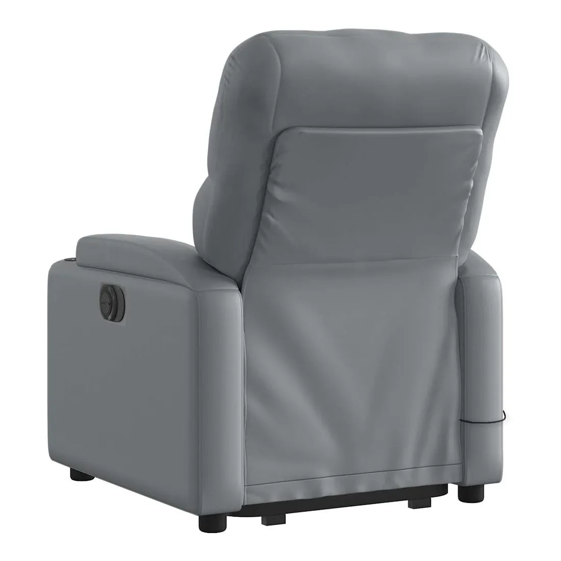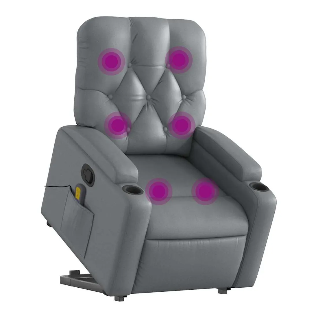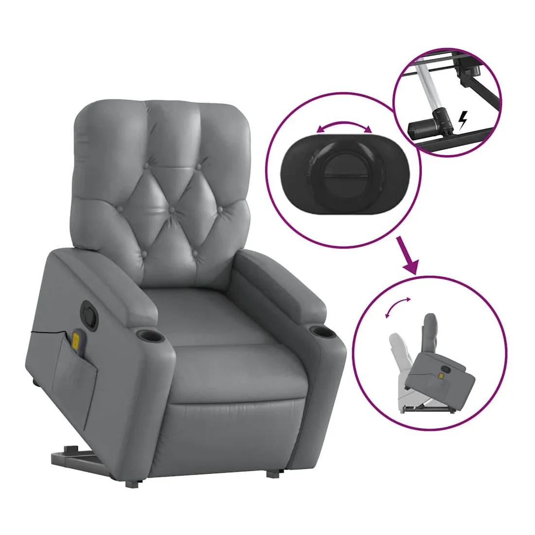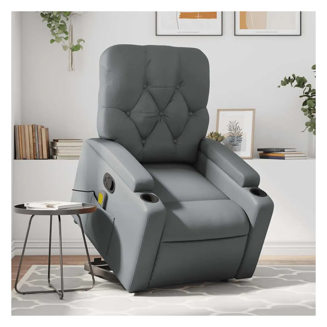 Asseyez-vous et détendez-vous dans ce fauteuil inclinable de massage très confortable ! Fonction de levage électrique : ce fauteuil inclinable pour personnes âgées est équipé d'un moteur électrique pour la fonction de levage. Grâce à la fonction qui pousse toute la chaise vers le haut, vous pouvez facilement vous tenir debout sans stresser votre dos et vos genoux en appuyant simplement sur le bouton.Fonction d'inclinaison manuelle : ce fauteuil inclinable est doté d'une poignée du côté droit. Vous pouvez régler manuellement le repose-pieds et le dossier dans n'importe quelle position selon votre confort en tirant simplement sur la poignée. Cette fonction permet une inclinaison maximale de 135 degrés. De plus, le dossier peut revenir rapidement à sa position d'origine en tirant simplement sur la poignée.Fonction de vibration : les 6 points de massage vous permettent de faire l'expérience d'un massage mieux ciblé. De plus, la télécommande incluse vous permet de choisir différents programmes de massage. La fonction de massage est alimentée par le connecteur USB qui nécessite une source d'alimentation USB certifiée de 5 V (non fournie).Expérience de siège confortable : le siège, le dossier et les larges accoudoirs rembourrés épais recouverts de similicuir procurent une sensation confortable, vous faisant vous sentir enlacé lorsque vous êtes assis. Le similicuir est un matériau très résistant. Il est résistant aux taches, ce qui le rend facile à nettoyer avec un chiffon humide. La surface lisse donne également un aspect luxueux et la beauté du cuir véritable.Poche latérale pratique : ce fauteuil est doté d'une poche latérale pour ranger votre télécommande ou garder vos objets essentiels à portée de main.Cadre solide et stable : le cadre en bois et en métal offre une structure solide et une grande stabilité. Ce fauteuil inclinable est confortable et durable.
