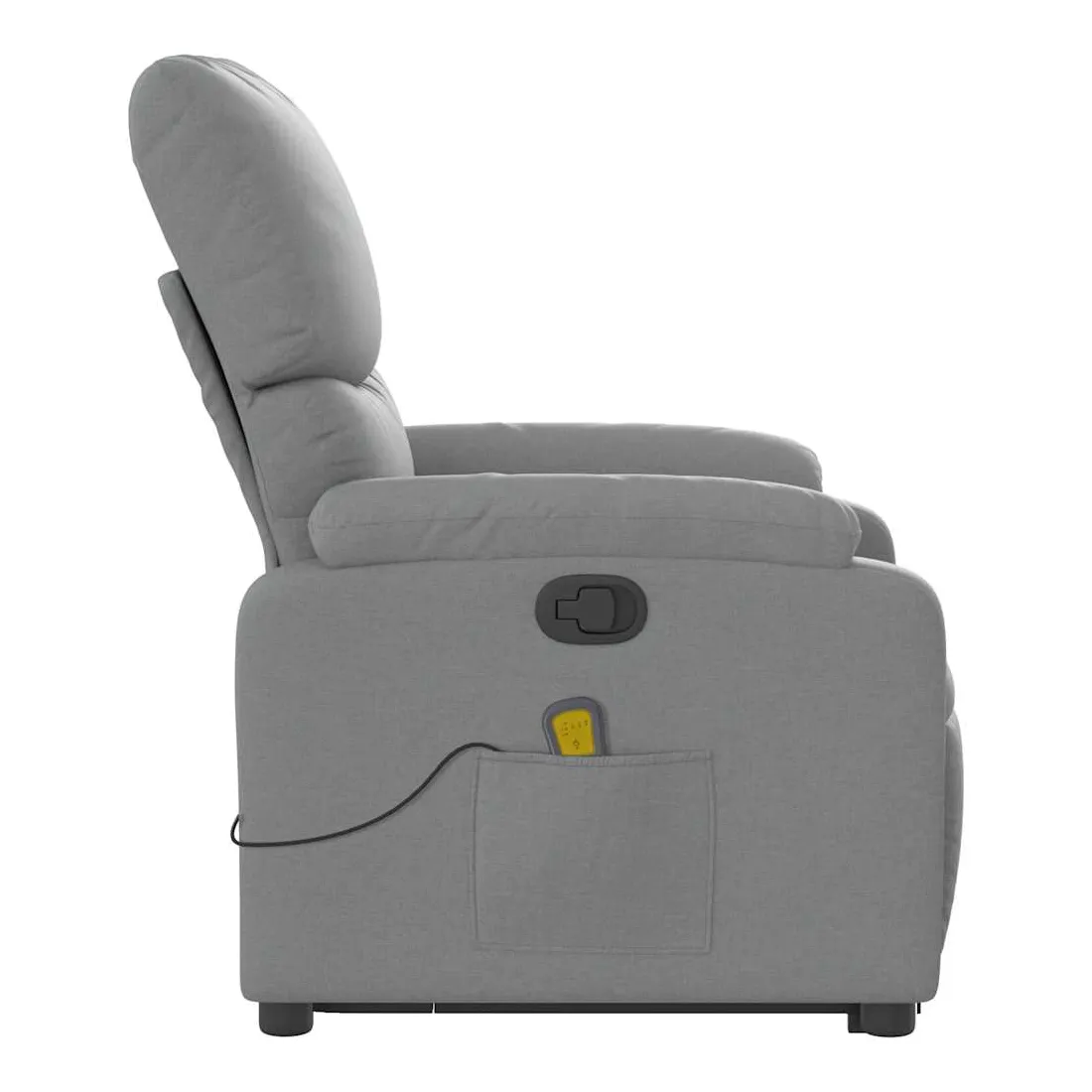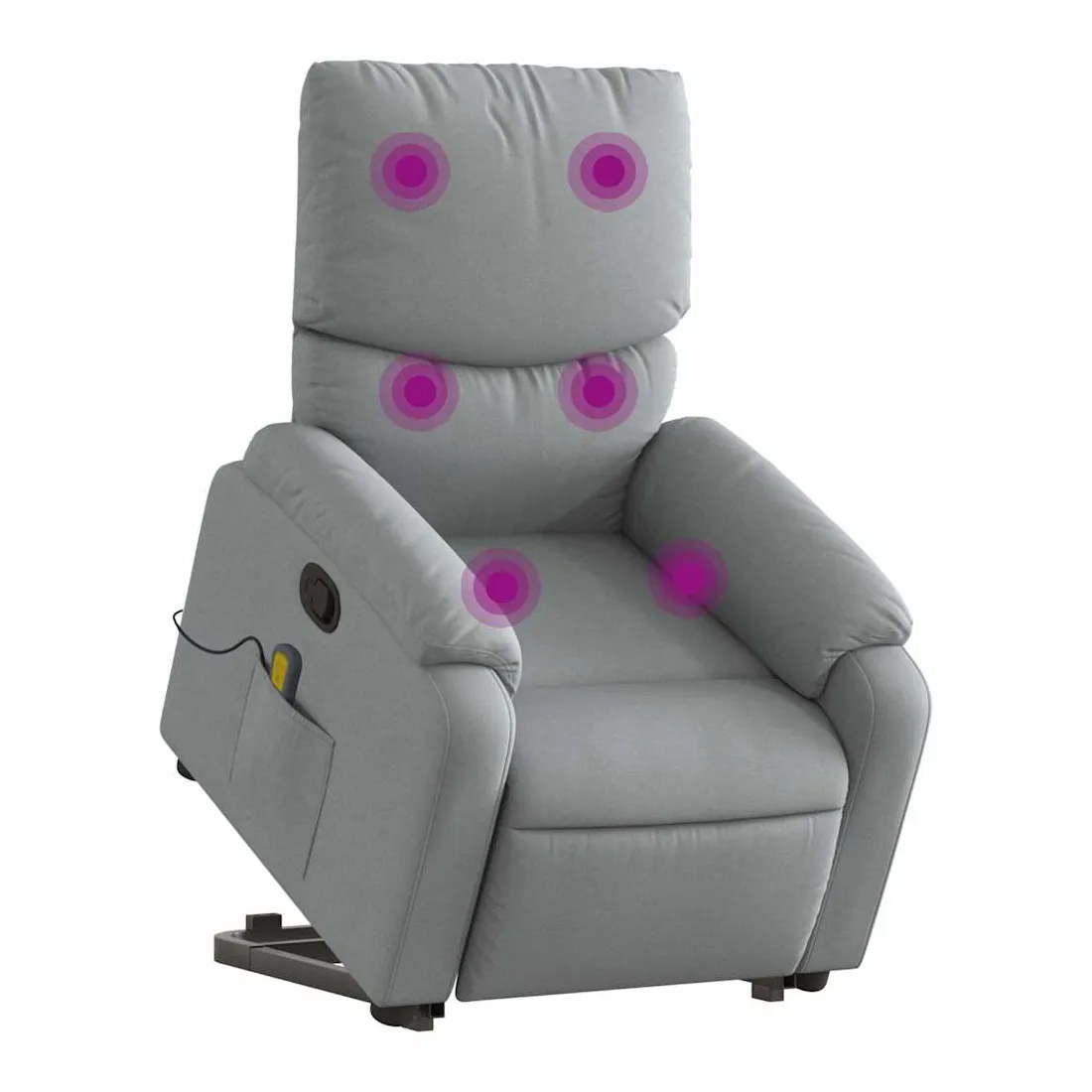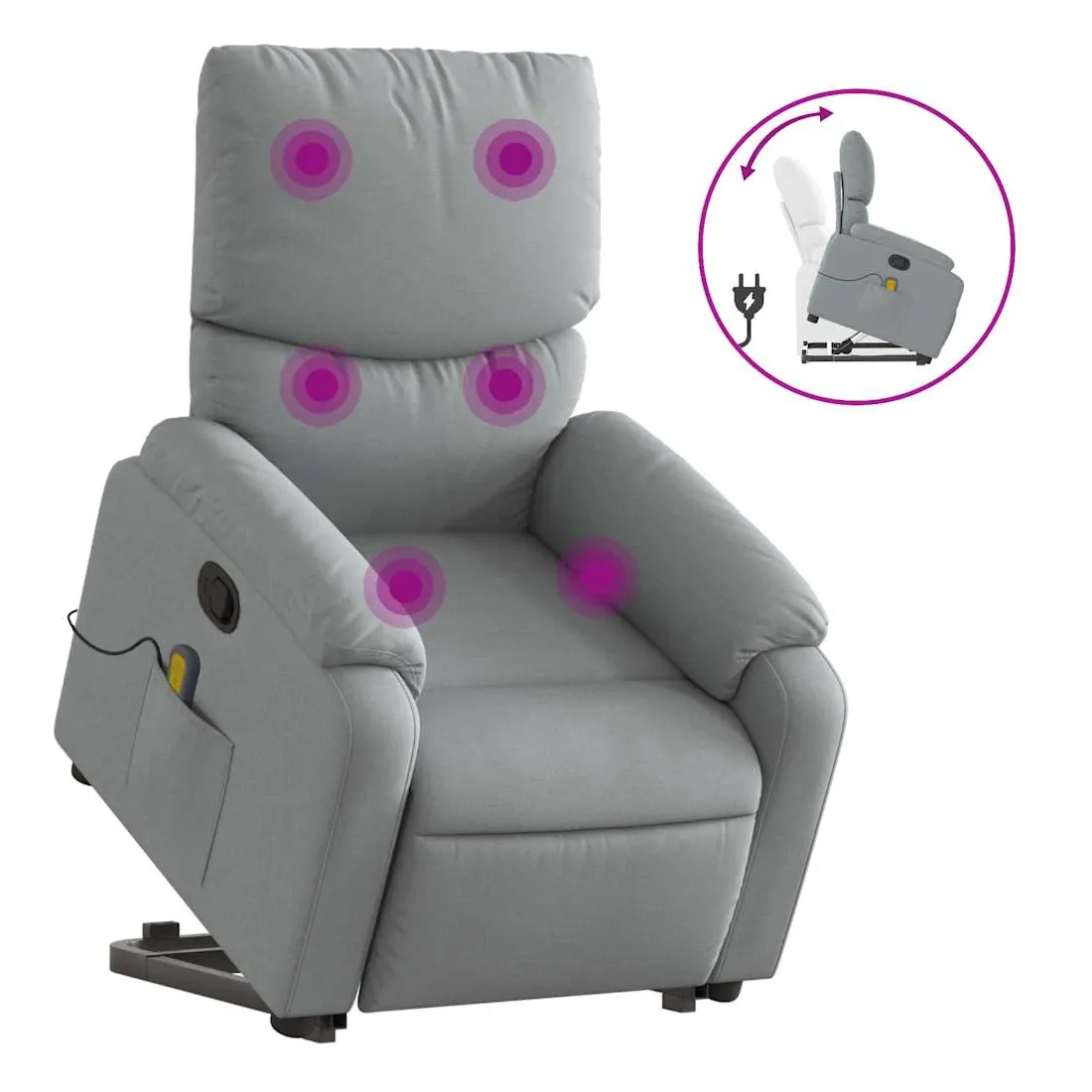 Asseyez-vous et détendez-vous dans ce fauteuil inclinable de massage très confortable ! Fonction de levage électrique : ce fauteuil inclinable pour personnes âgées est équipé d'un moteur électrique pour la fonction de levage. Grâce à la fonction qui pousse toute la chaise vers le haut, vous pouvez facilement vous tenir debout sans stresser votre dos et vos genoux en appuyant simplement sur le bouton.Fonction d'inclinaison manuelle : ce fauteuil inclinable est doté d'une poignée du côté droit. Vous pouvez régler manuellement le repose-pieds et le dossier dans n'importe quelle position selon votre confort en tirant simplement sur la poignée. Cette fonction permet une inclinaison maximale de 135 degrés. De plus, le dossier peut revenir rapidement à sa position d'origine en tirant simplement sur la poignée.Fonction de vibration : les 6 points de massage vous permettent de faire l'expérience d'un massage mieux ciblé. De plus, la télécommande incluse vous permet de choisir différents programmes de massage. La fonction de massage est alimentée par le connecteur USB qui nécessite une source d'alimentation USB certifiée de 5 V (non fournie).Expérience d'assise confortable : le siège, le dossier et les larges accoudoirs bien rembourrés recouverts de tissu procurent une sensation confortable et chaleureuse, vous permettant de vous sentir enveloppé lorsque vous êtes assis. Le tissu présente un aspect simple et épuré et est respirant et durable.Poche latérale pratique : ce fauteuil est doté d'une poche latérale pour ranger votre télécommande ou garder vos objets essentiels à portée de main.Cadre solide et stable : le cadre en bois et en métal offre une structure solide et une grande stabilité. Ce fauteuil inclinable est confortable et durable.