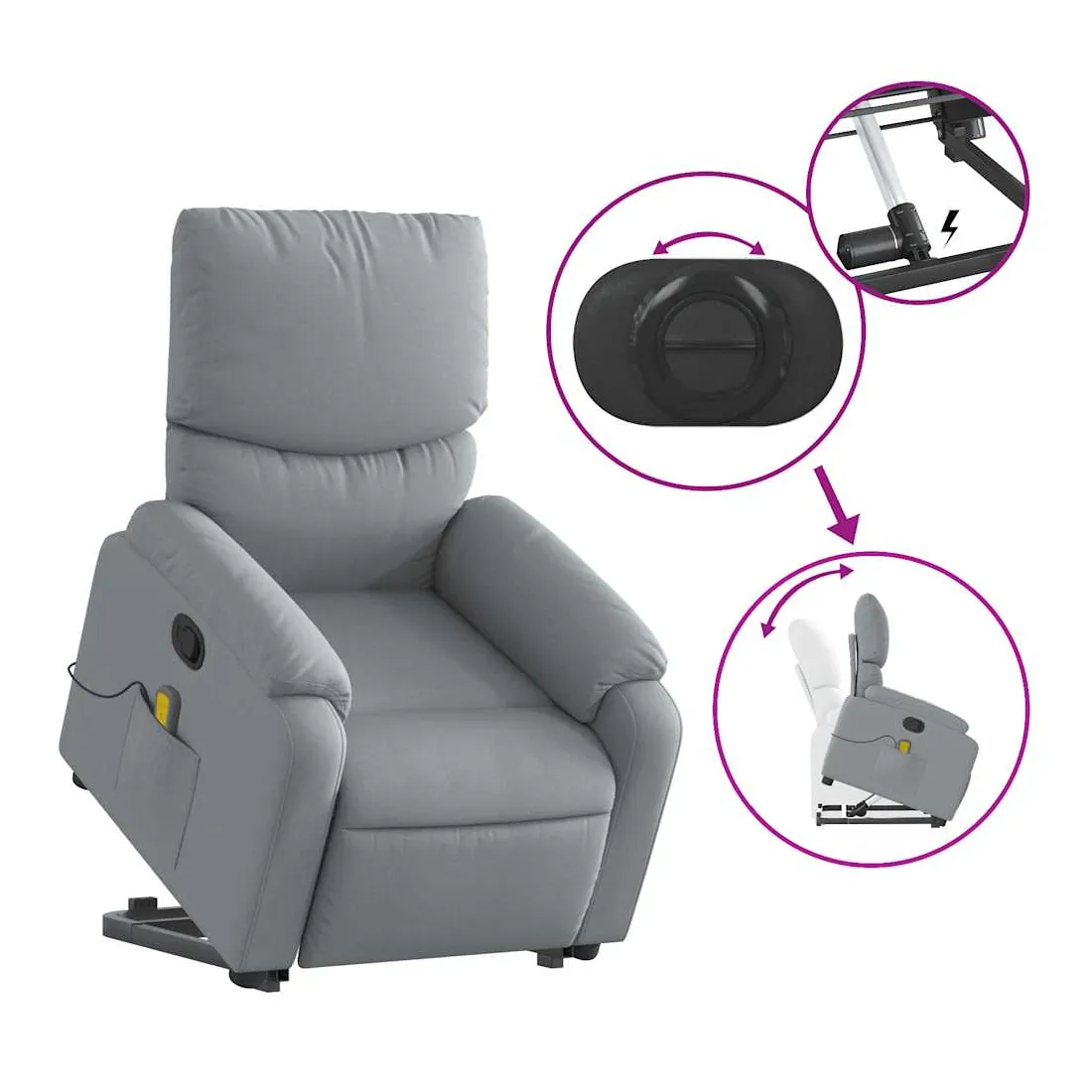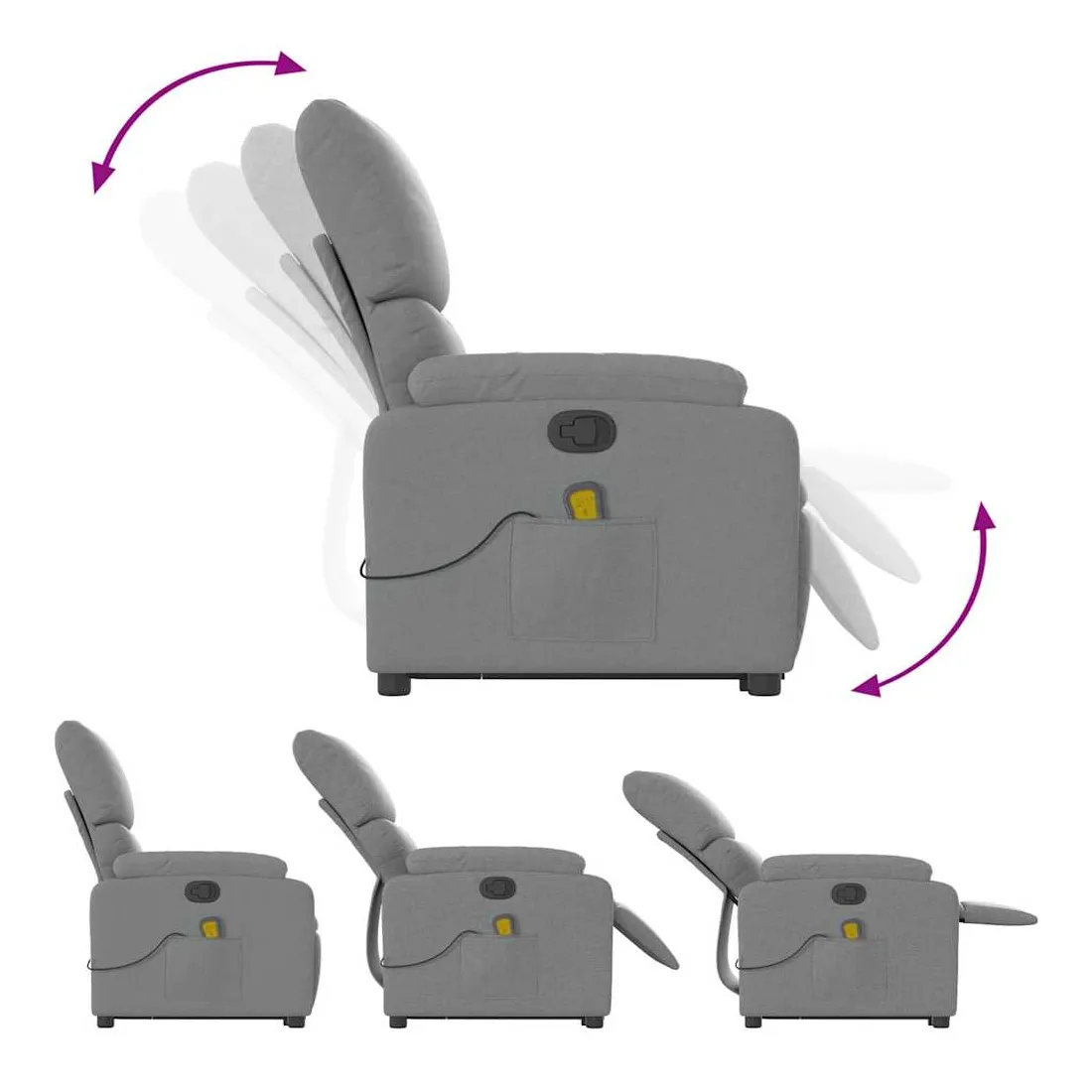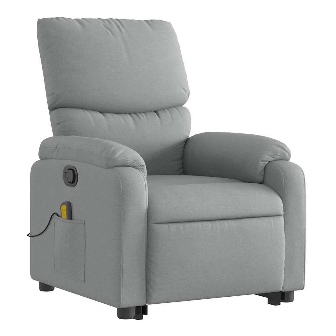 Asseyez-vous et détendez-vous dans ce fauteuil inclinable de massage très confortable ! Fonction de levage électrique : ce fauteuil inclinable pour personnes âgées est équipé d'un moteur électrique pour la fonction de levage. Grâce à la fonction qui pousse toute la chaise vers le haut, vous pouvez facilement vous tenir debout sans stresser votre dos et vos genoux en appuyant simplement sur le bouton.Fonction d'inclinaison manuelle : ce fauteuil inclinable est doté d'une poignée du côté droit. Vous pouvez régler manuellement le repose-pieds et le dossier dans n'importe quelle position selon votre confort en tirant simplement sur la poignée. Cette fonction permet une inclinaison maximale de 135 degrés. De plus, le dossier peut revenir rapidement à sa position d'origine en tirant simplement sur la poignée.Fonction de vibration : les 6 points de massage vous permettent de faire l'expérience d'un massage mieux ciblé. De plus, la télécommande incluse vous permet de choisir différents programmes de massage. La fonction de massage est alimentée par le connecteur USB qui nécessite une source d'alimentation USB certifiée de 5 V (non fournie).Expérience d'assise confortable : le siège, le dossier et les larges accoudoirs bien rembourrés recouverts de tissu procurent une sensation confortable et chaleureuse, vous permettant de vous sentir enveloppé lorsque vous êtes assis. Le tissu présente un aspect simple et épuré et est respirant et durable.Poche latérale pratique : ce fauteuil est doté d'une poche latérale pour ranger votre télécommande ou garder vos objets essentiels à portée de main.Cadre solide et stable : le cadre en bois et en métal offre une structure solide et une grande stabilité. Ce fauteuil inclinable est confortable et durable.