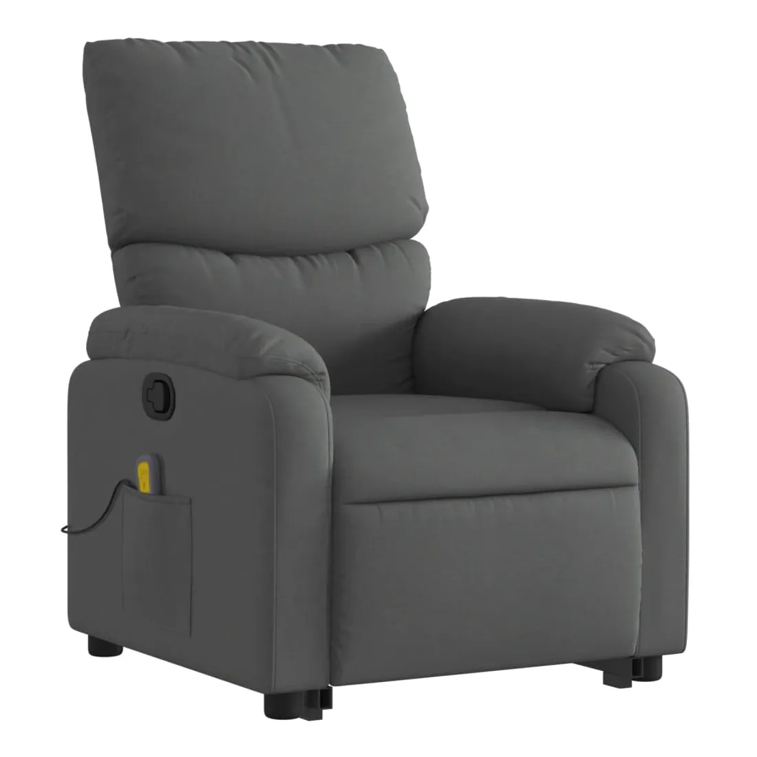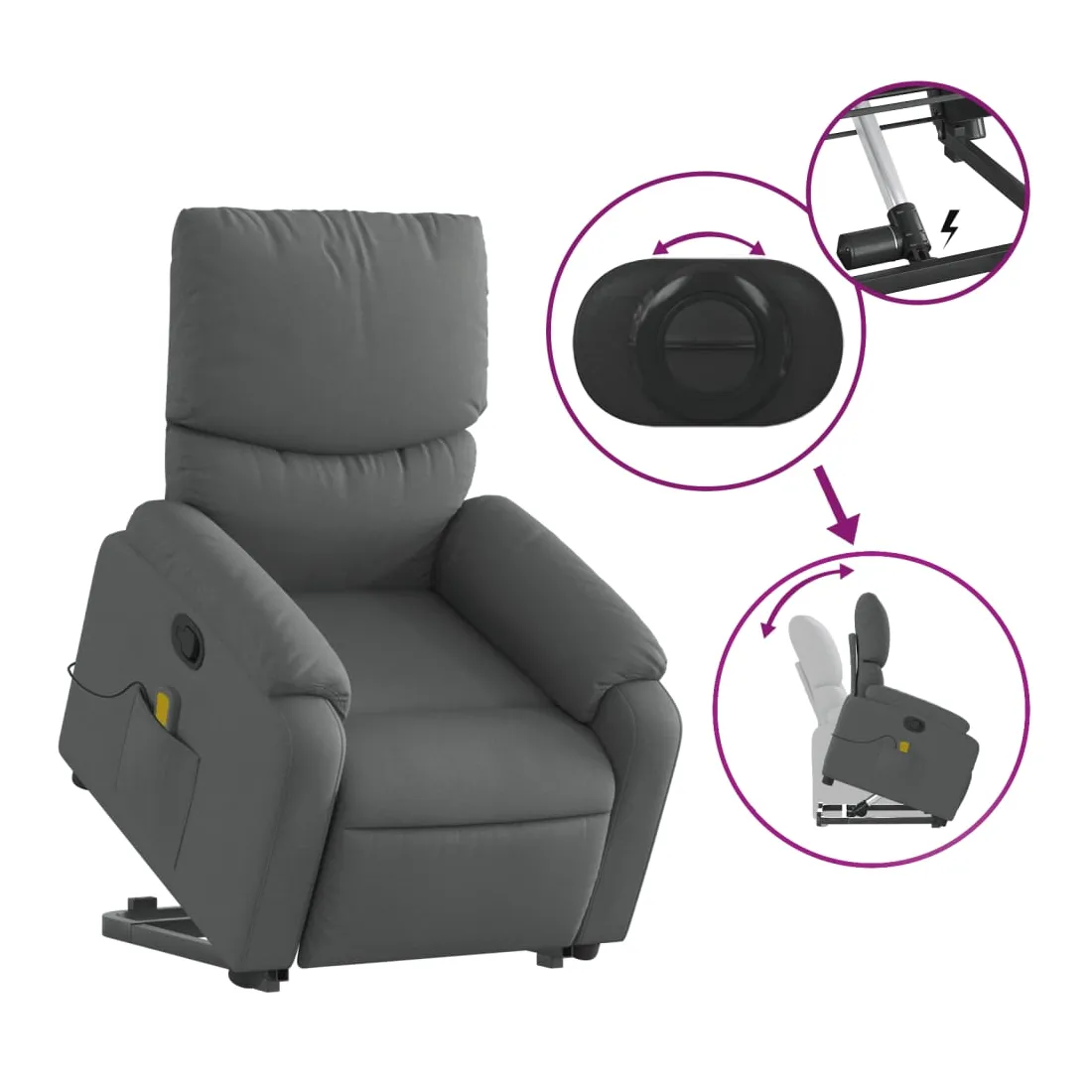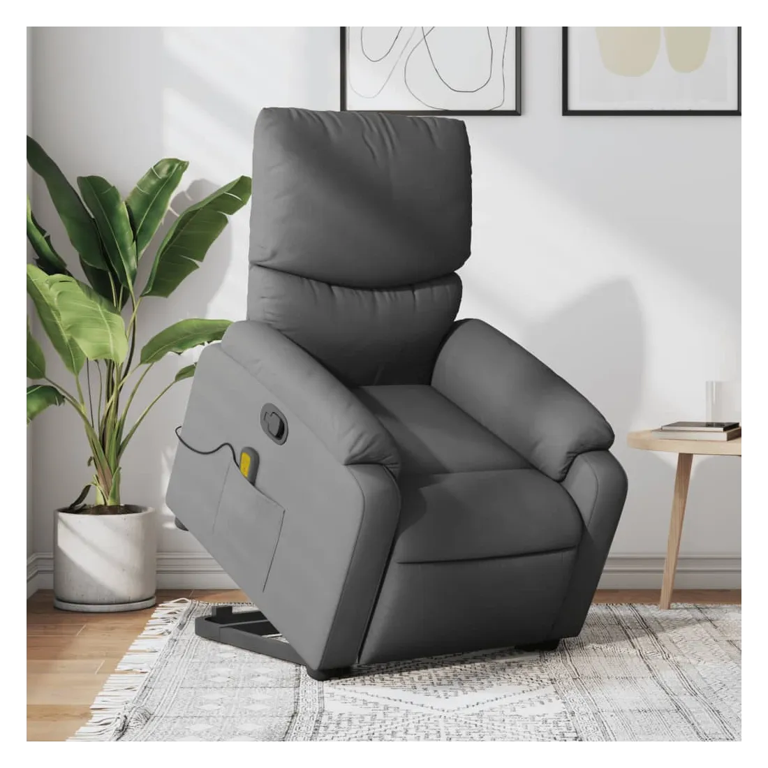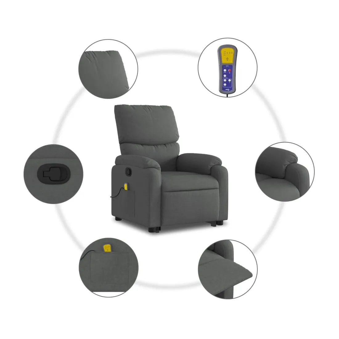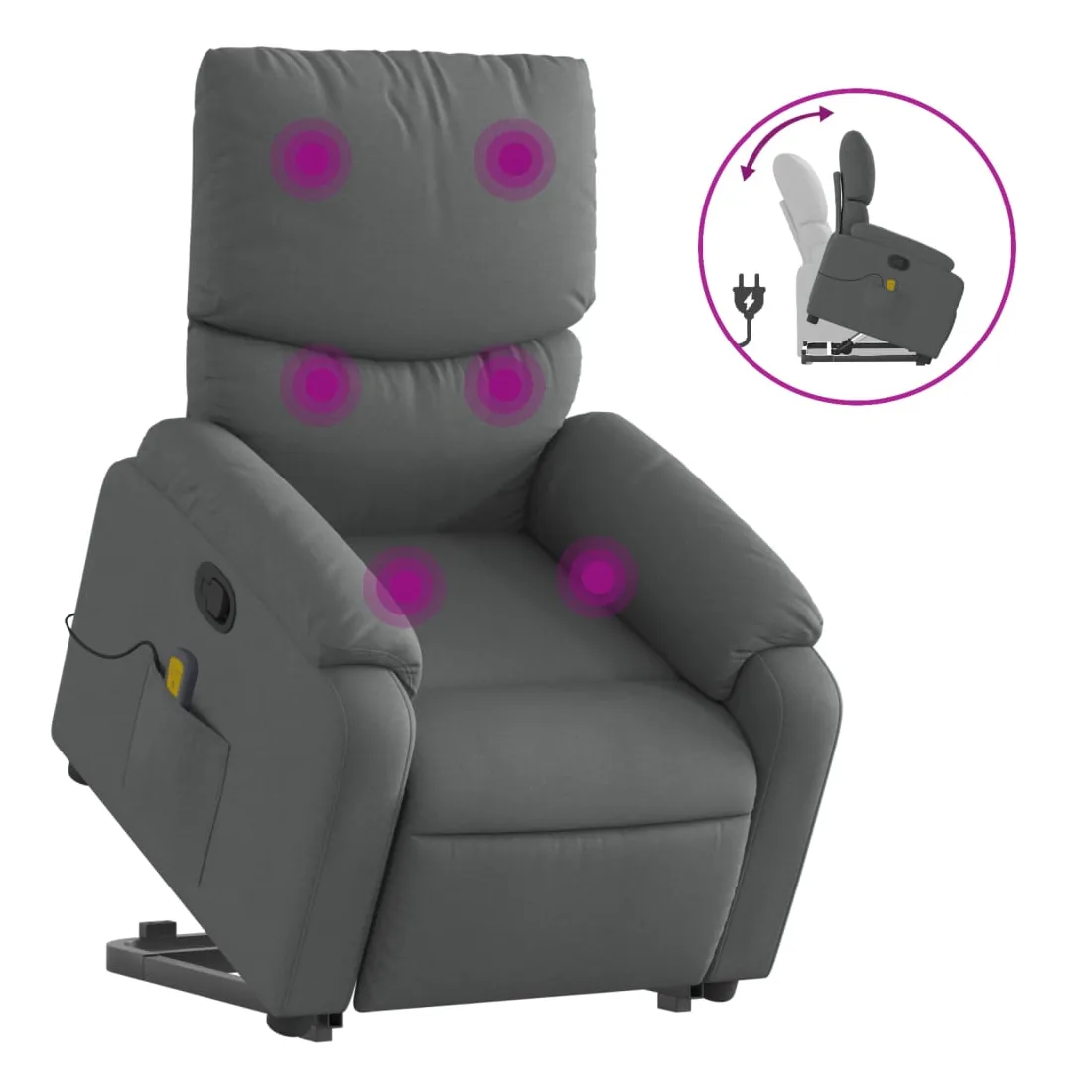 Asseyez-vous et détendez-vous dans ce fauteuil inclinable de massage très confortable ! Fonction de levage électrique : ce fauteuil inclinable pour personnes âgées est équipé d'un moteur électrique pour la fonction de levage. Grâce à la fonction qui pousse toute la chaise vers le haut, vous pouvez facilement vous tenir debout sans stresser votre dos et vos genoux en appuyant simplement sur le bouton.Fonction d'inclinaison manuelle : ce fauteuil inclinable est doté d'une poignée du côté droit. Vous pouvez régler manuellement le repose-pieds et le dossier dans n'importe quelle position selon votre confort en tirant simplement sur la poignée. Cette fonction permet une inclinaison maximale de 135 degrés. De plus, le dossier peut revenir rapidement à sa position d'origine en tirant simplement sur la poignée.Fonction de vibration : les 6 points de massage vous permettent de faire l'expérience d'un massage mieux ciblé. De plus, la télécommande incluse vous permet de choisir différents programmes de massage. La fonction de massage est alimentée par le connecteur USB qui nécessite une source d'alimentation USB certifiée de 5 V (non fournie).Expérience d'assise confortable : le siège, le dossier et les larges accoudoirs bien rembourrés recouverts de tissu procurent une sensation confortable et chaleureuse, vous permettant de vous sentir enveloppé lorsque vous êtes assis. Le tissu présente un aspect simple et épuré et est respirant et durable.Poche latérale pratique : ce fauteuil est doté d'une poche latérale pour ranger votre télécommande ou garder vos objets essentiels à portée de main.Cadre solide et stable : le cadre en bois et en métal offre une structure solide et une grande stabilité. Ce fauteuil inclinable est confortable et durable.